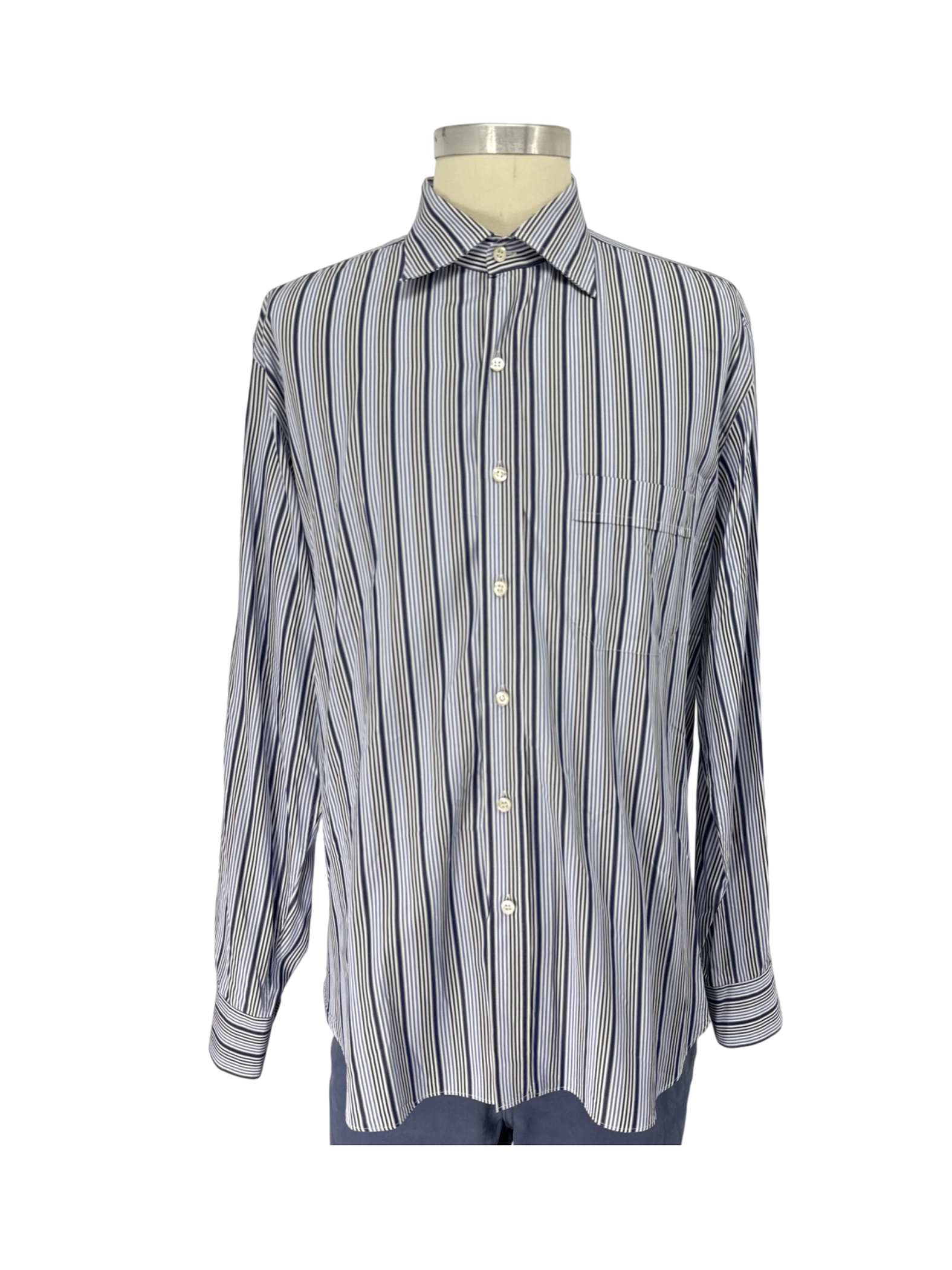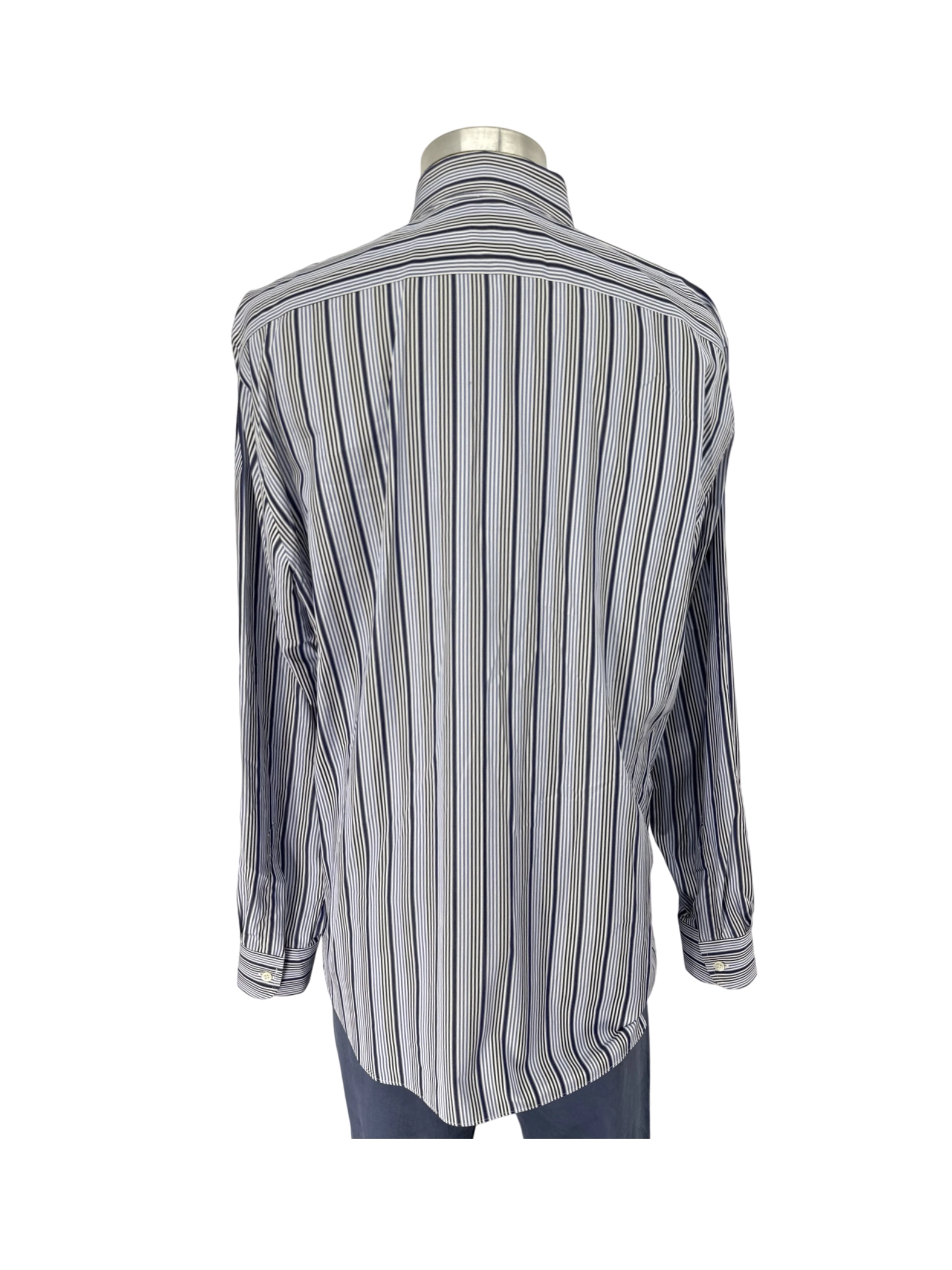 Elevate your wardrobe with this Barneys New York striped long-sleeve shirt. Crafted from 100% cotton, this pre-owned shirt combines comfort and style. Featuring a classic collar and button-up closure, it's perfect for both casual and semi-formal occasions. The vertical striped pattern in shades of blue, white and gray adds a touch of sophistication. Made in Italy, this shirt is a timeless addition to any man's closet.