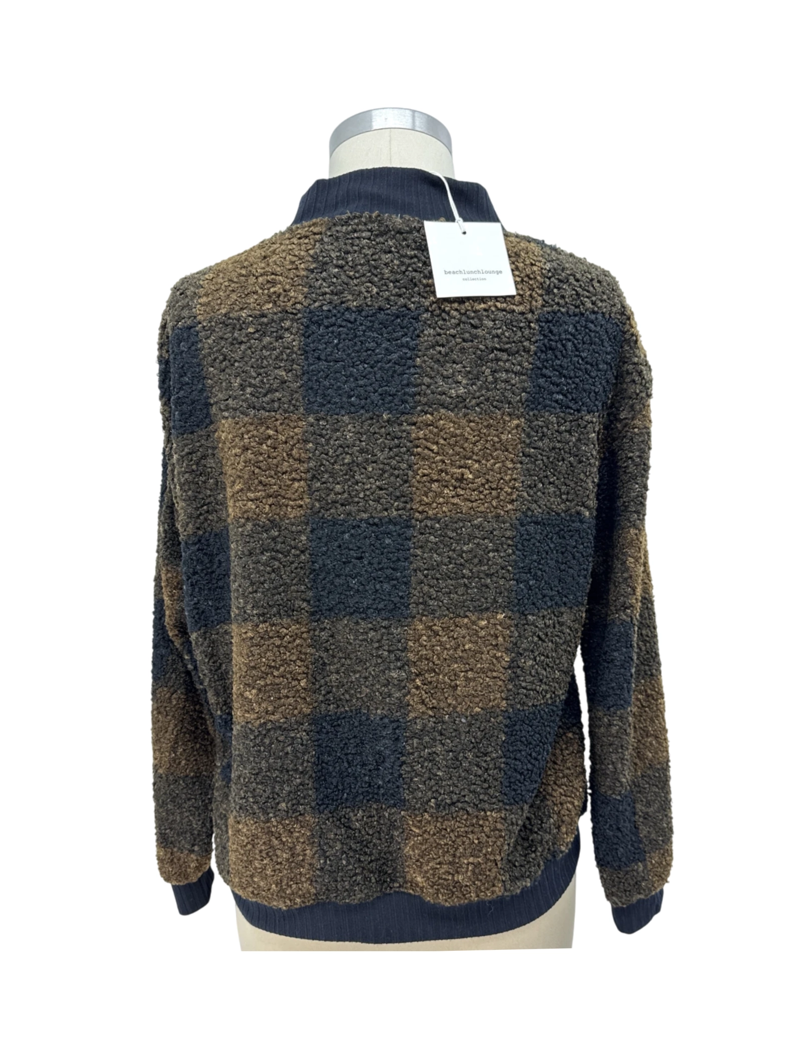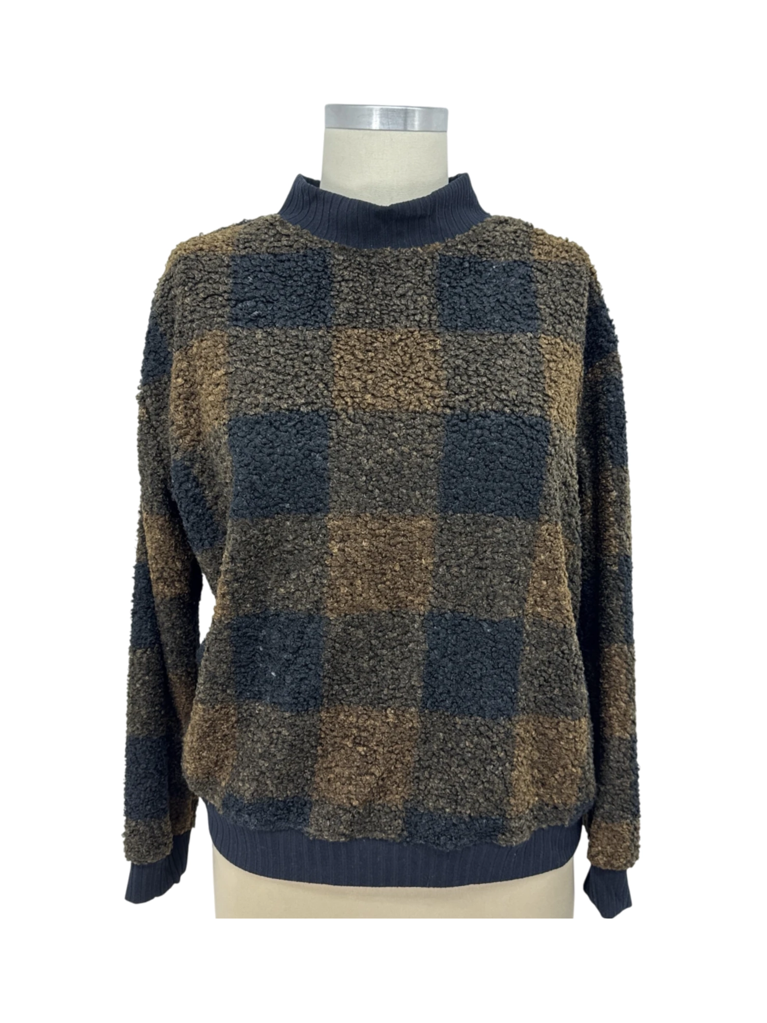 Elevate your fall and winter wardrobe with this cozy beachlunchlounge sweater. Featuring a stylish plaid pattern in shades of brown and black, this pullover boasts a comfortable turtleneck and long sleeves. Made from a soft blend of polyester and spandex, this pre-owned sweater offers both warmth and style. Perfect for casual outings or layering, this sweater is a must-have addition to your collection. Embrace the season with this chic and versatile piece. Comfortable, stylish and ready to wear.