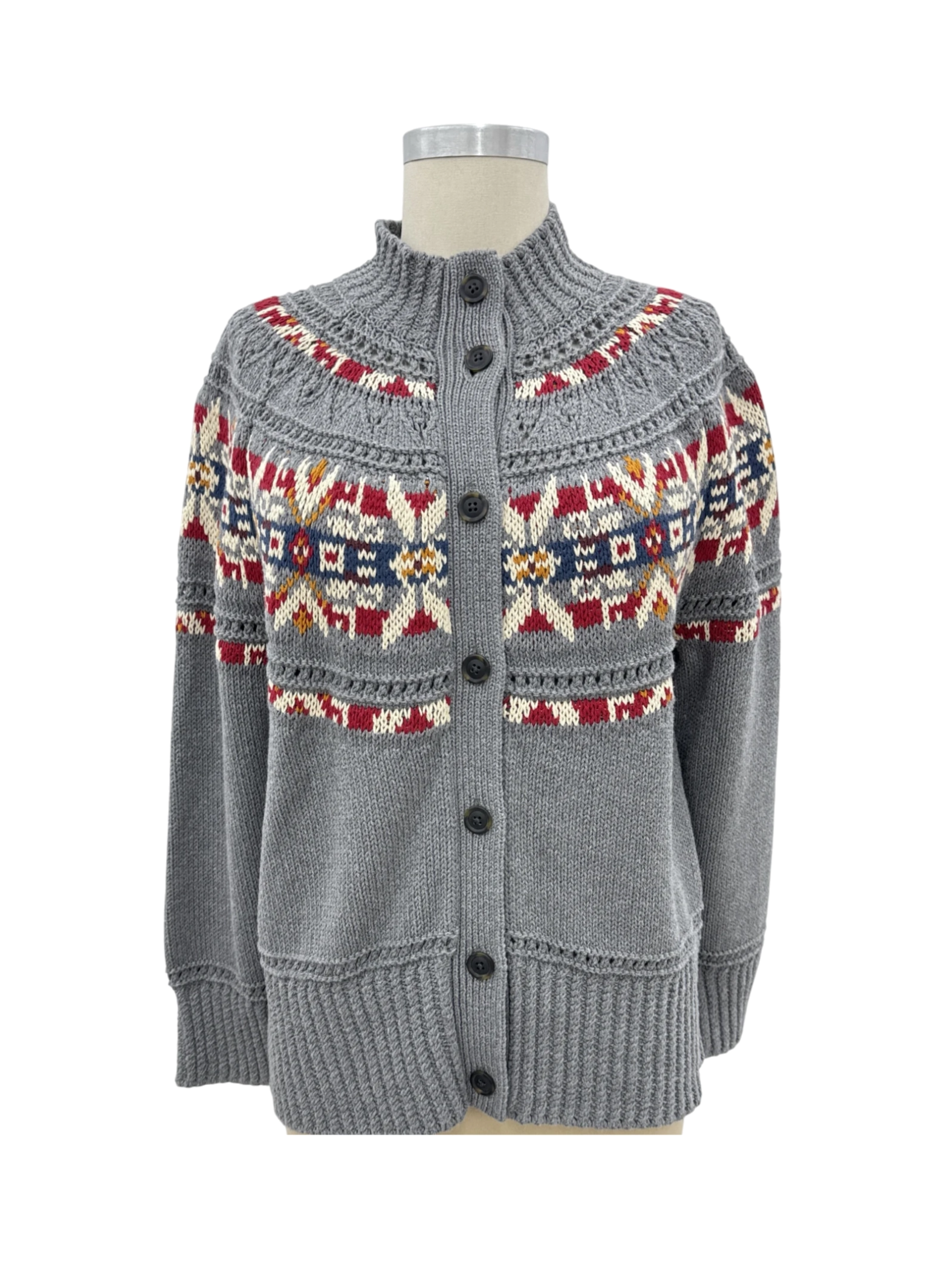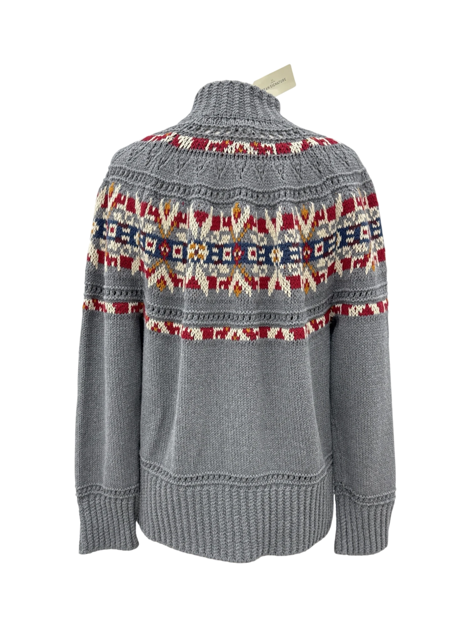Embrace the cozy charm with this pre-loved Bean Signature sweater, a perfect blend of style and comfort. This button-up cardigan is adorned with a captivating multicolor pattern, adding a touch of flair to your wardrobe. Crafted from 100% cotton, it promises warmth and softness, making it an ideal choice for the fall and winter seasons. The turtleneck adds an extra layer of snugness. This sweater is a timeless piece and a sustainable fashion.