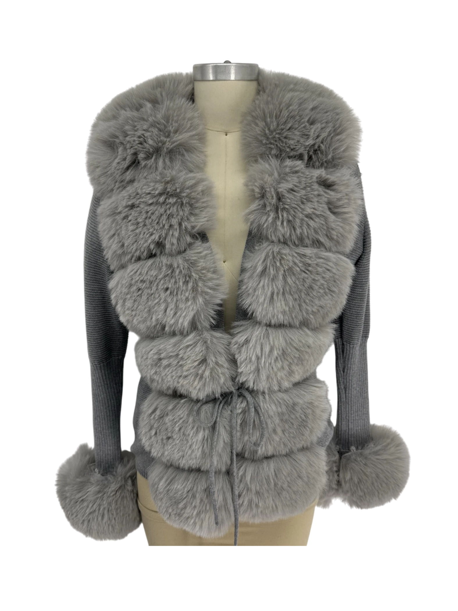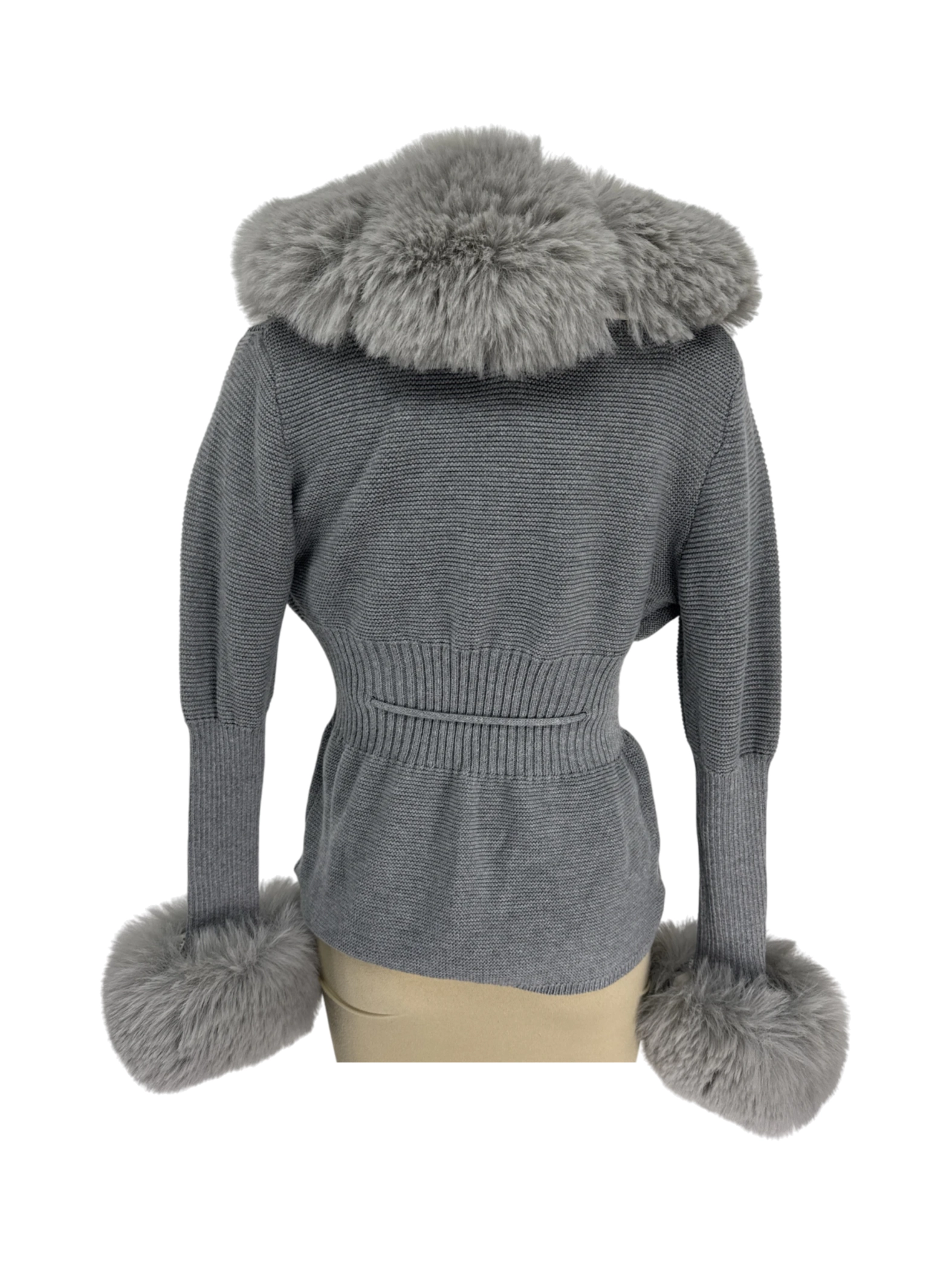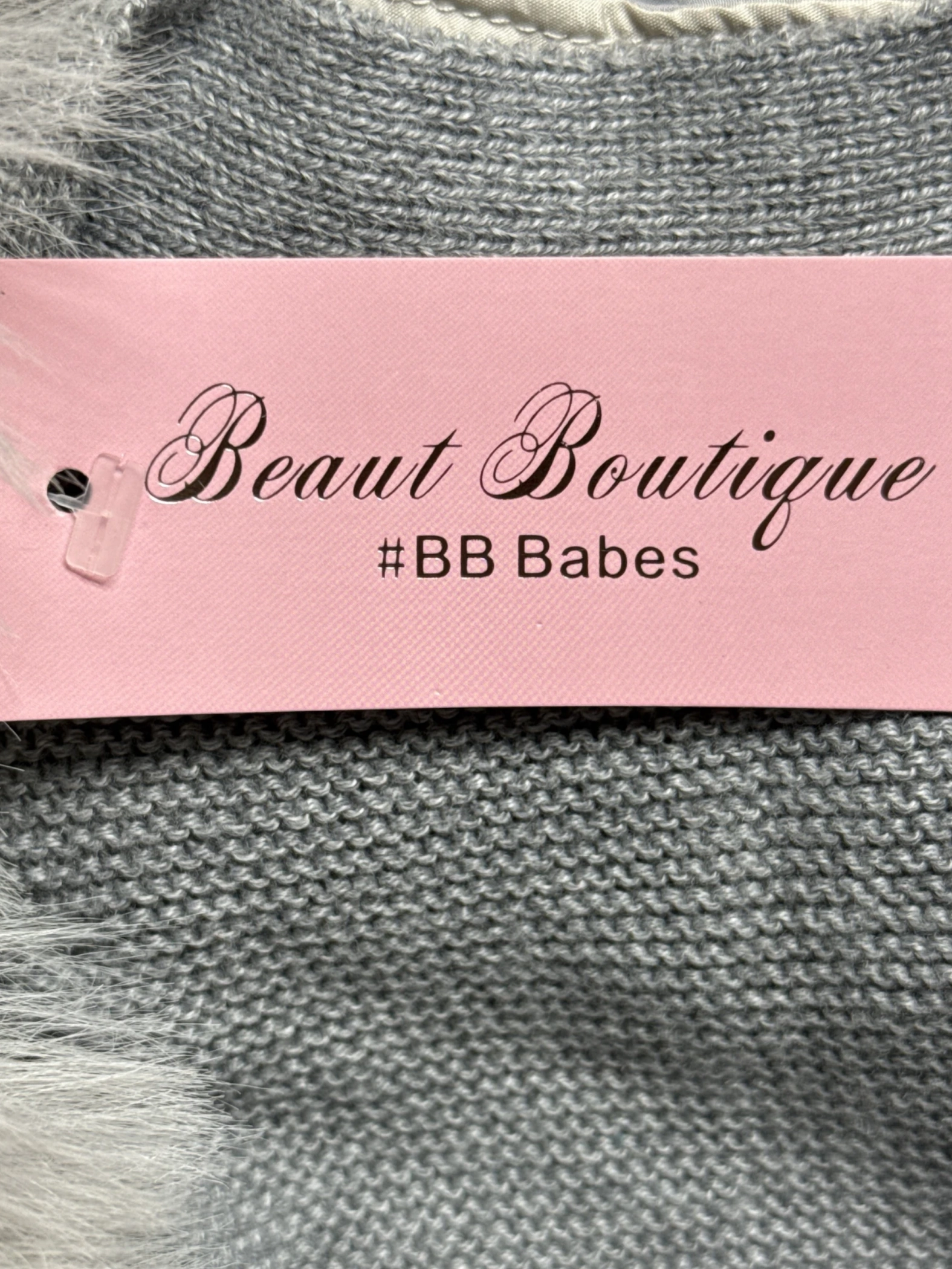 Elevate your outerwear game with this chic pre-owned Beaut Boutique cardigan. This statement piece features a luxurious gray faux fur trim, and an open front design, perfect for adding a touch of glamour to any outfit. The cozy sweater is ideal for layering during the fall and winter seasons. This cardigan is in excellent condition and ready to make a bold fashion statement.