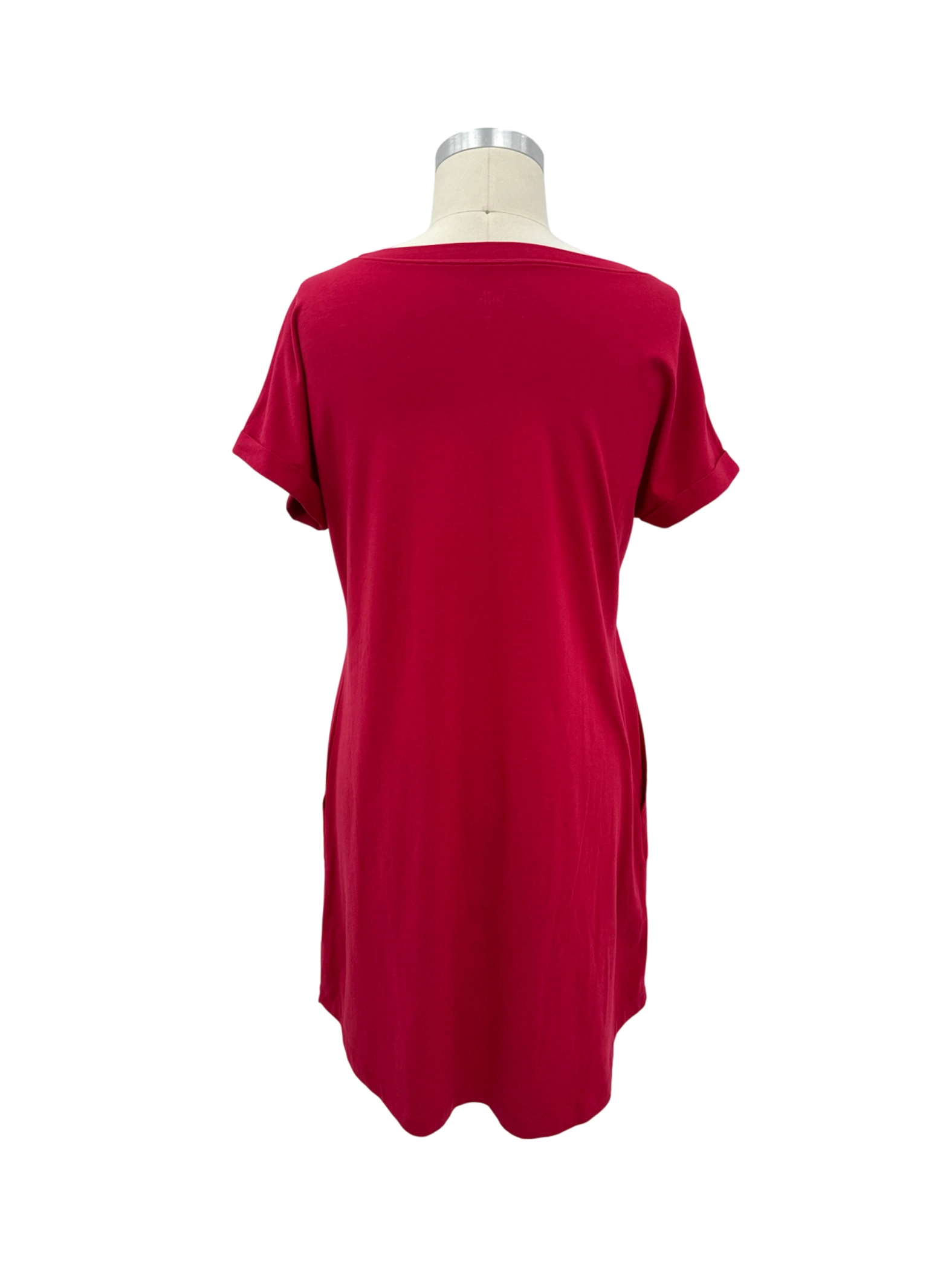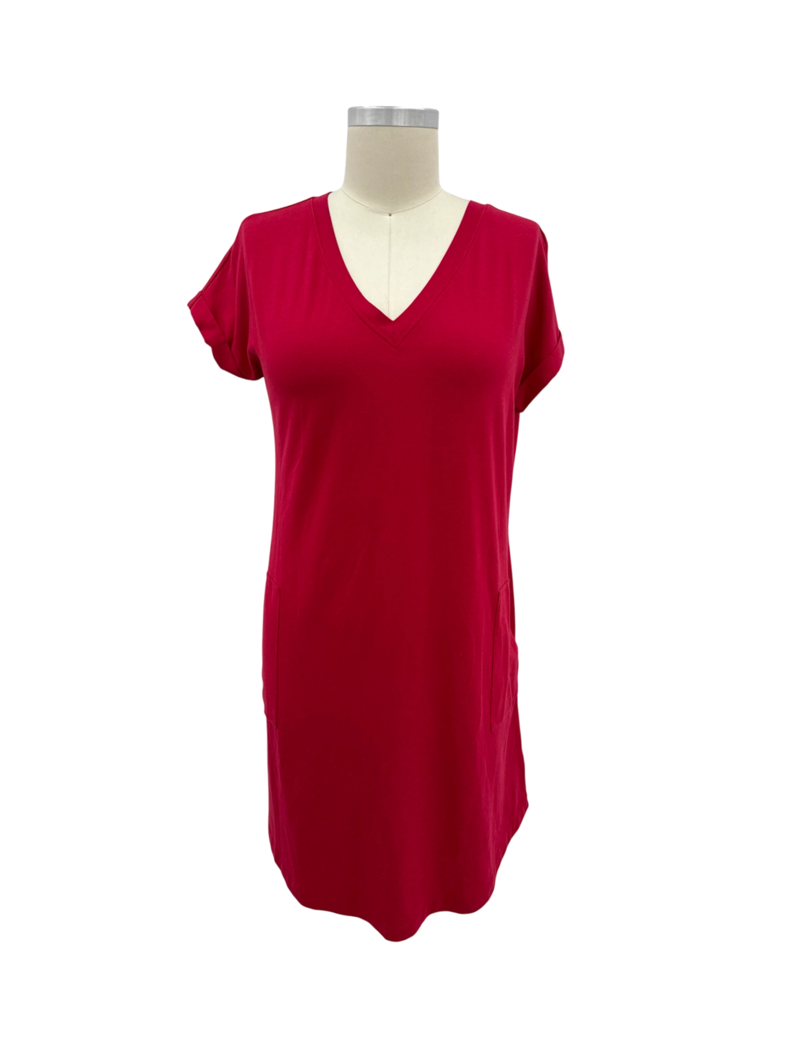 This used Belle dress in a vibrant red hue is a perfect addition to your summer wardrobe. Its flattering A-line silhouette and comfortable cotton blend make it ideal for casual outings. This dress features a classic V-neck, short sleeves, and handy pockets. Perfect for a relaxed yet stylish look. Its lightweight fabric ensures comfort in warmer weather, making it an everyday essential.