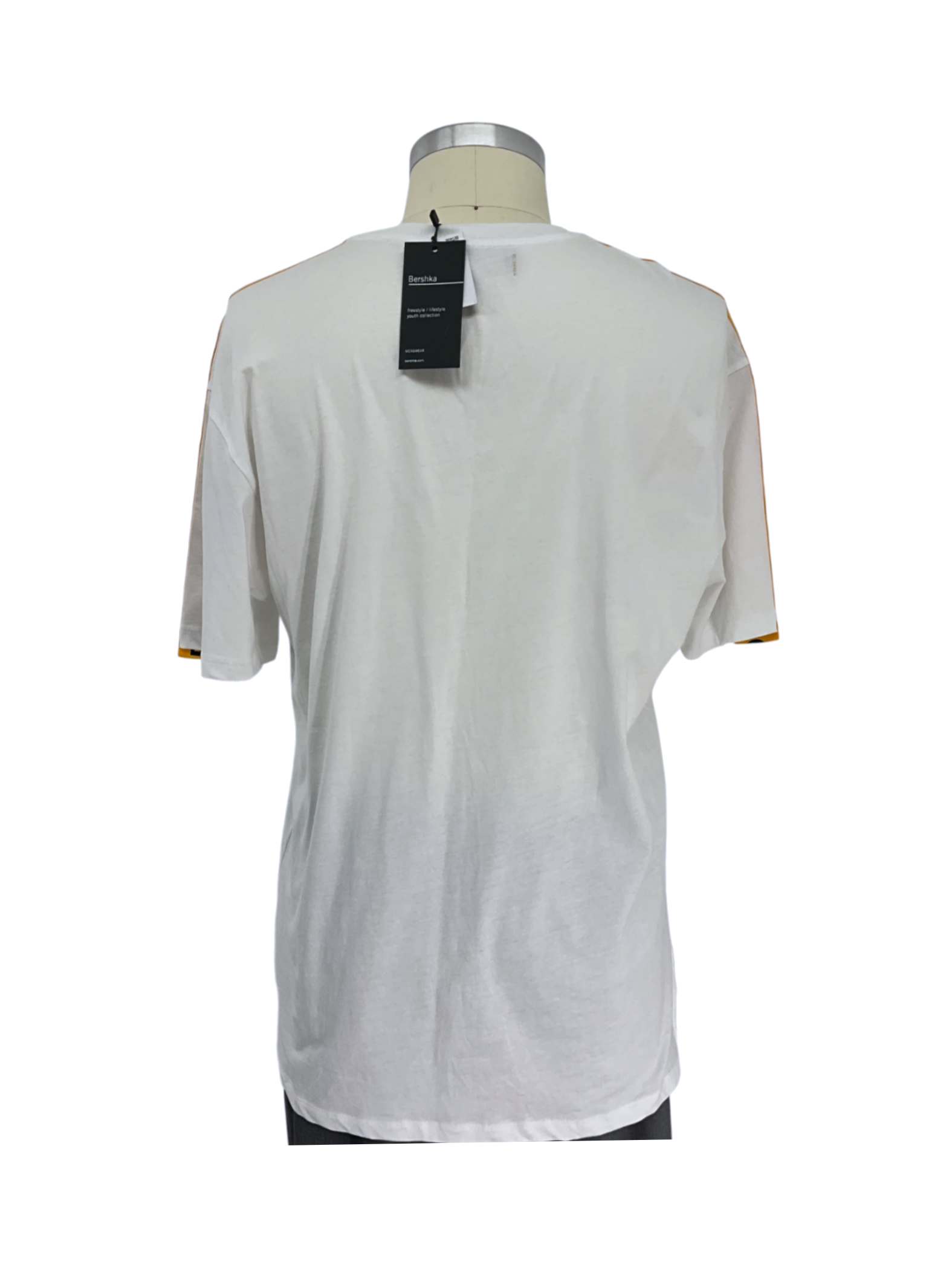 A white short-sleeved t-shirt with yellow and black stripes running down the arms that feature the word warning
