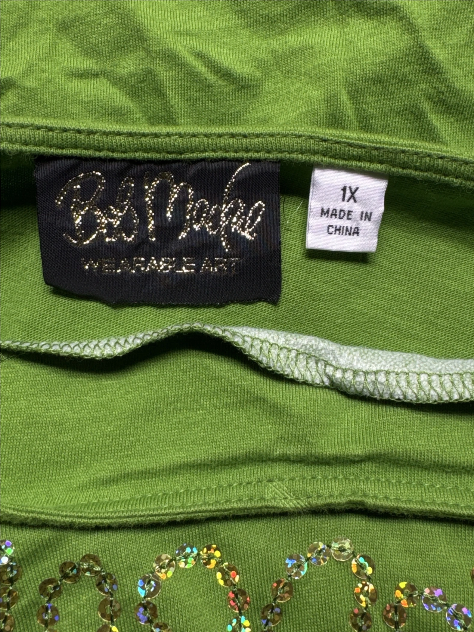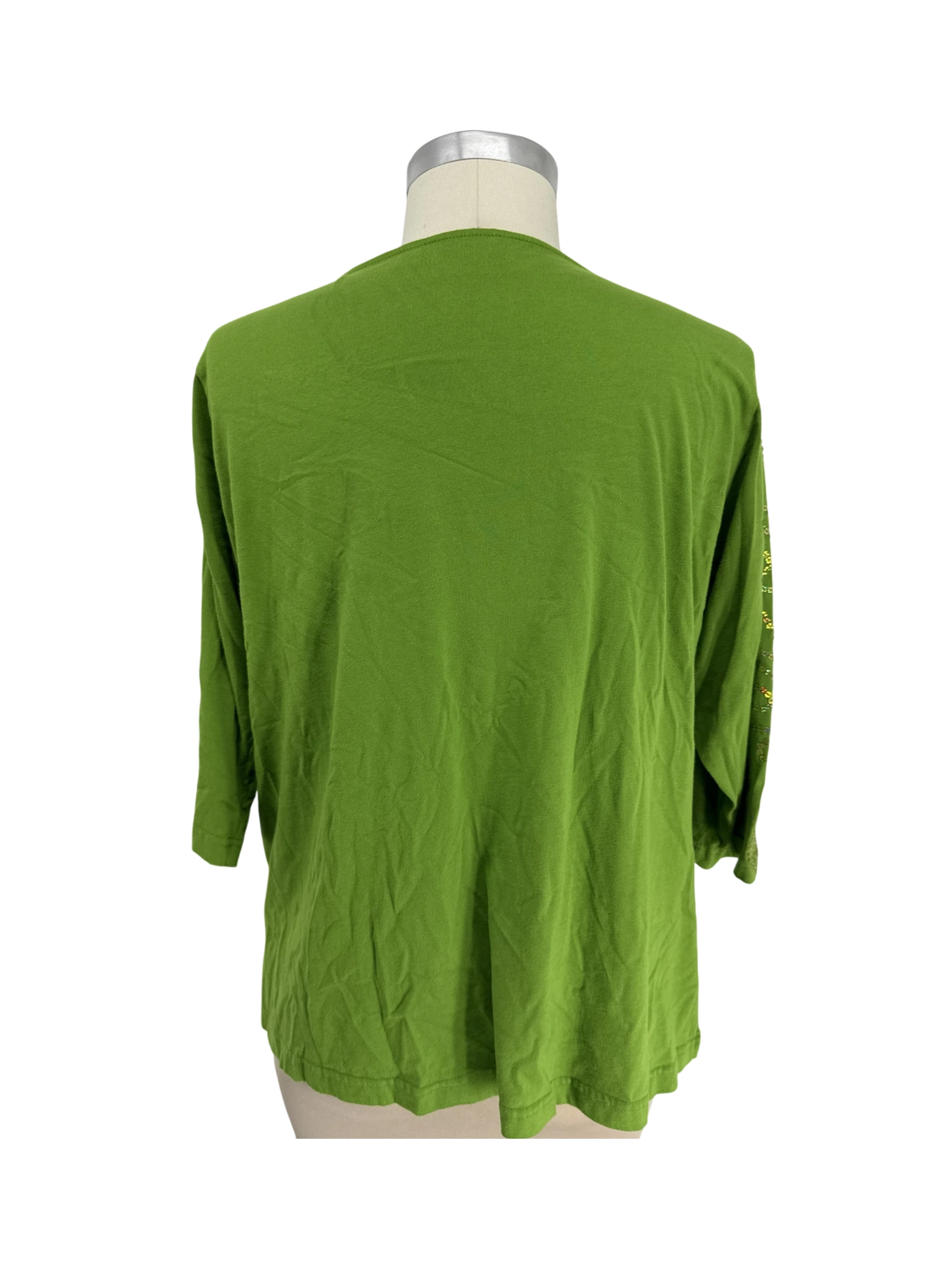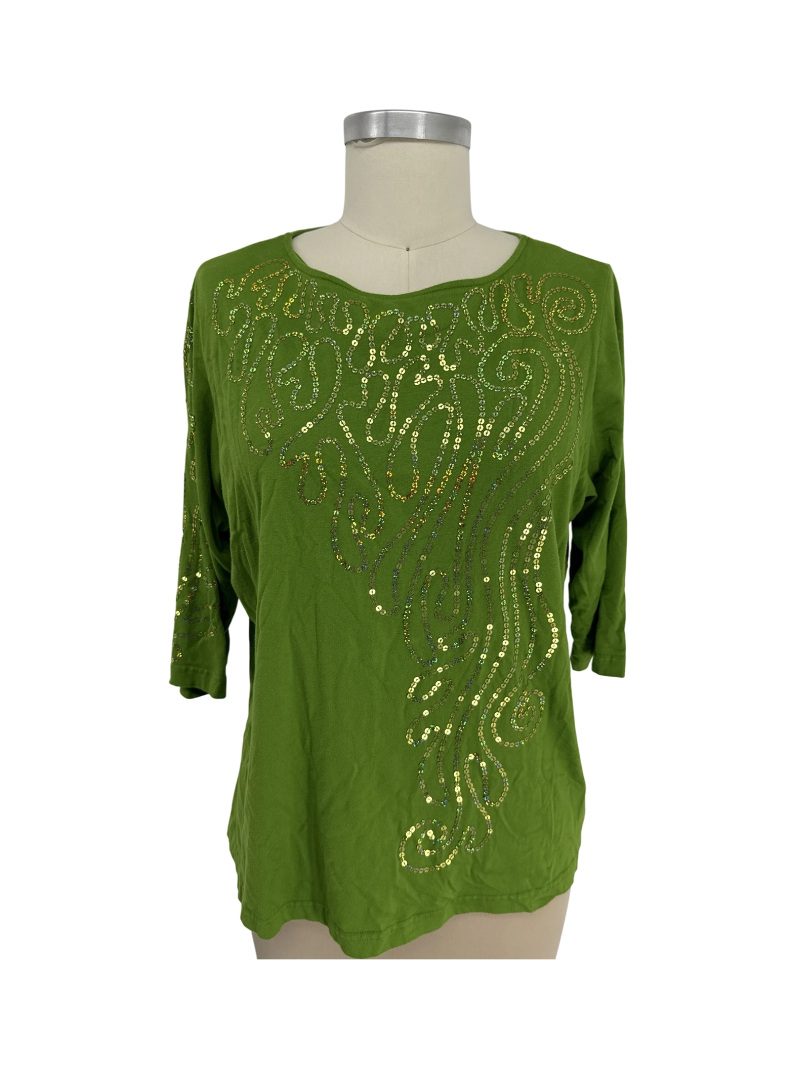 This pre-owned Best Mode Wearable Art top is a vibrant addition to any wardrobe. It's made from comfortable 100% cotton, perfect for warmer seasons, with a flattering round neckline and ¾ sleeves. Adorned with eye-catching sequin details, this top offers a touch of sparkle. It's ideal for those looking for a unique, stylish piece to add to their collection. The top is in excellent condition, ready for its next adventure!