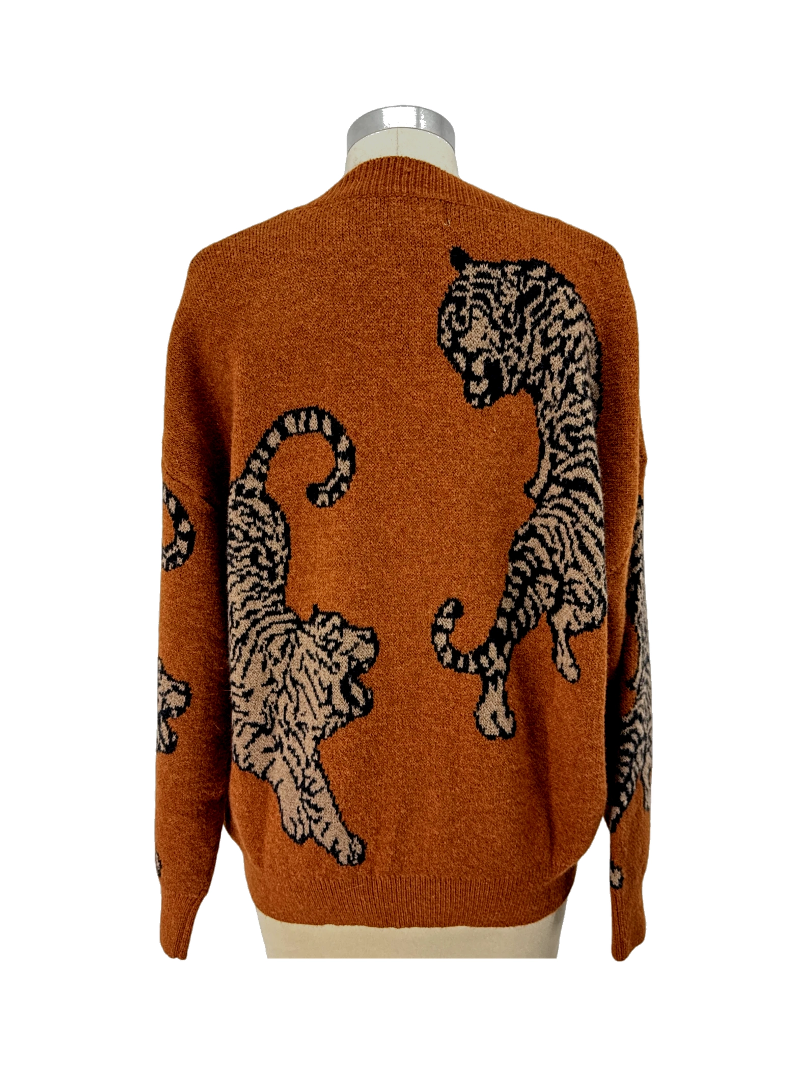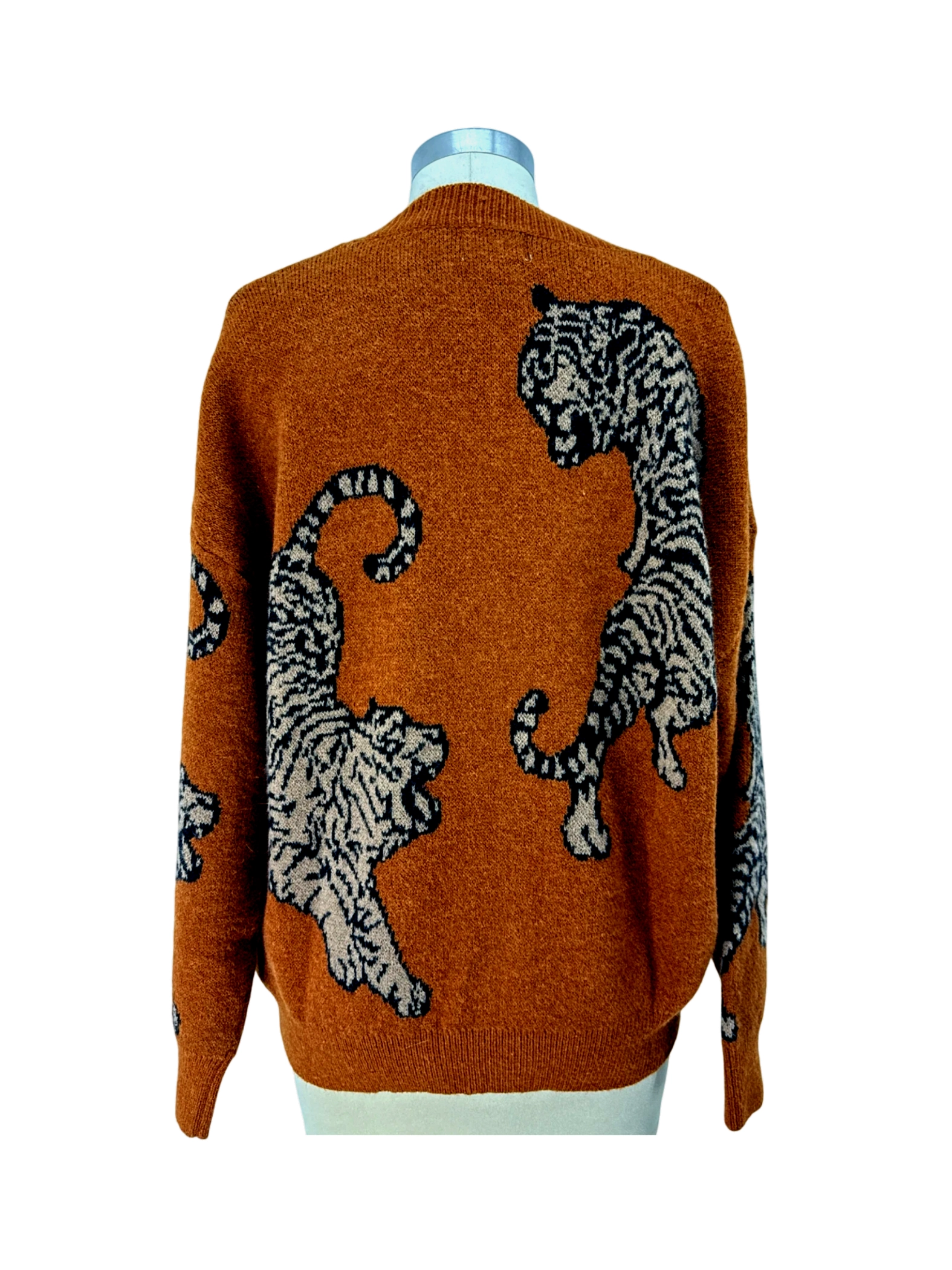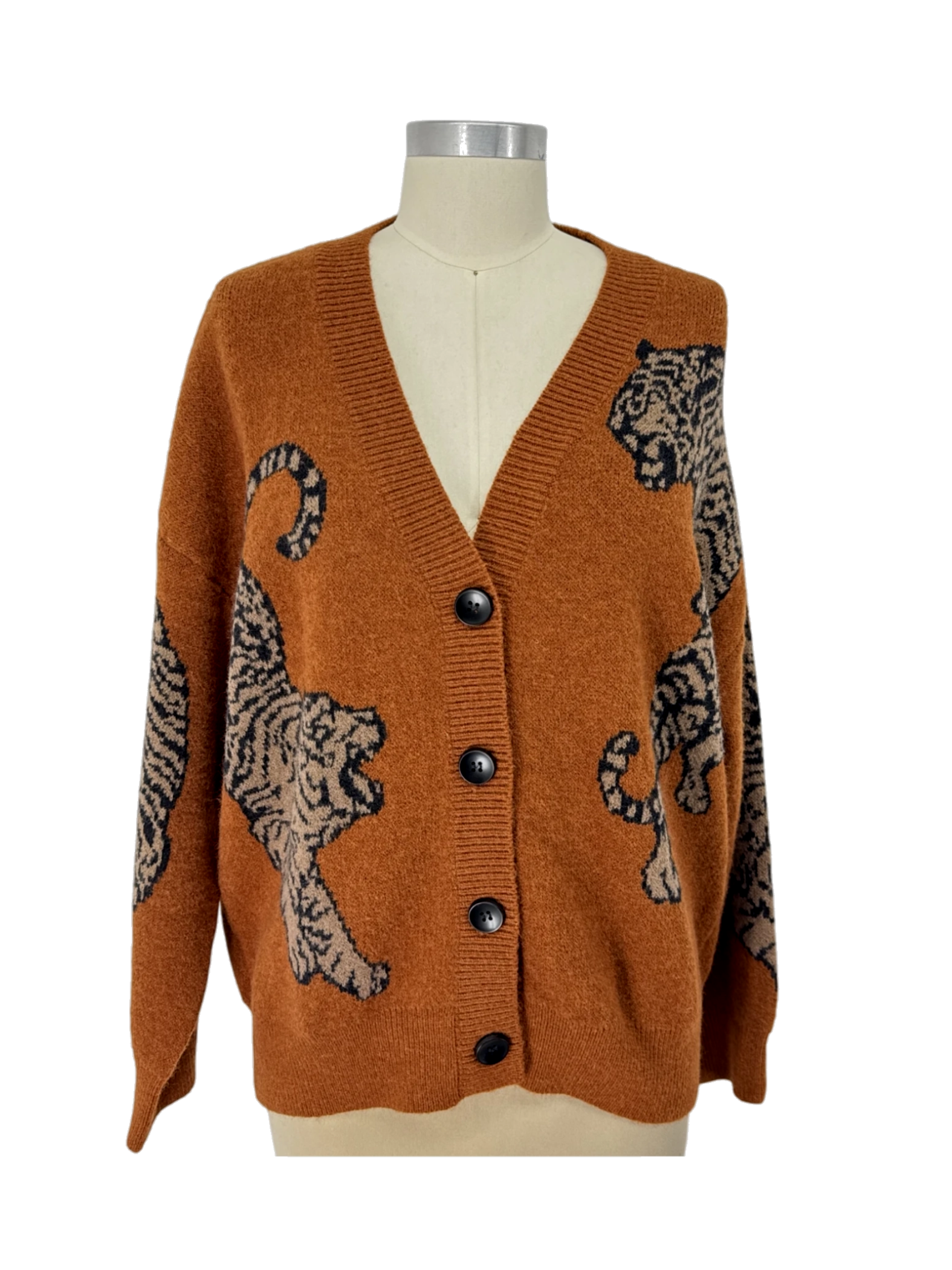 This pre-owned BiBi! cardigan sweater is a stylish and unique addition to any wardrobe. Featuring a bold animal print pattern with tiger designs, this sweater is perfect for making a statement. The warm brown color and soft material make it ideal for fall and winter wear. The V-neck and button-up closure offer a classic look, while the mid-weight fabric provides both comfort and style. Perfect for layering, this sweater adds personality and flair to any outfit.