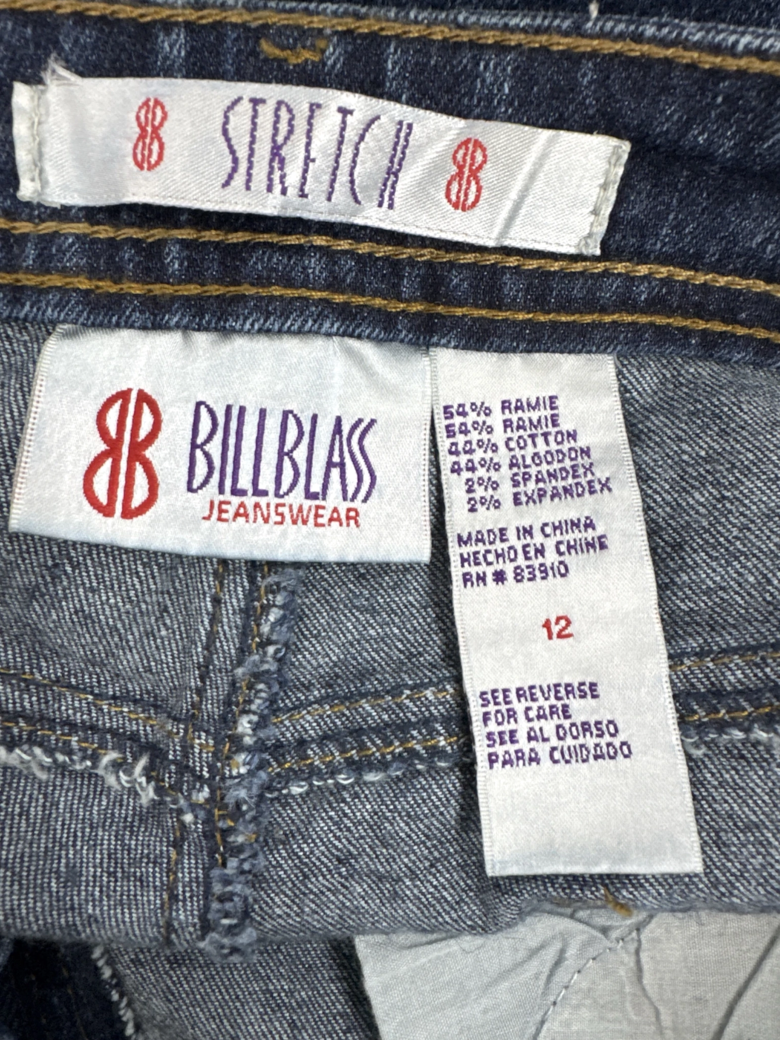 Pre-owned Bill Blass jeans in size 12. These stylish denim jeans feature a bootcut design with a comfortable mid-rise waist, crafted from a blend of cotton, spandex, and ramie. Decorated with jewel embellishments, these jeans offer both a classic and fashionable look. Perfect for everyday wear, these jeans are a versatile addition to any wardrobe, offering a blend of comfort and style.