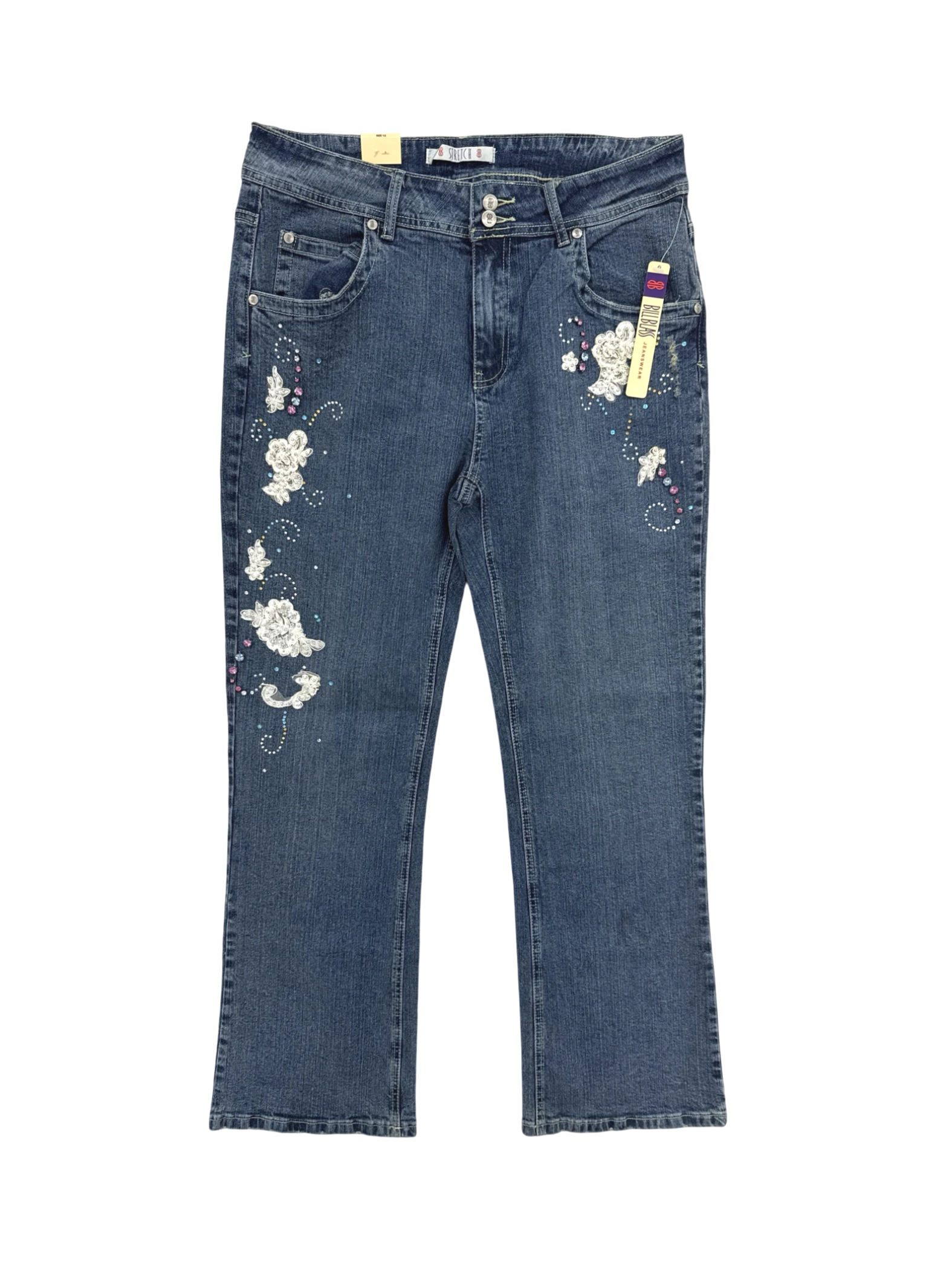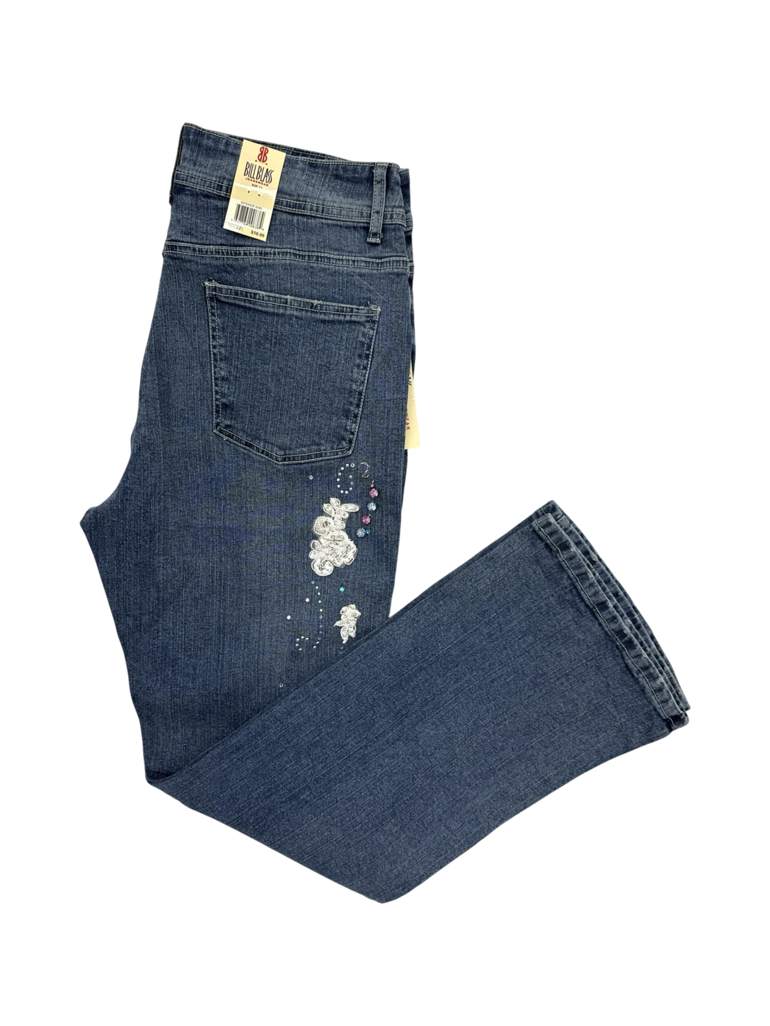 Elevate your denim collection with these stylish Bill Blass jeans. Featuring a classic bootcut silhouette, these jeans are embellished with floral details, adding a touch of elegance to your everyday look. Crafted from a comfortable blend of cotton and ramie with a hint of stretch, they offer a flattering fit and all-day comfort. Perfect for pairing with your favorite tops and footwear, these jeans are a versatile addition to any wardrobe.