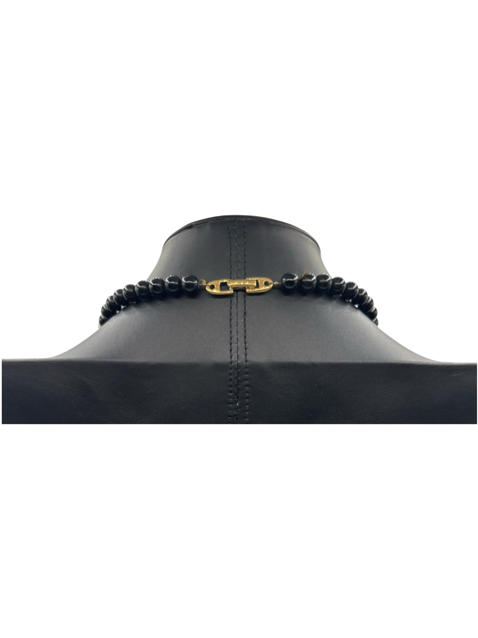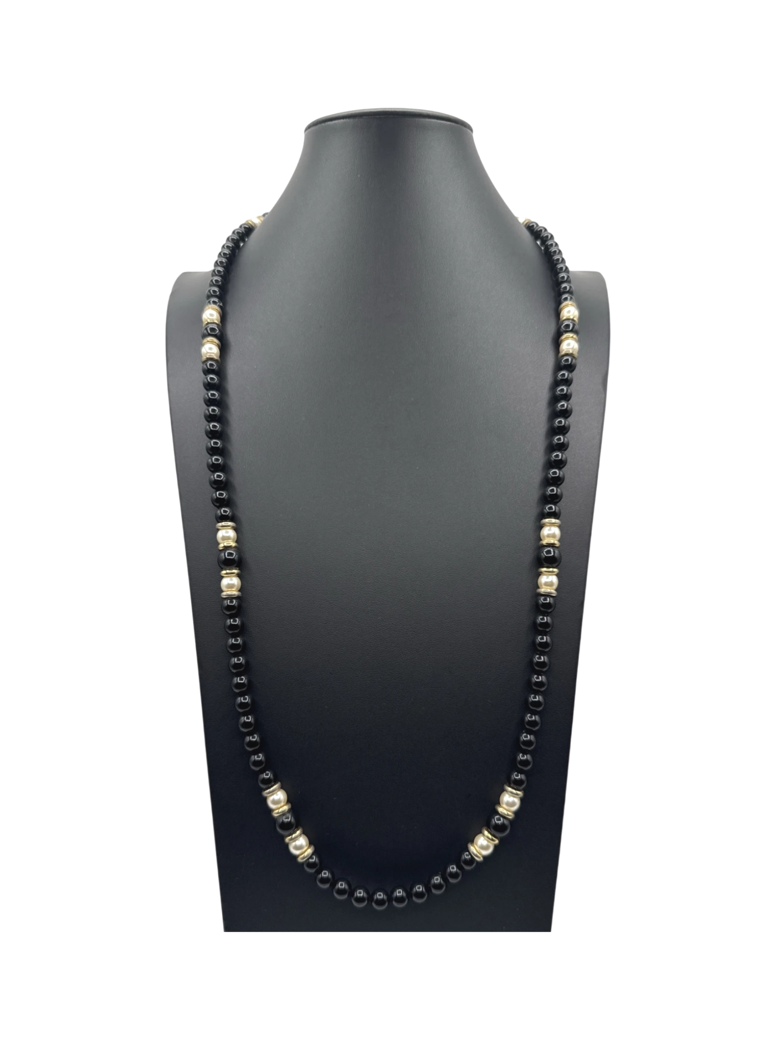 Elegant vintage necklace featuring black resin beads interspersed with gold-tone accents and faux pearl beads. This timeless piece is a perfect addition to any jewelry collection, suitable for both casual and formal occasions. The necklace has a secure clasp and offers a classic and sophisticated style, ideal for adding a touch of glamour to your look.