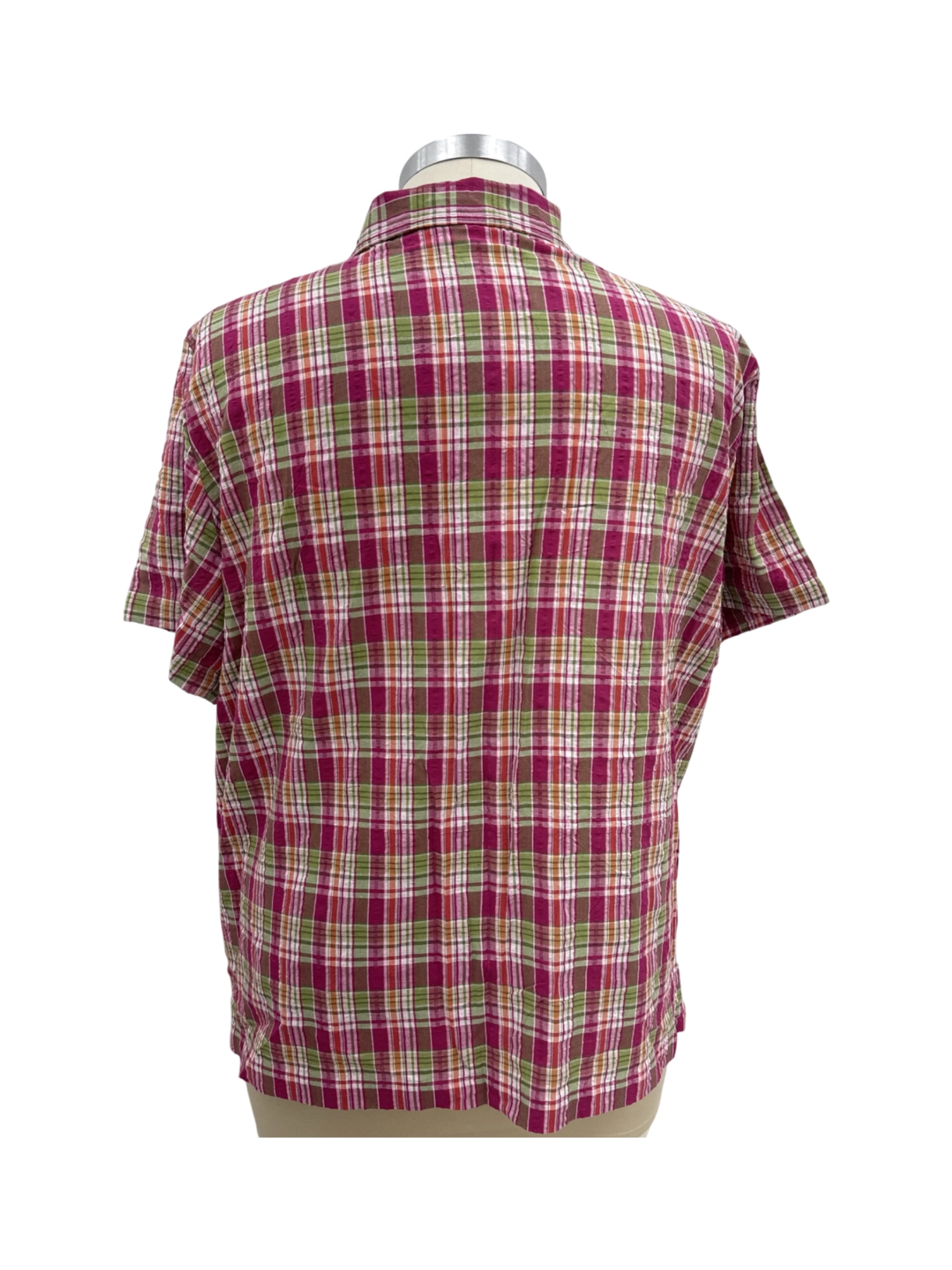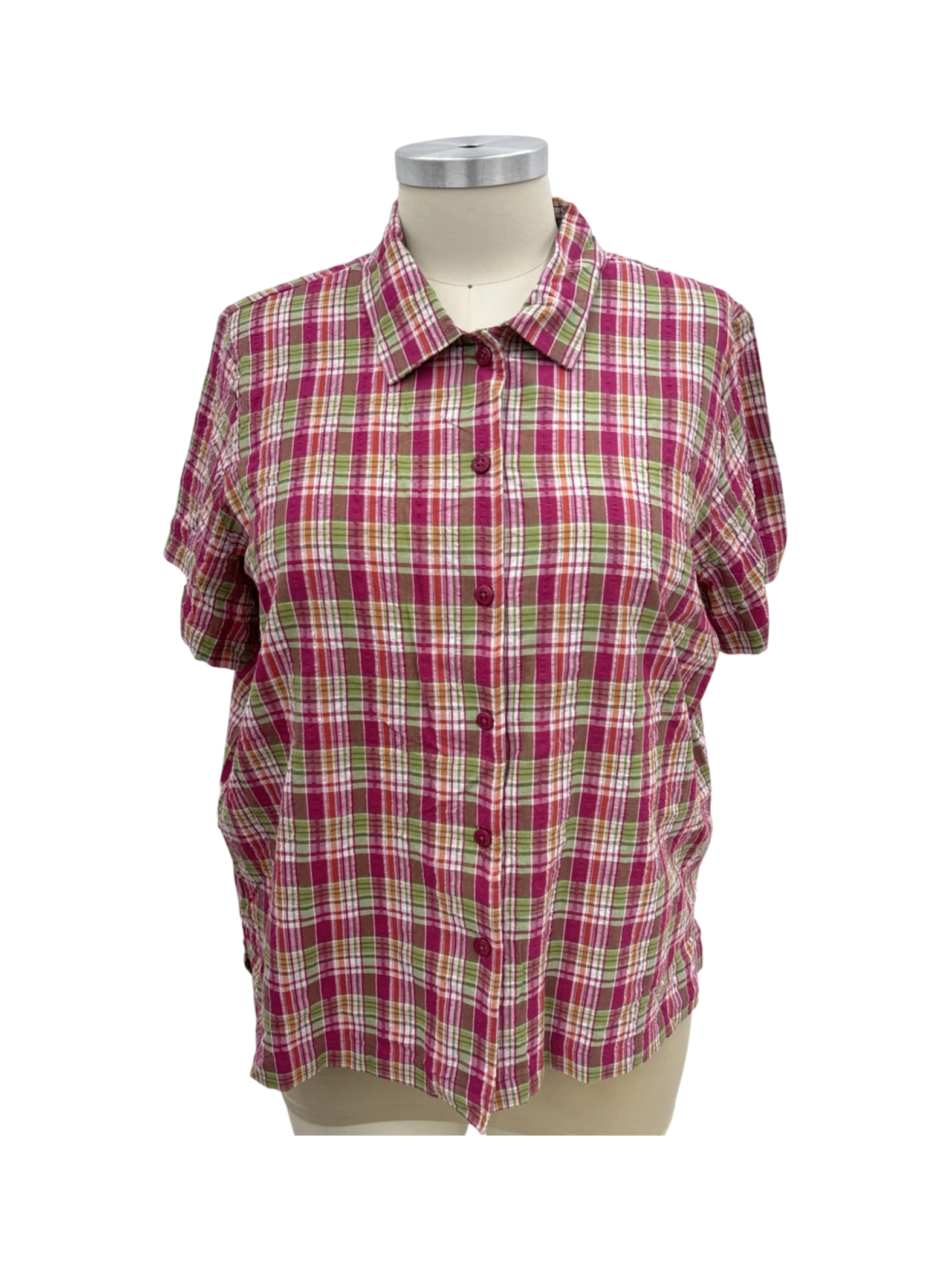 This pre-owned BLAIR women's top is a stylish and comfortable choice for any wardrobe. Featuring a classic plaid pattern, this button-up blouse is perfect for layering or wearing on its own. Crafted from 100% cotton, it offers a soft and breathable feel, ideal for warmer seasons. The shirt boasts a flattering fit, making it a versatile addition to your collection. Its vibrant color and timeless design ensure it will be a go-to piece for years to come.