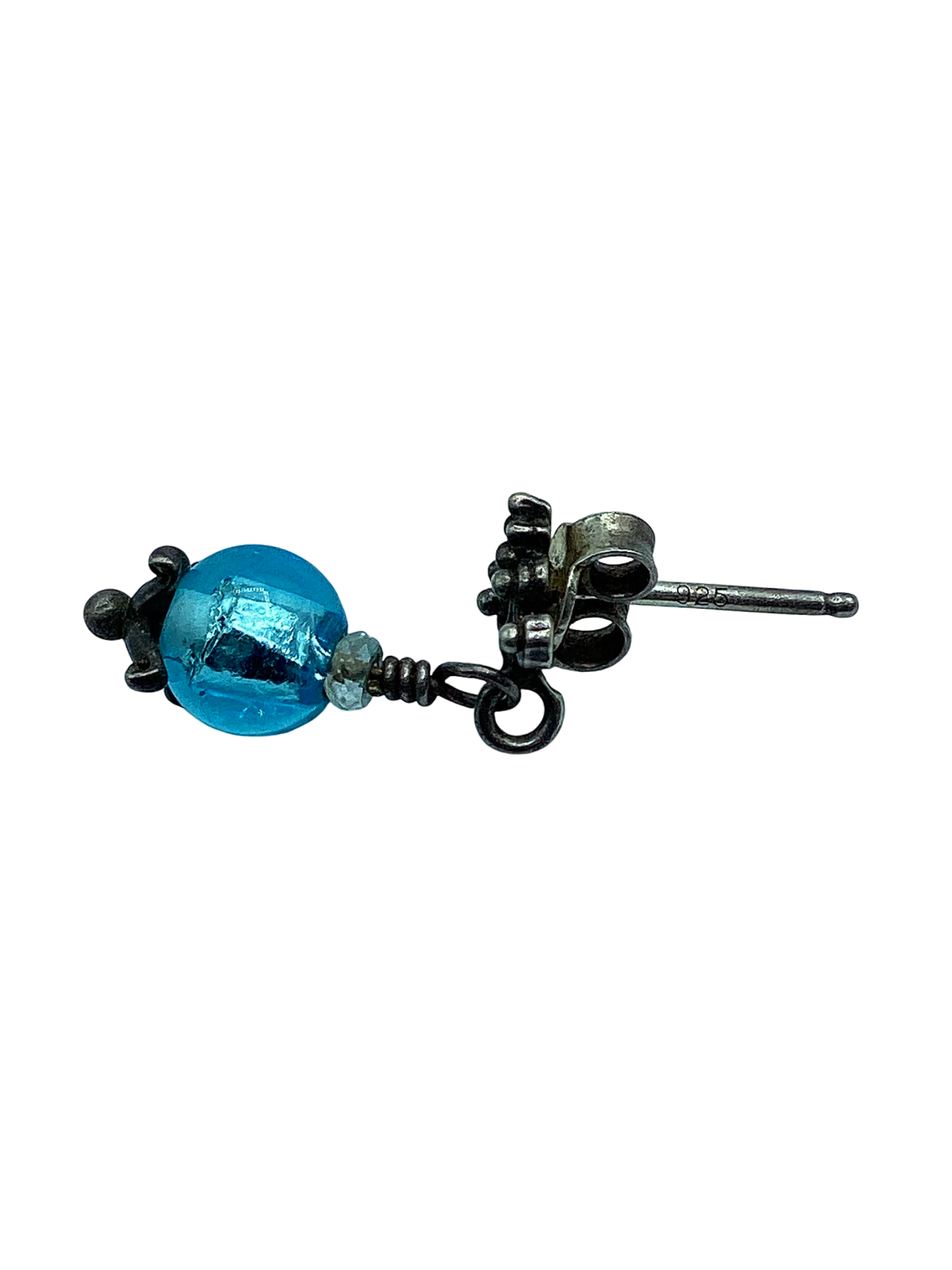 This handcrafted earring has a vibrant blue glass bead, accented with a small clear crystal, and is set in a detailed sterling silver design. The earring has a secure post backing and a charming dangle style, which is perfect for adding a touch of color and elegance to any outfit.