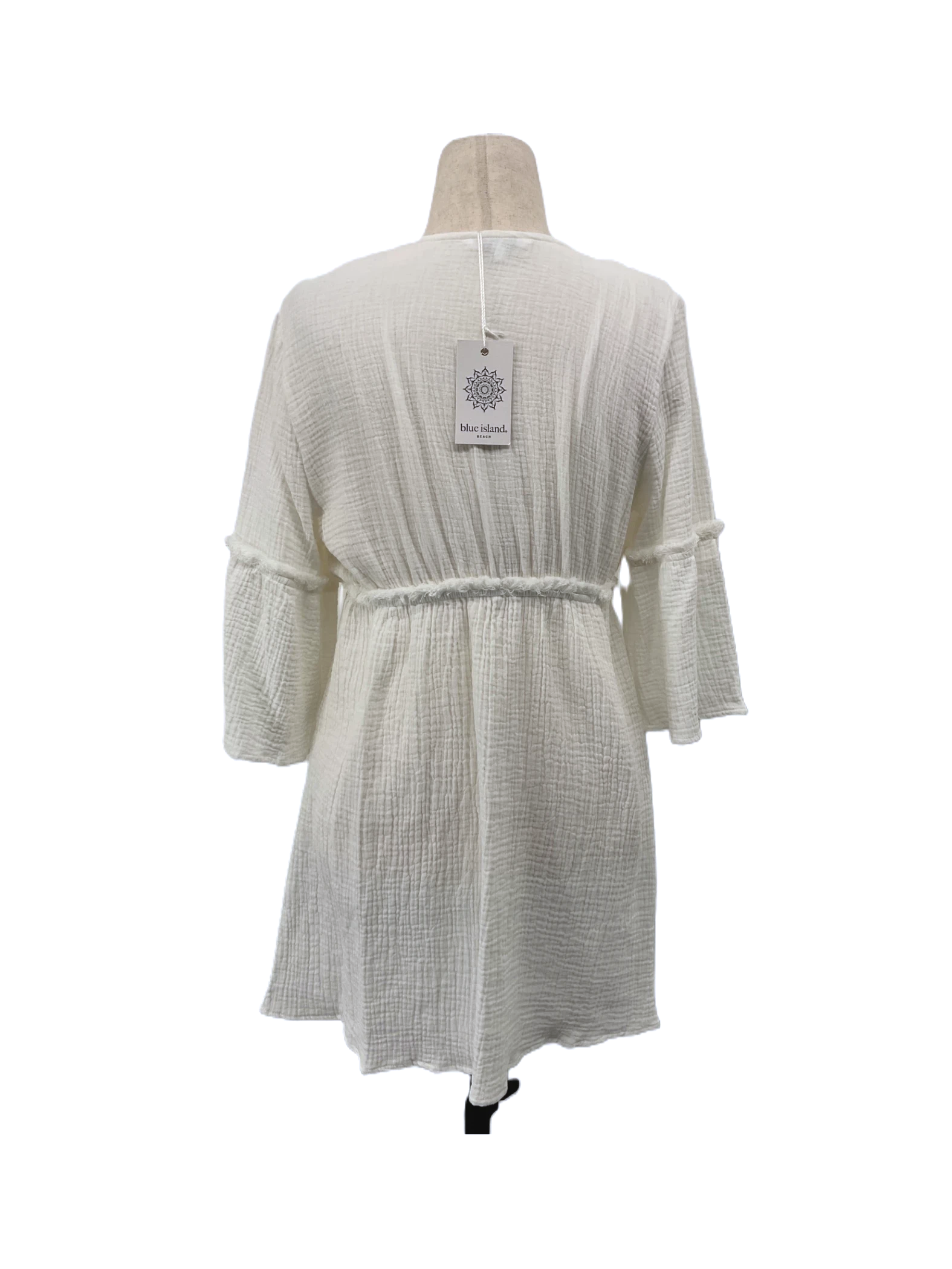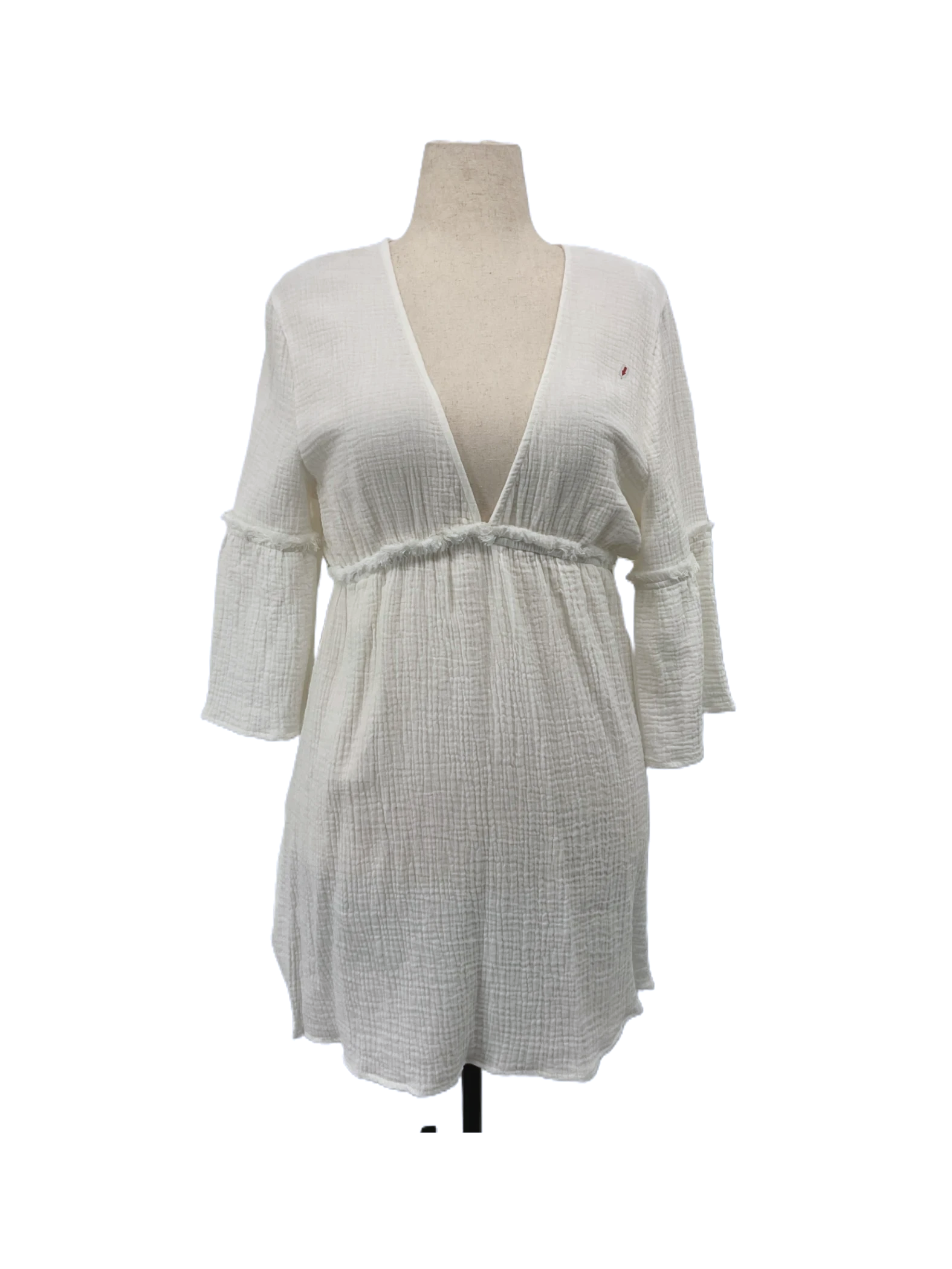 This dress is a mini dress with a v-neck, gathering under the bust, and puff sleeves. The arrow in the first photo indicate a minor blemish on the fabric.