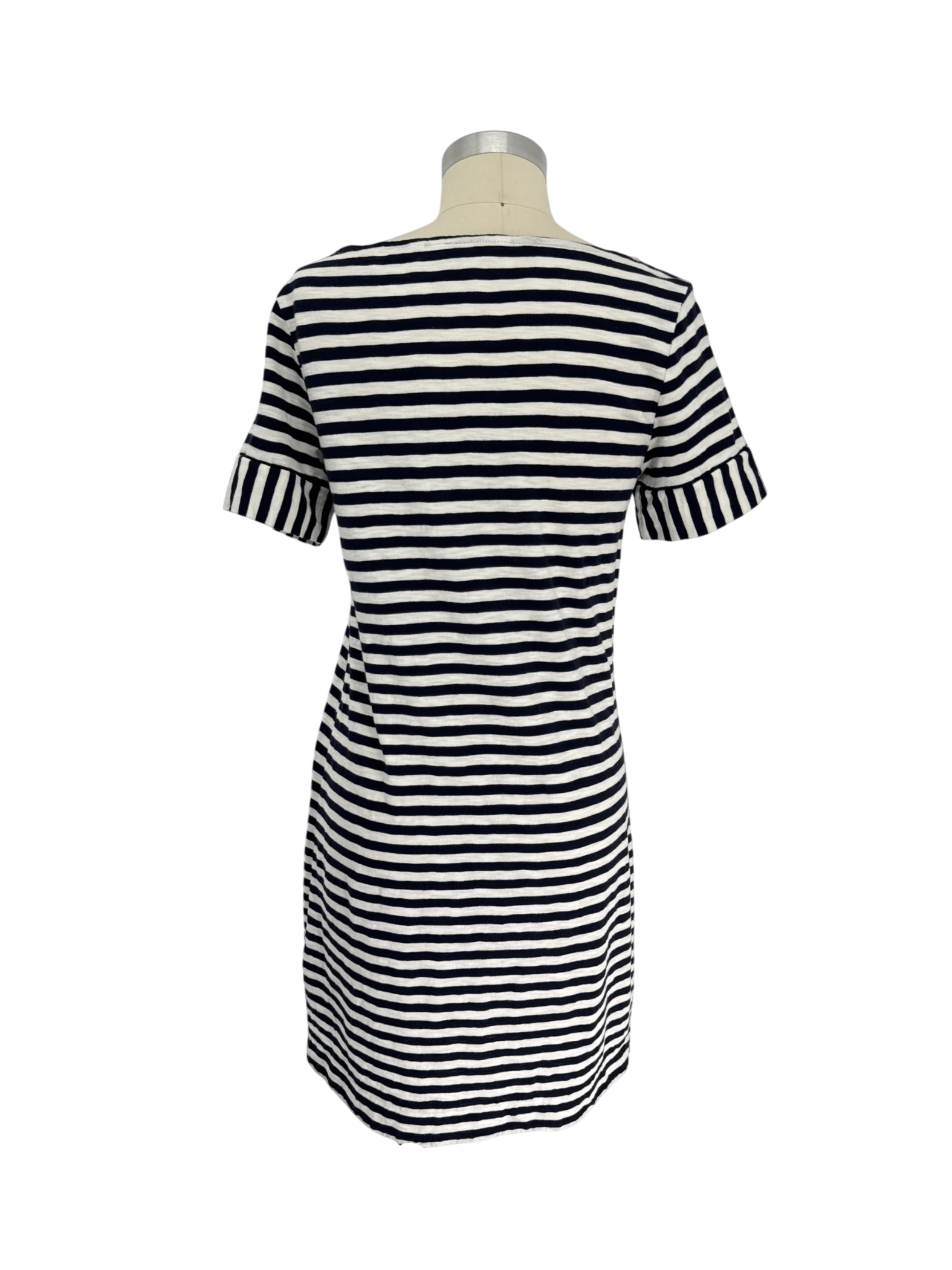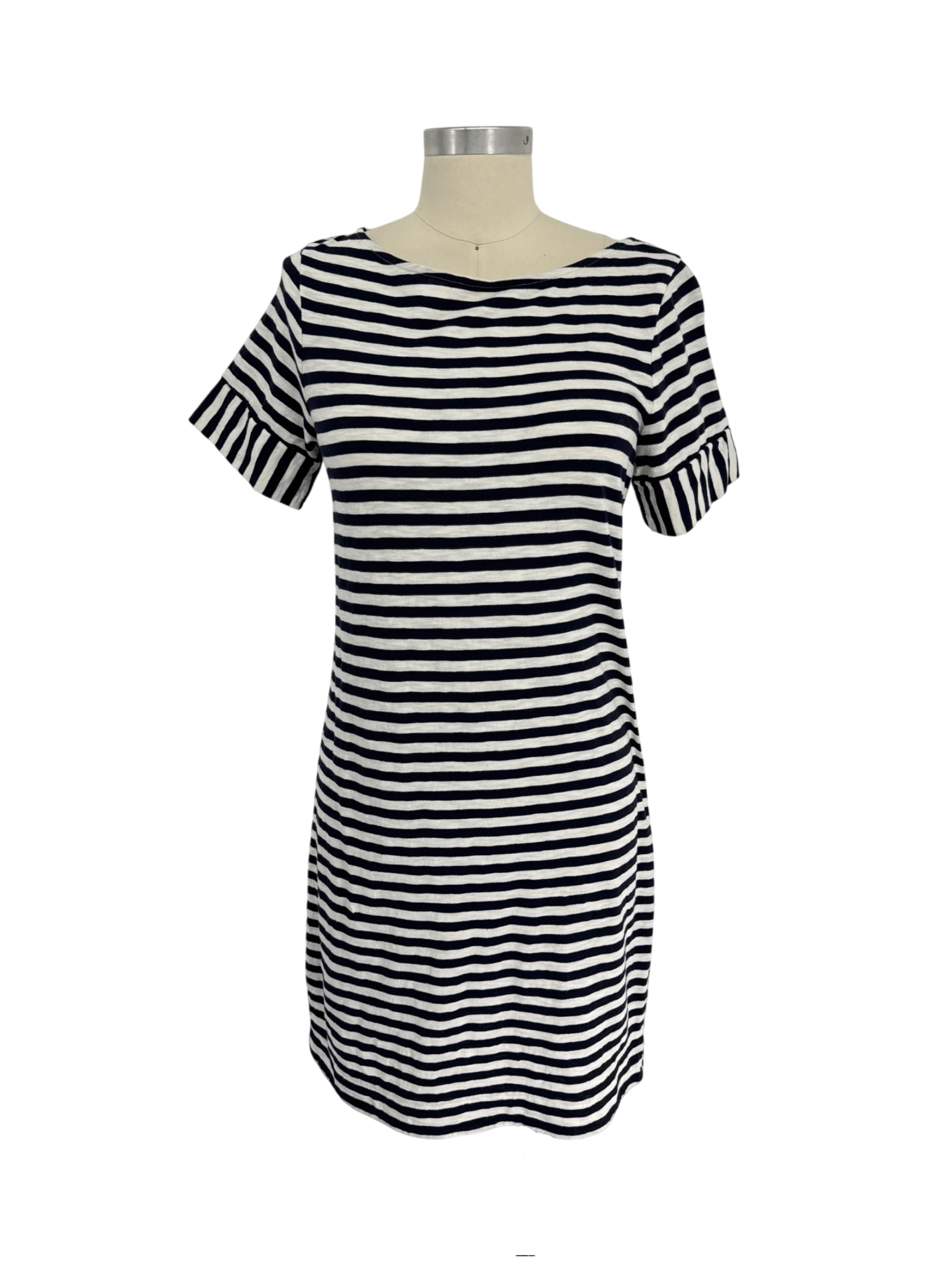This pre-owned Boden dress is a casual chic shift dress, perfect for a sunny day out. Featuring a classic stripe pattern in navy and white. Made from 100% cotton, it offers a comfortable fit. The dress has a flattering shift style with a round neckline and short sleeves. This versatile piece is ideal for your everyday wardrobe. A timeless design, ready to be styled up or down.