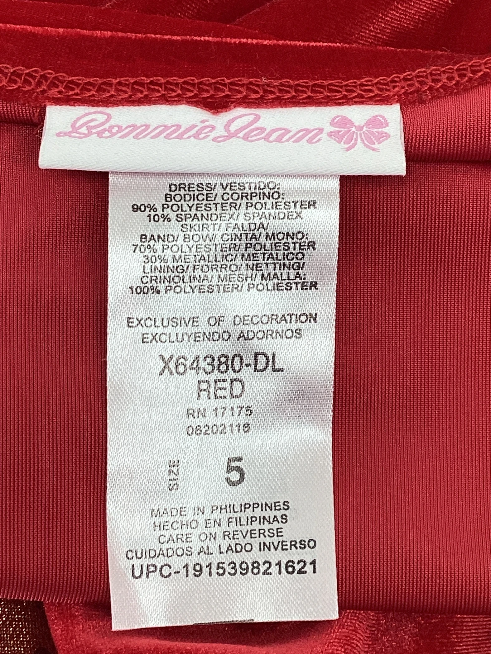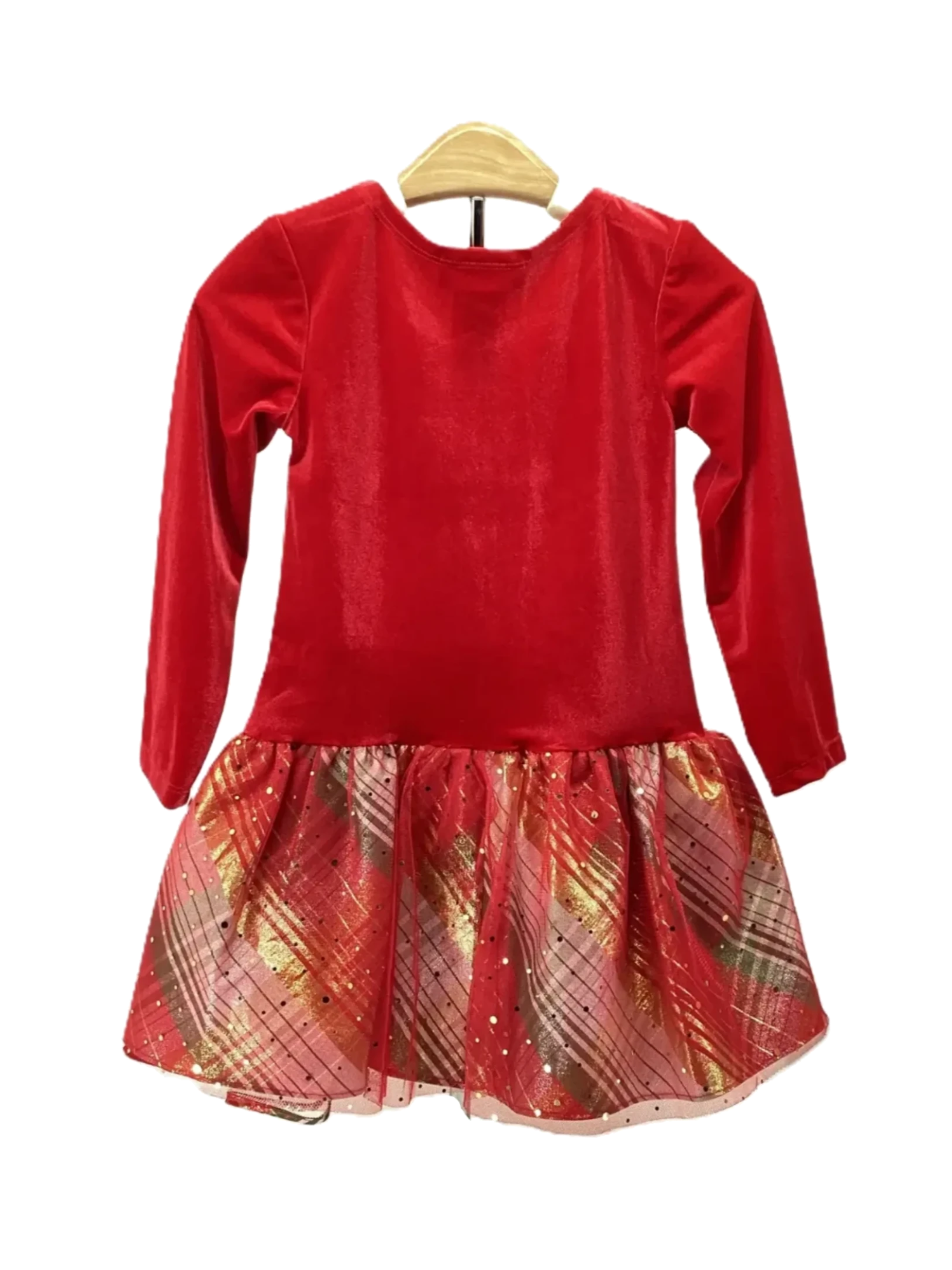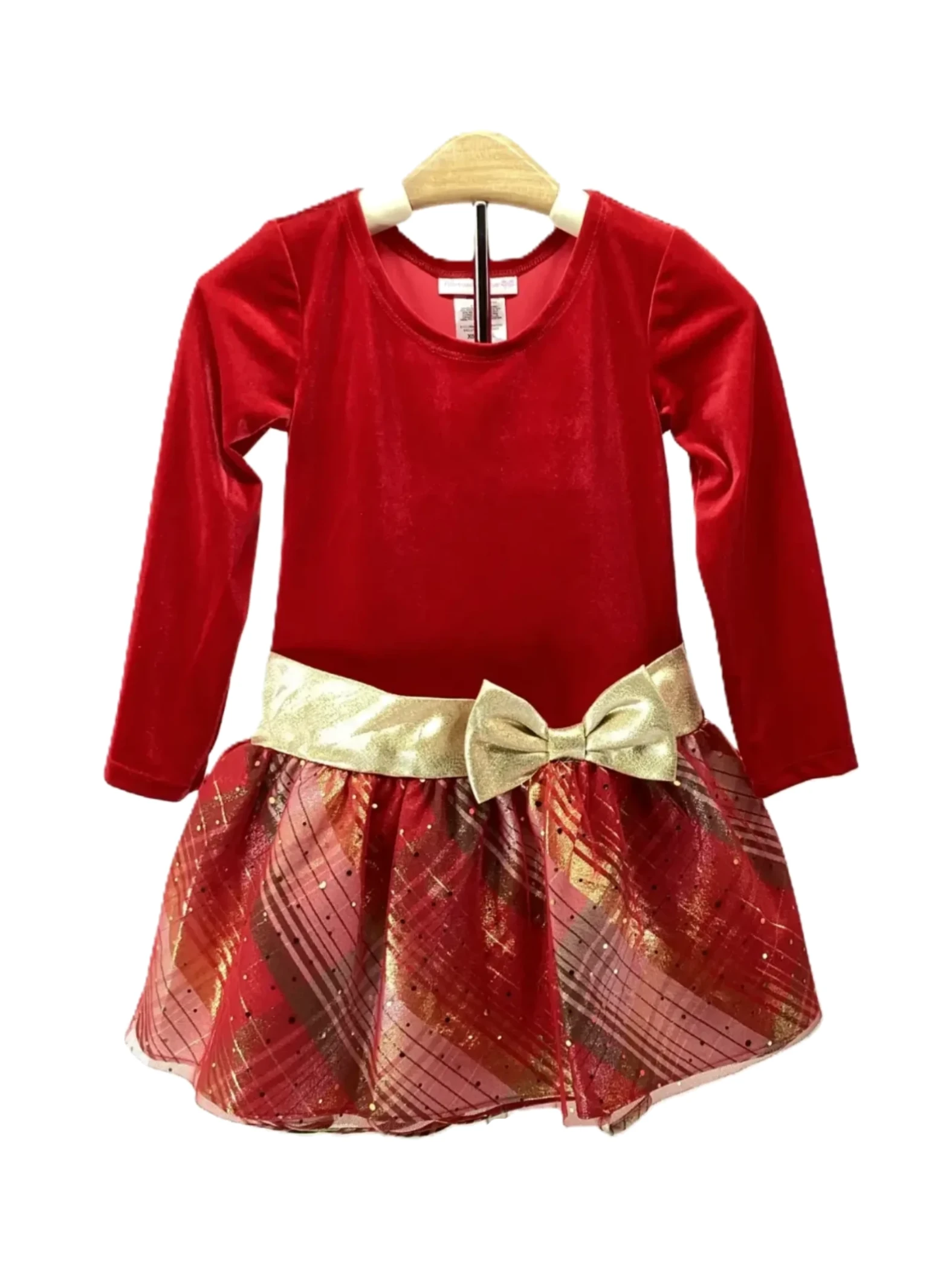 This item is a red dress with a plaid skirt and waist tie. Girl's Size 5. Made: Polyester and Spandex.
