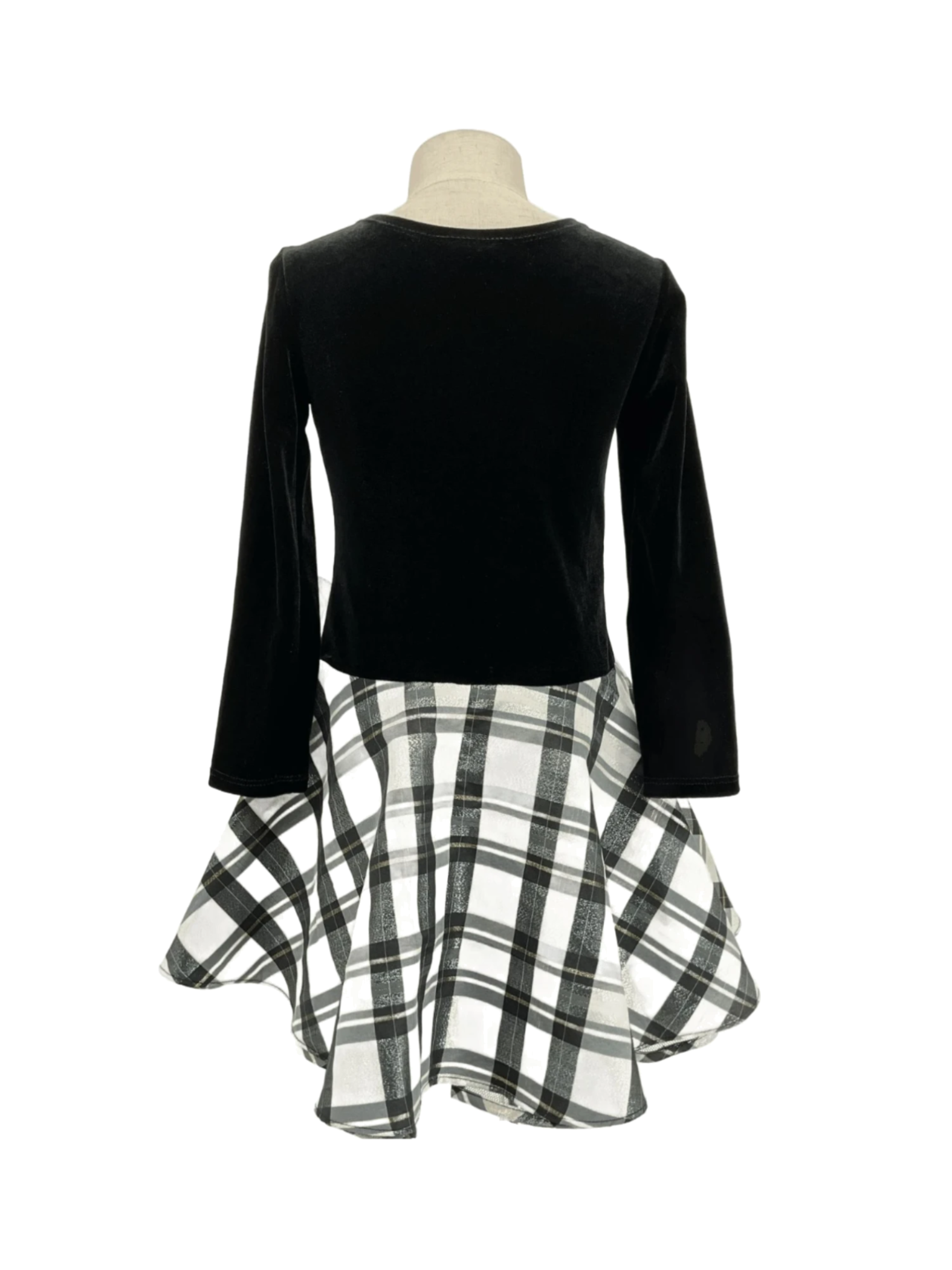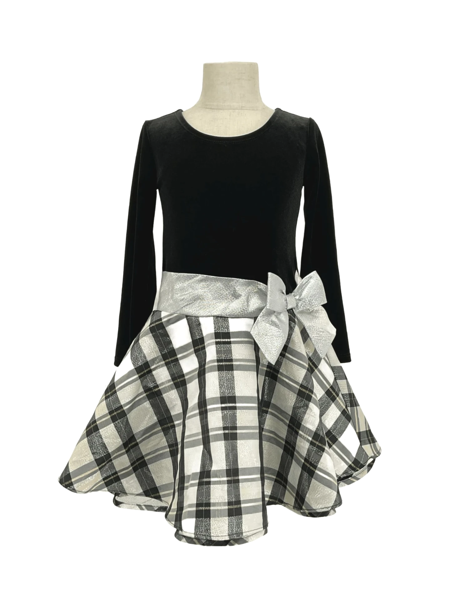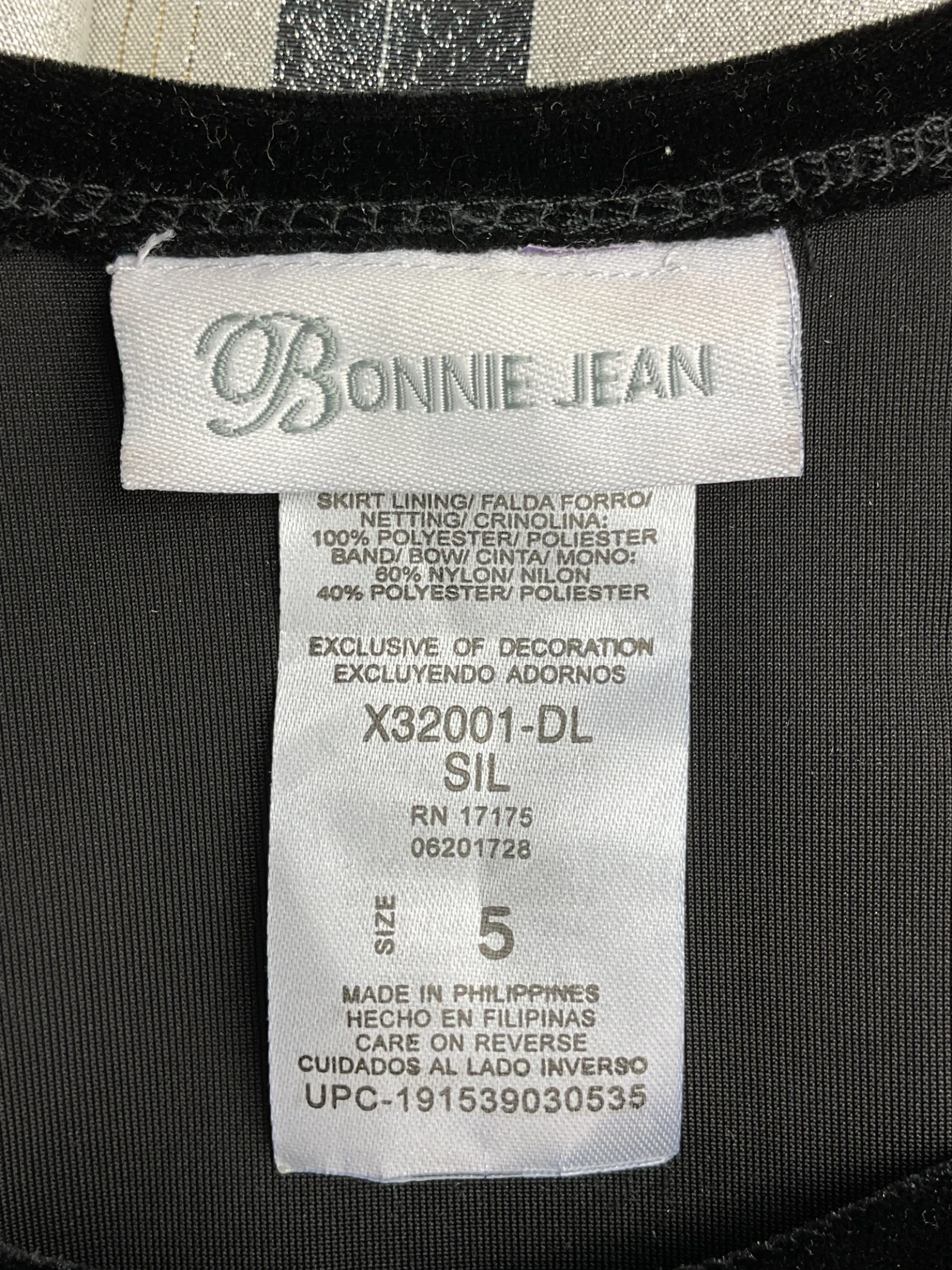 A black, gold and white dress for girls in size 5 with a bow tie.