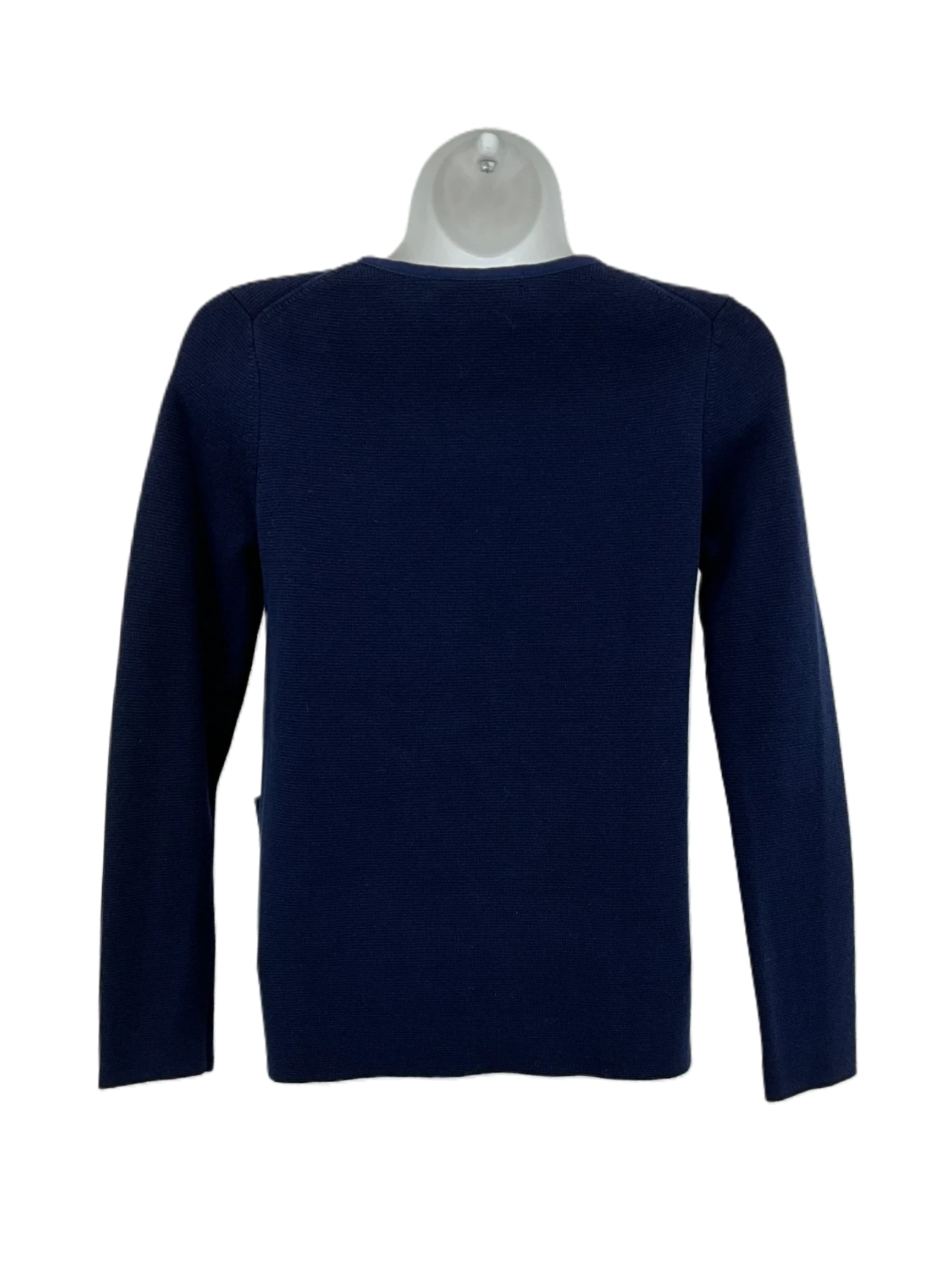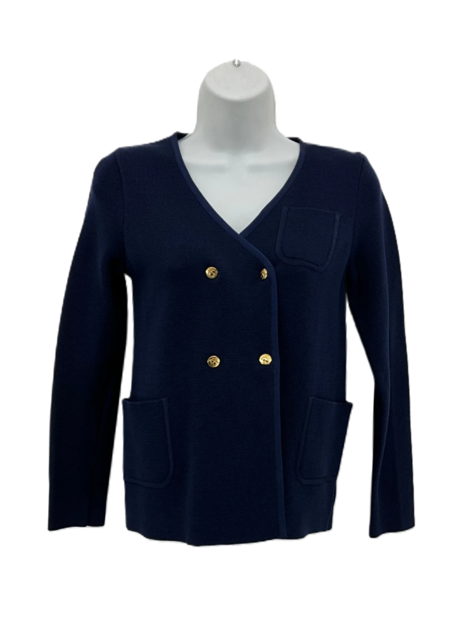 A navy, double-breasted cardigan with long sleeves and a v-neck for women in size large.