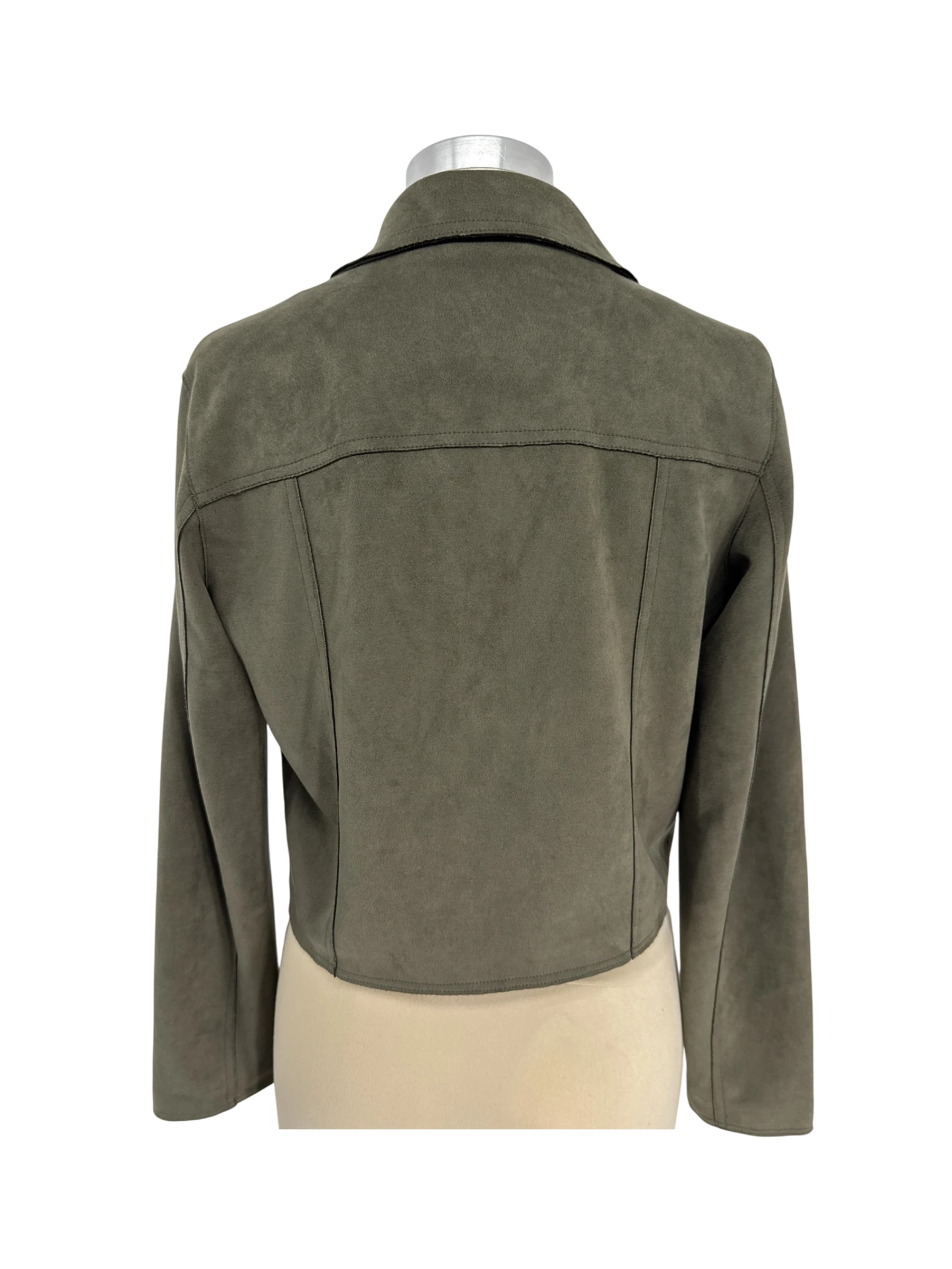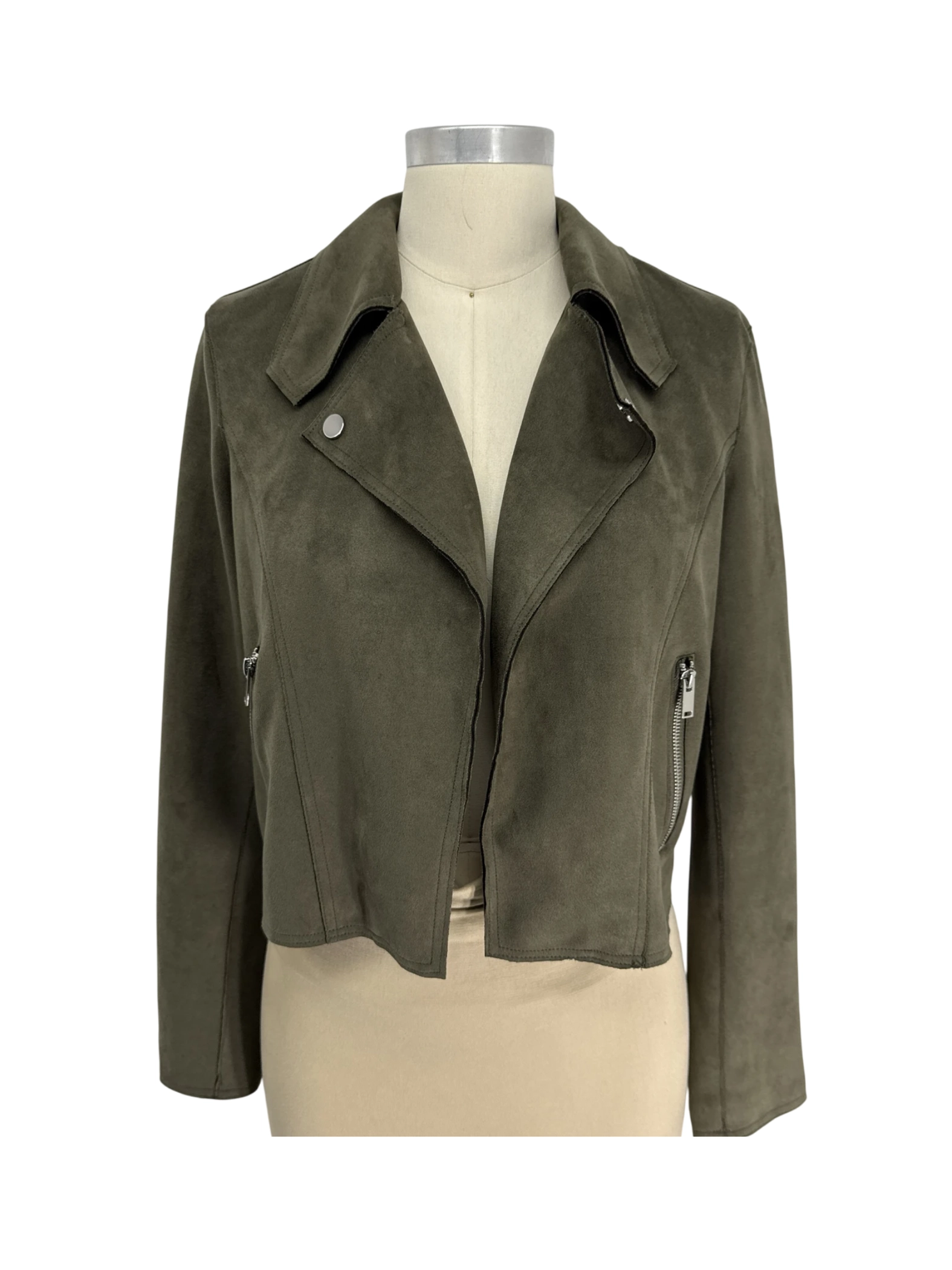 Pre-loved by Anthropologie green motorcycle jacket in a stylish design. This jacket combines a classic motorcycle silhouette with a touch of elegance, featuring a sleek faux suede exterior and a flattering fit. Ideal for adding a chic edge to any outfit, perfect for casual outings or evening looks. This versatile piece offers comfort and style. A must-have addition to your wardrobe.