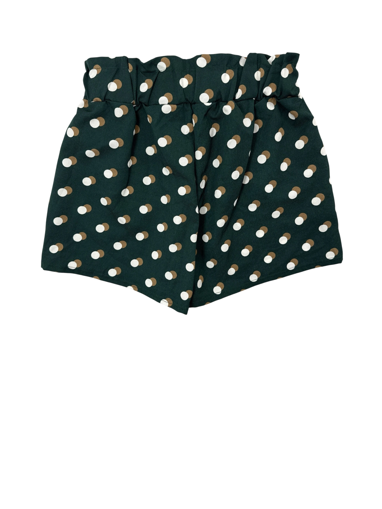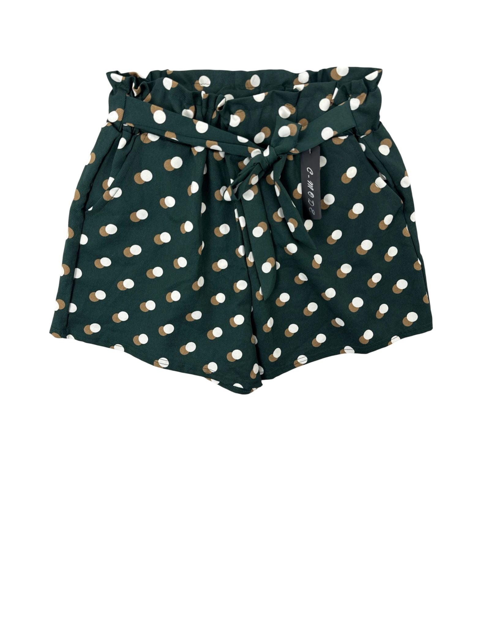 These adorable c-MODE skort shorts are perfect for a warm day. They feature a trendy high-waisted design, an all-over dotted pattern, a matching belt, and pockets. The green base color is accented with white and brown dots, creating a versatile style that can be dressed up or down. The shorts are made from a soft, lightweight fabric blend that is comfortable to wear. These shorts are in excellent condition, making them a great addition to any wardrobe. Perfect for summer days. - Elevate your wardrobe with these pre-owned c-MODE women's shorts, perfect for a chic and comfortable look. Featuring a stylish polka dot pattern on a green background, these high-waisted shorts are designed with a flattering fit. They are crafted from a blend of polyester and spandex, ensuring a lightweight and comfortable wear. With a trendy tie waist, these shorts are ideal for summer and fall wear. Pair these with a casual top for a casual day out or dress them up with a blouse.