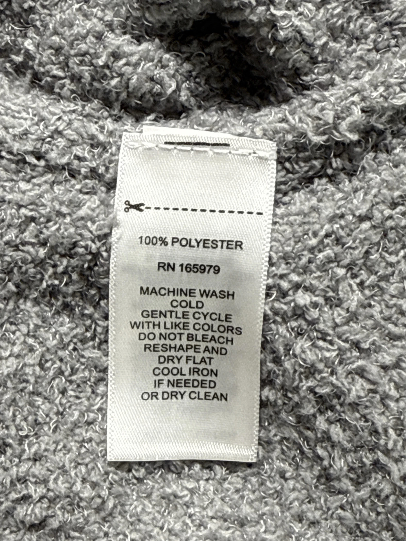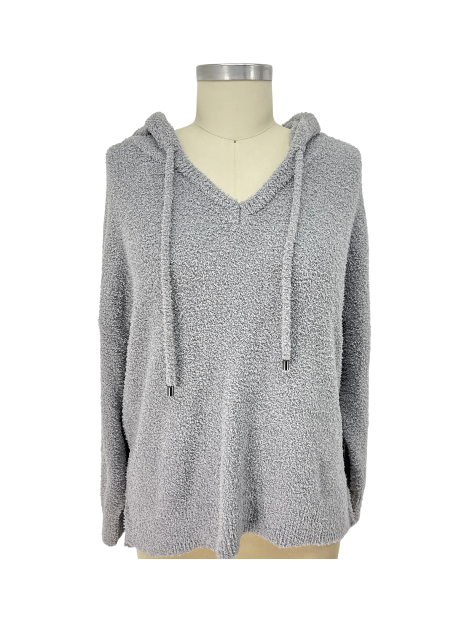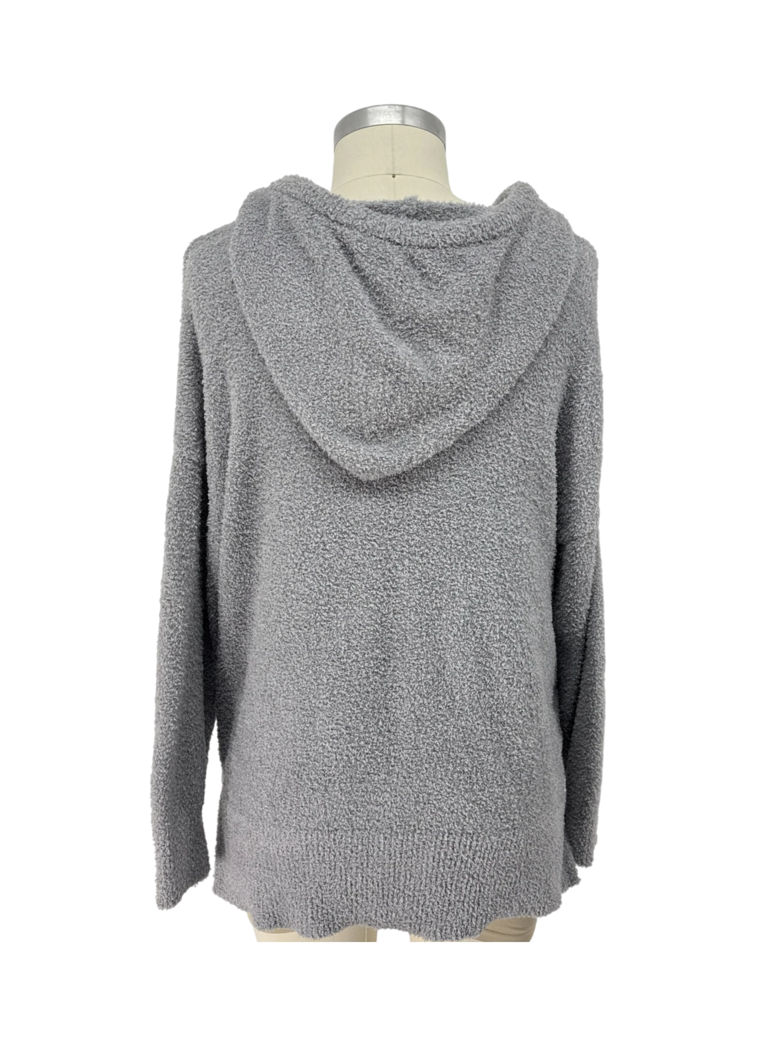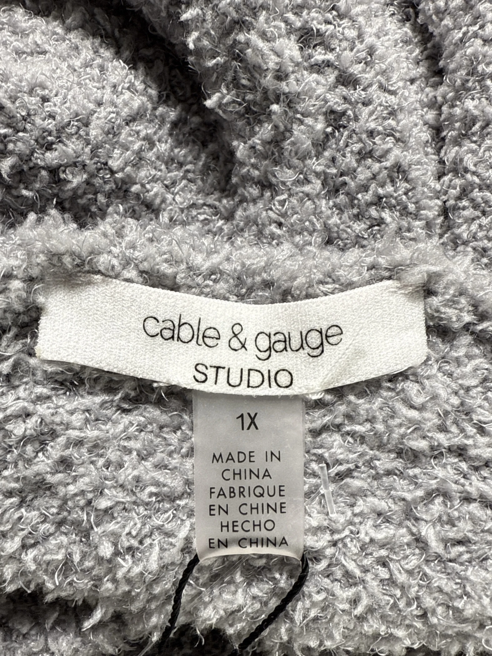 Cozy up in style with this Cable & Gauge Studio sweater. This pre-loved hoodie features a soft, textured gray fabric that's perfect for cooler days. The V-neck and drawstring hood add a touch of casual chic, while the 1X size ensures a comfortable fit. Made from 100% polyester, this sweater is easy to care for. A must-have addition to any wardrobe, providing both warmth and style. Perfect for layering, this sweater can be dressed up or down.