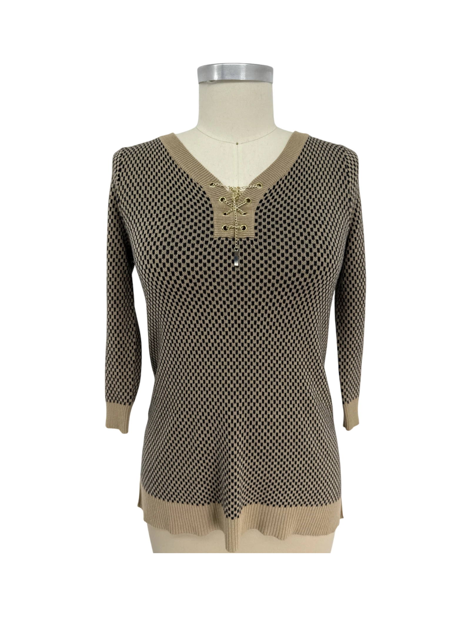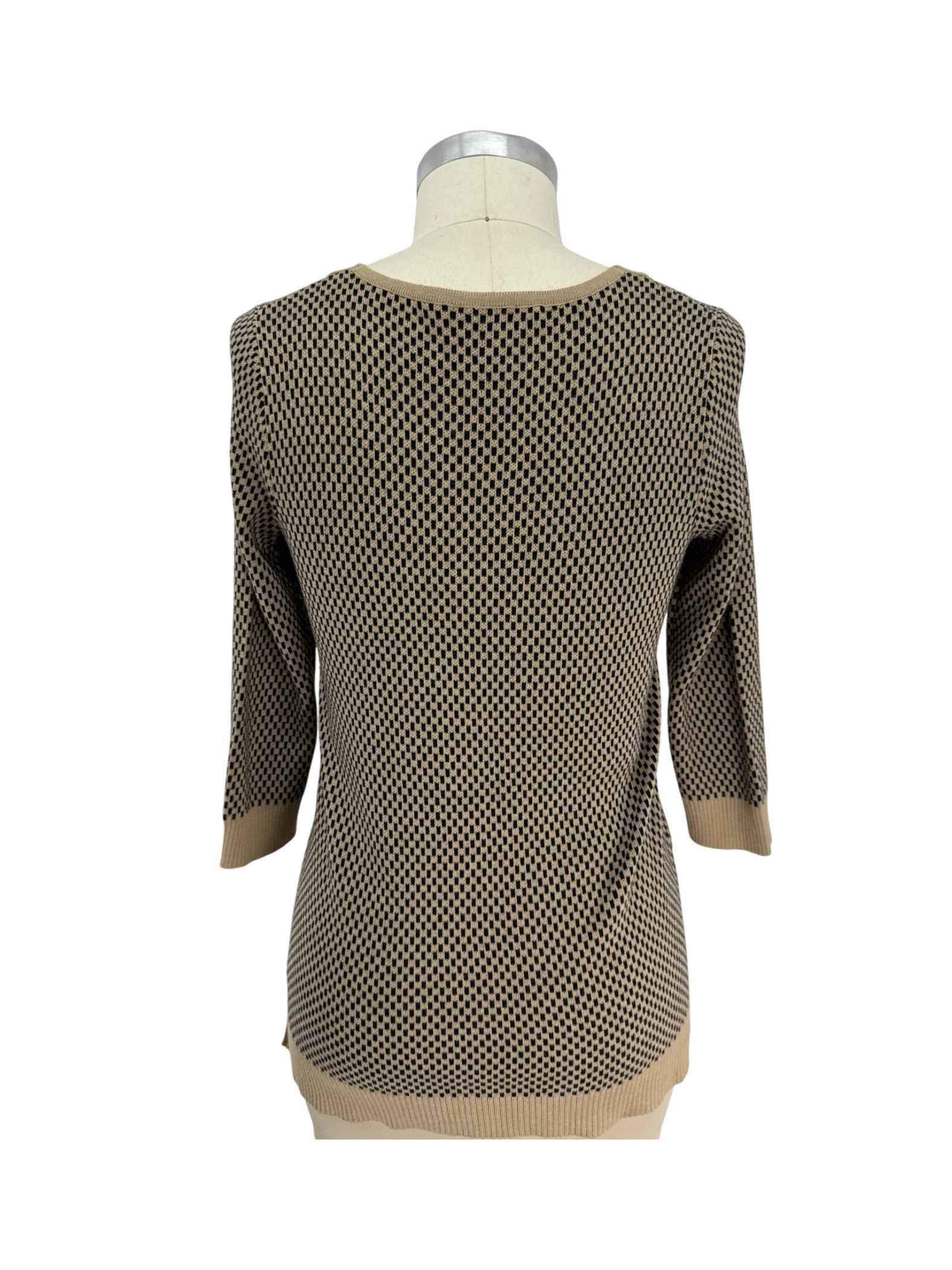 Elevate your wardrobe with this pre-owned cable & gauge sweater, a chic addition to any woman's collection. This elegant sweater features a classic geometric pattern in black and beige tones and a flattering V-neckline. Crafted from a comfortable blend of cotton and acrylic, it offers both style and comfort. Perfect for the fall and spring seasons, it's a versatile piece that can be dressed up or down. The sweater comes in size M.