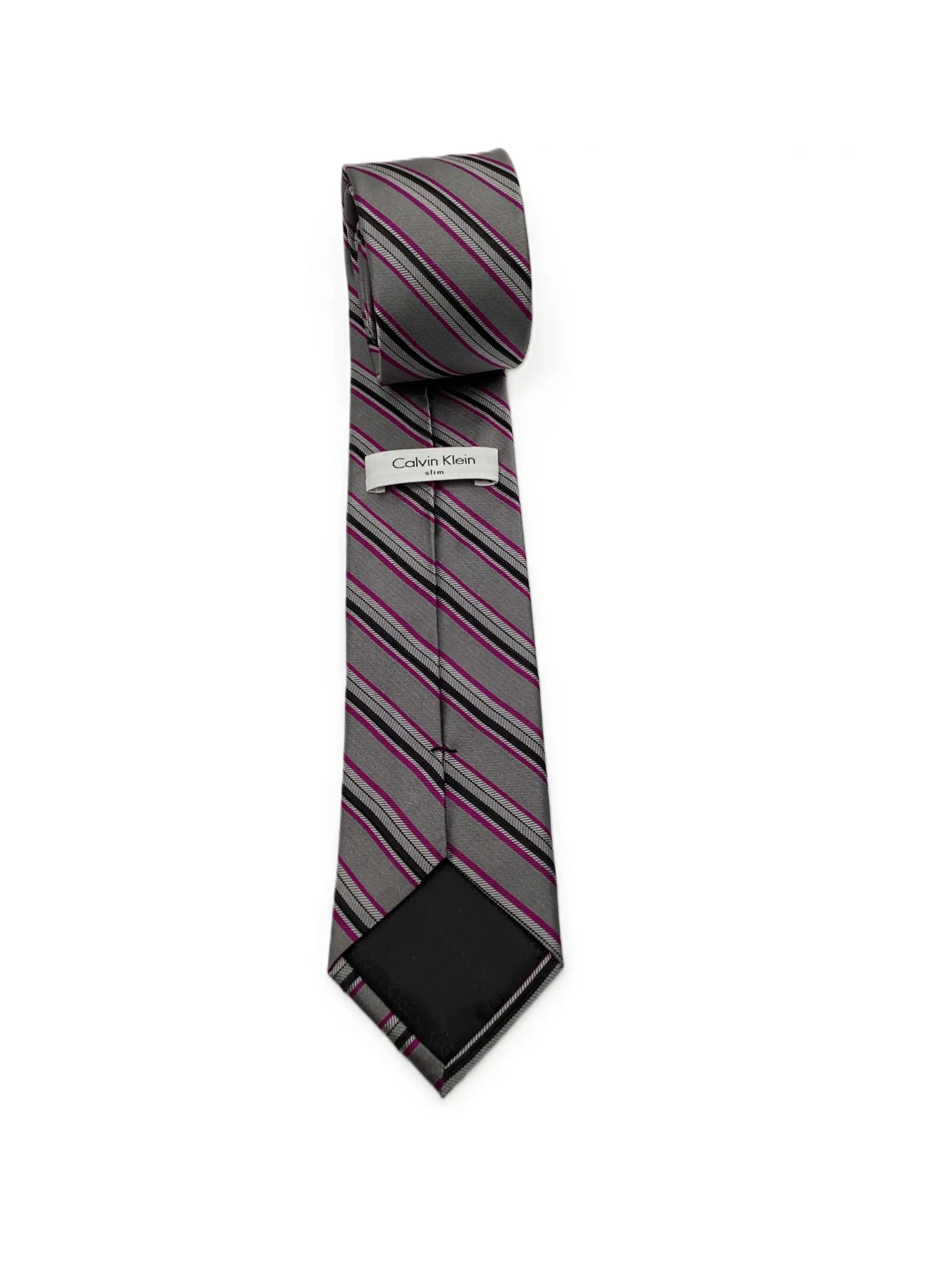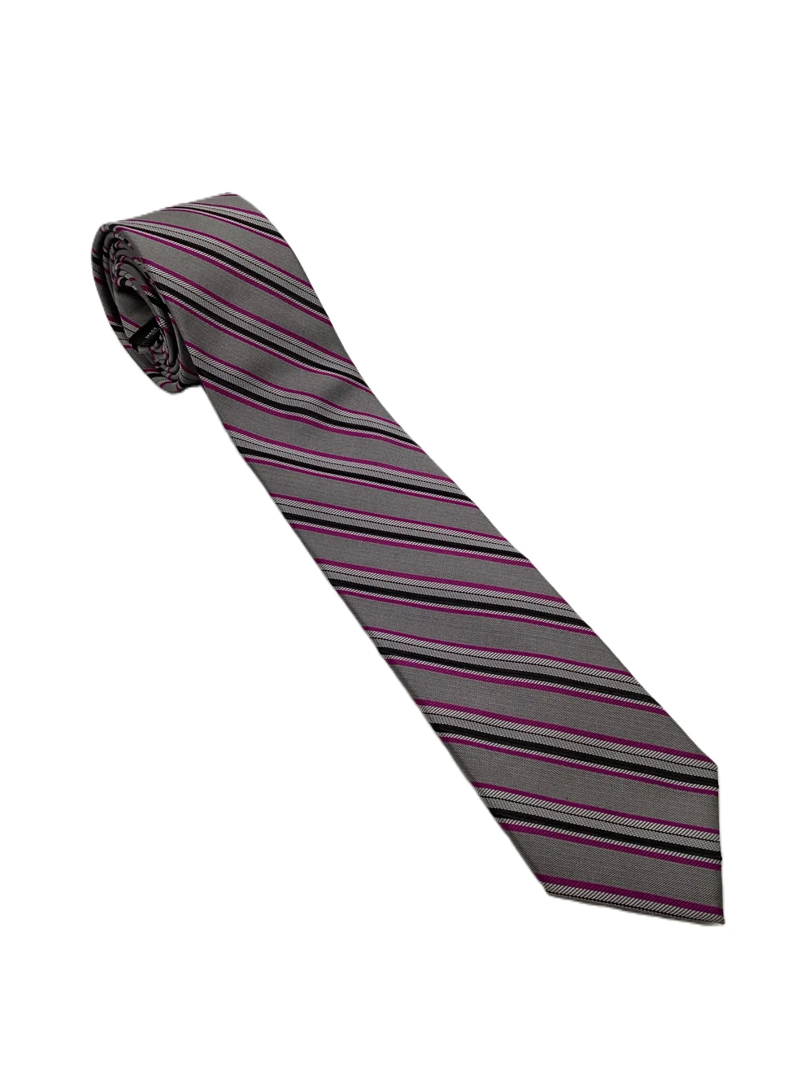 This is a slim tie in purple and gray, 2 inches wide and 58.5 inches long.