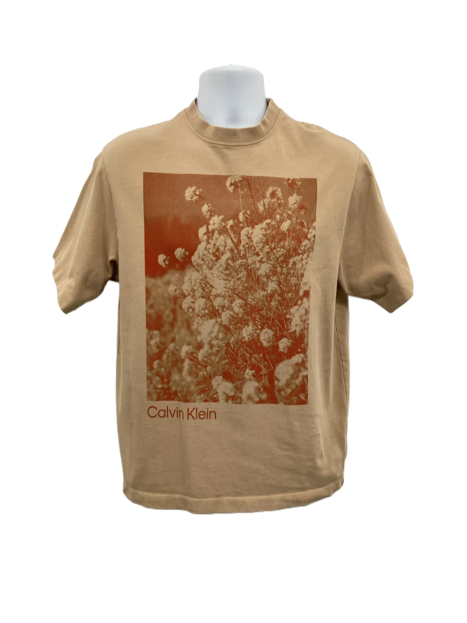 Men's tan pure cotton field printed short sleeve T-shirt in size XXS.
