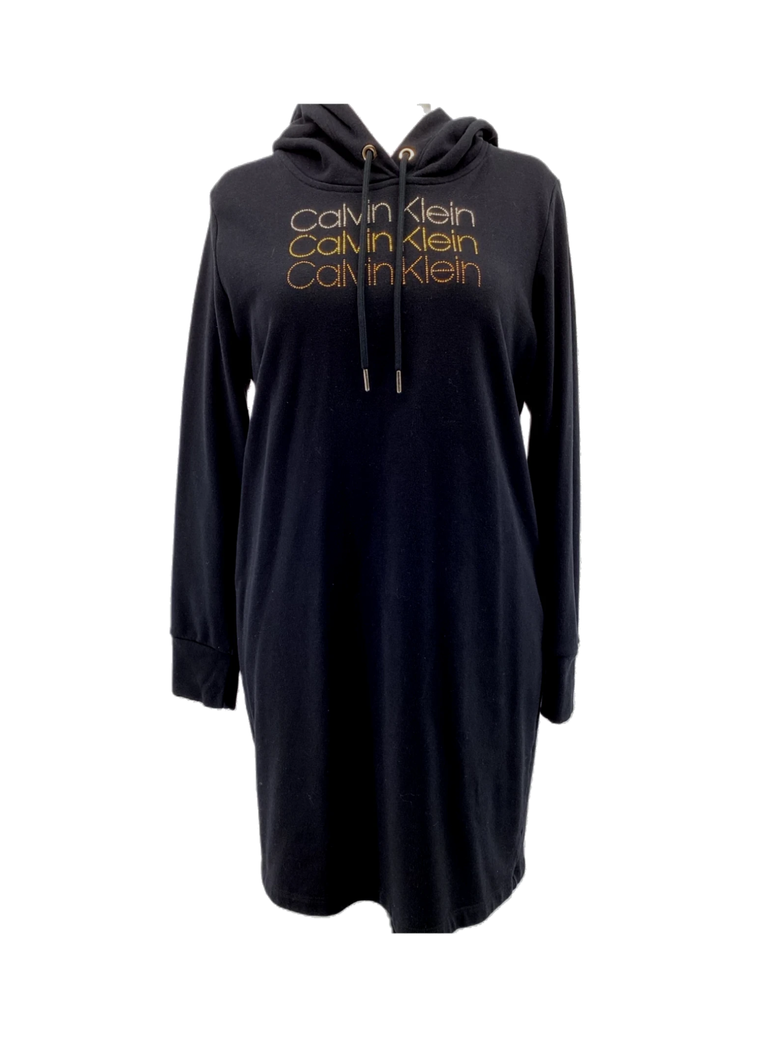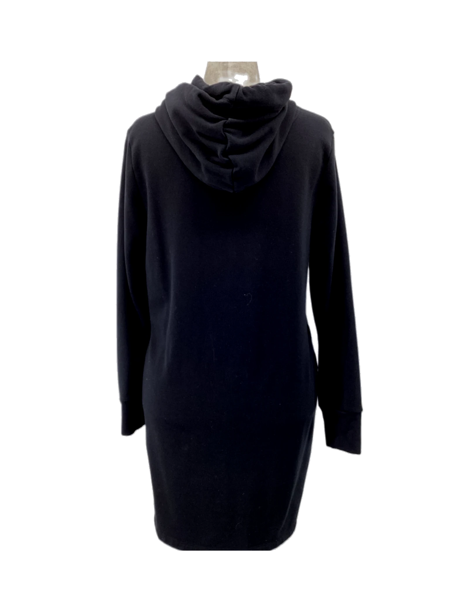 A black long hoodie sweatshirt dress for women, size large, with long sleeves and drawstrings.