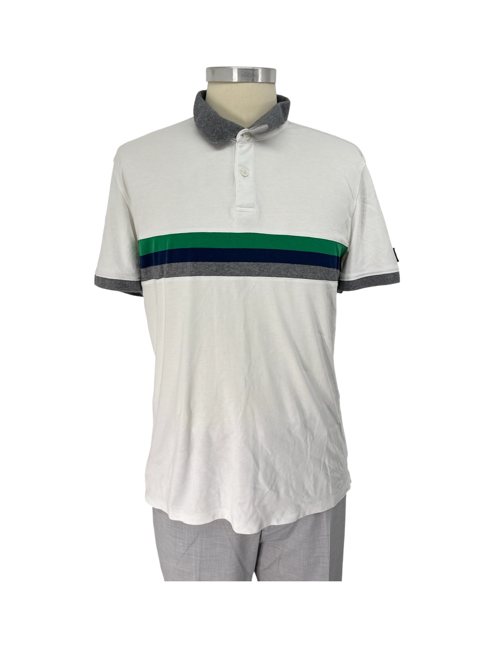 Elevate your casual wardrobe with this pre-owned Calvin Klein polo shirt. This stylish polo features a classic collar, short sleeves, and a button-up closure. Crafted from comfortable cotton, it's perfect for warm weather. The shirt boasts a clean white base with a stylish stripe design and is in excellent condition. Pair this versatile polo with shorts or jeans for a timeless, effortless look.