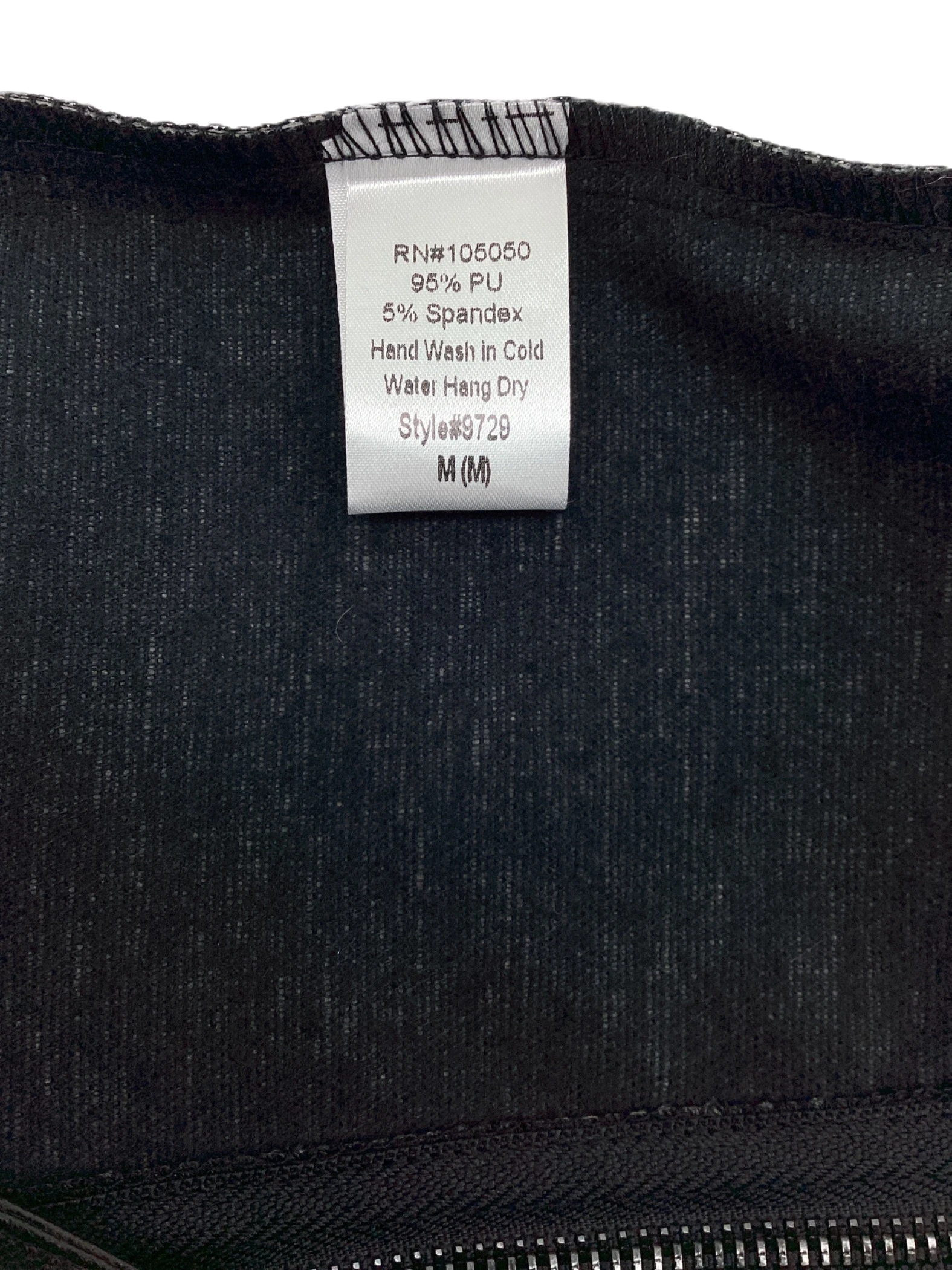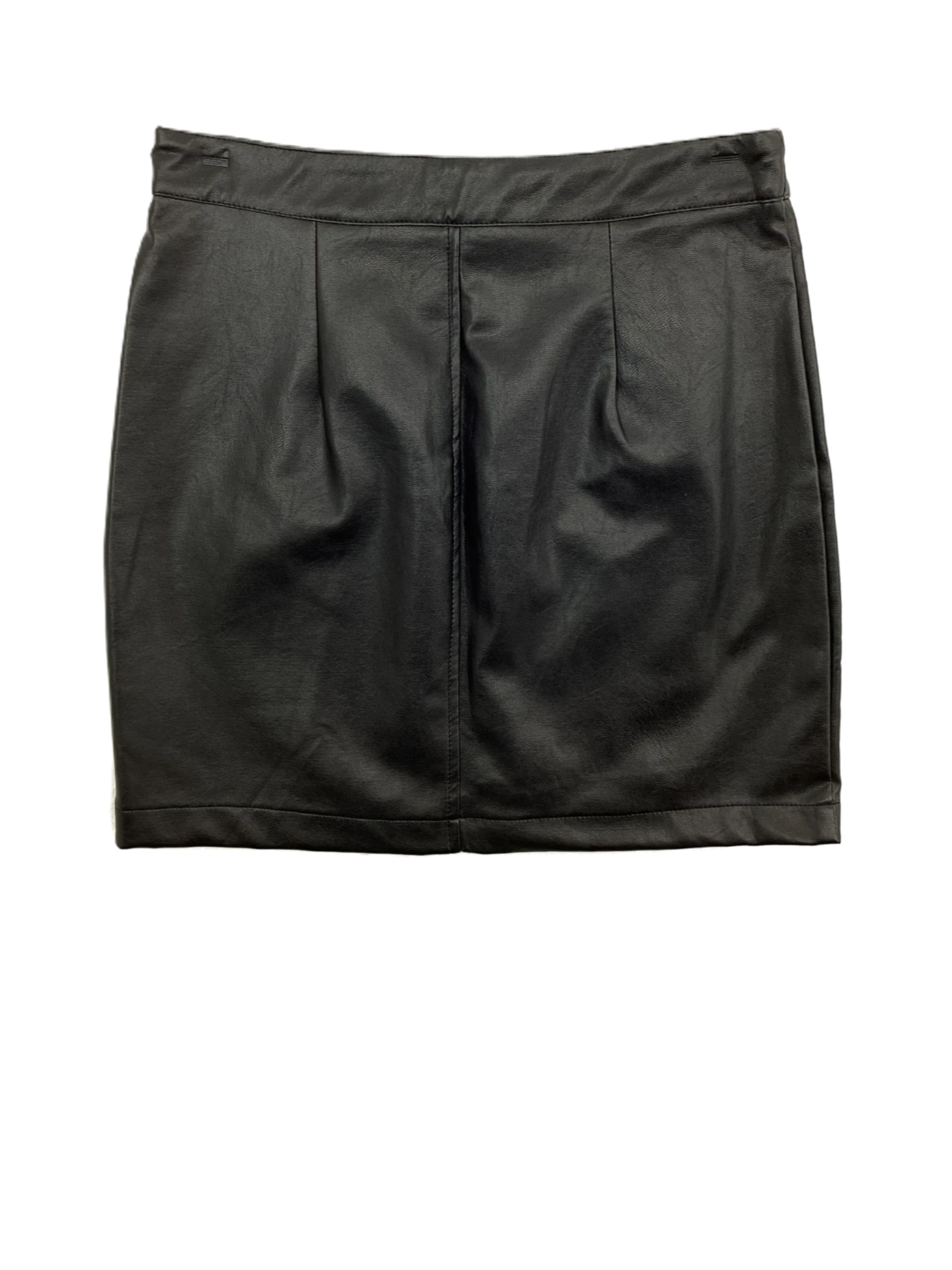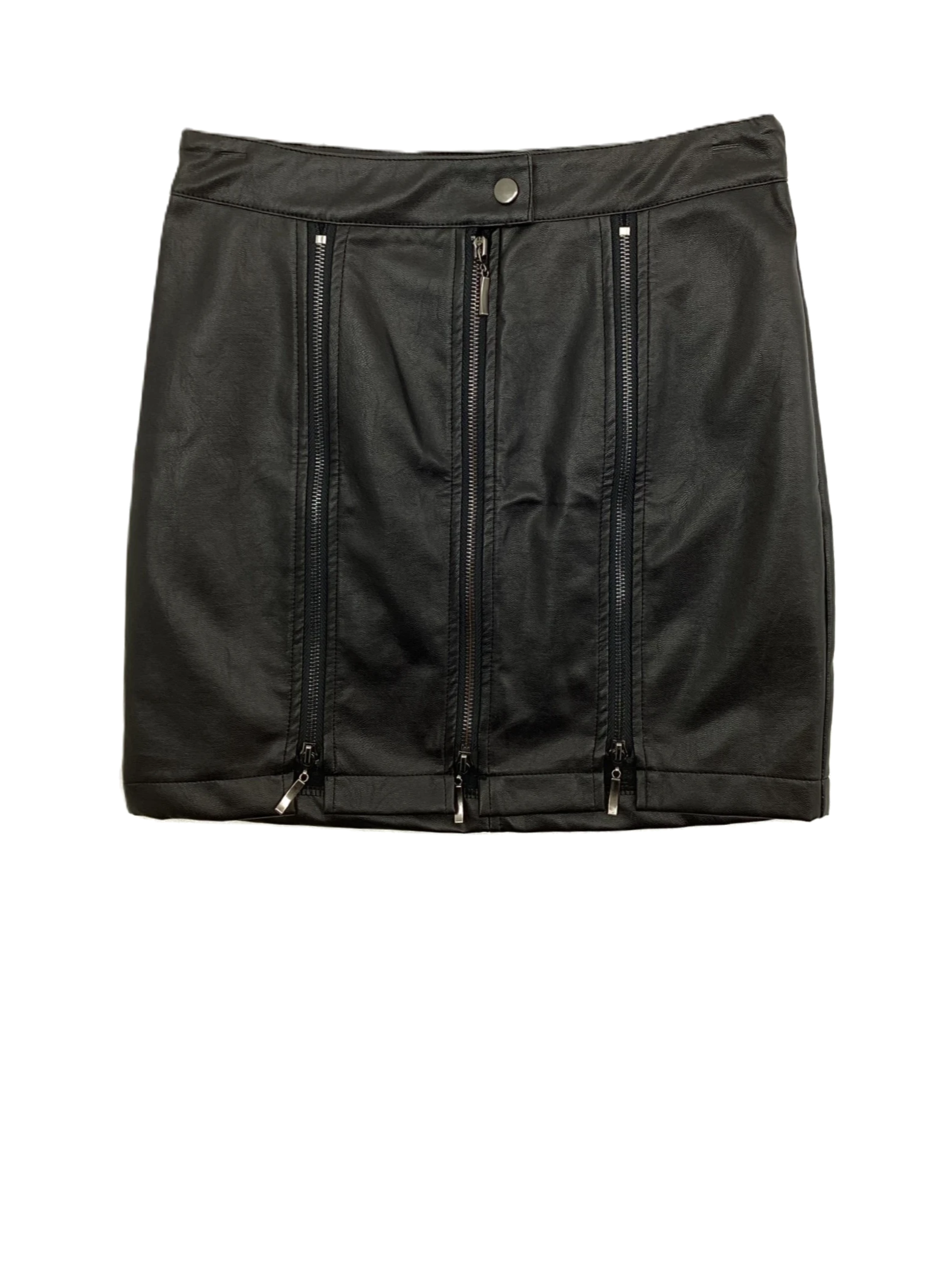 This is a pair of zippered front faux leather mini skirt.