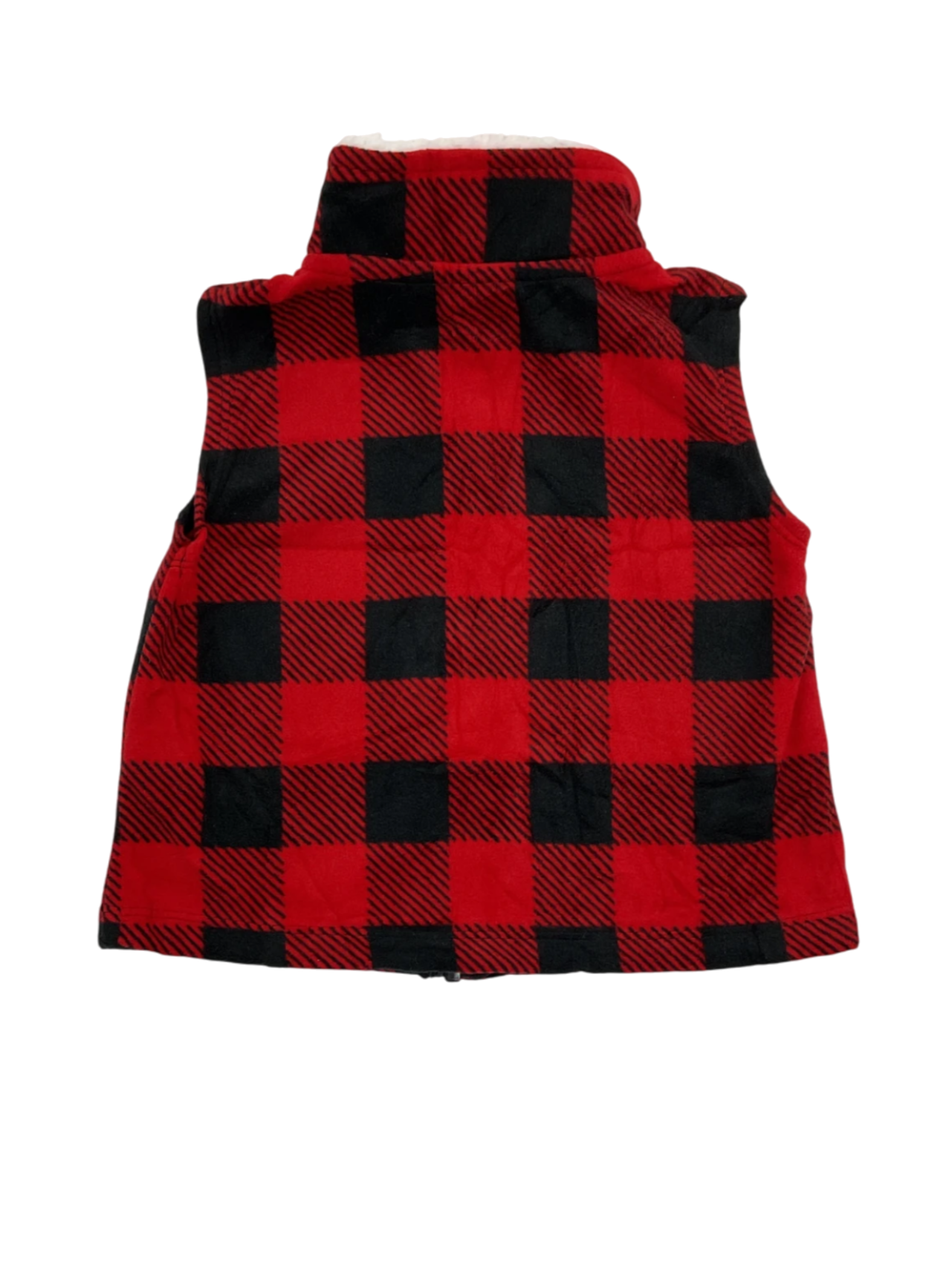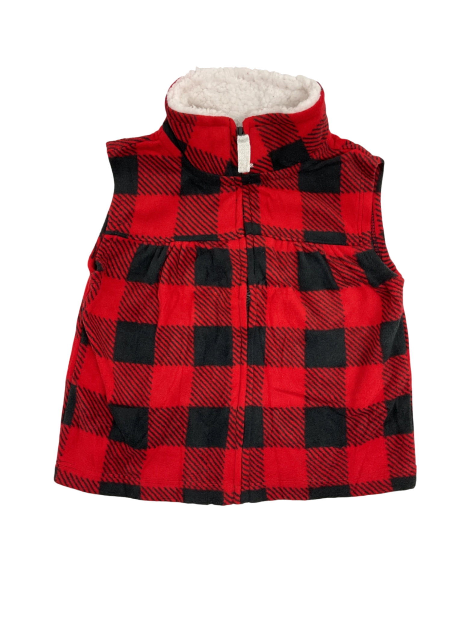 Red and black checkered vest for babies with a front zipper closure, sleeveless design, high neck, and size 12 months by Carter's.