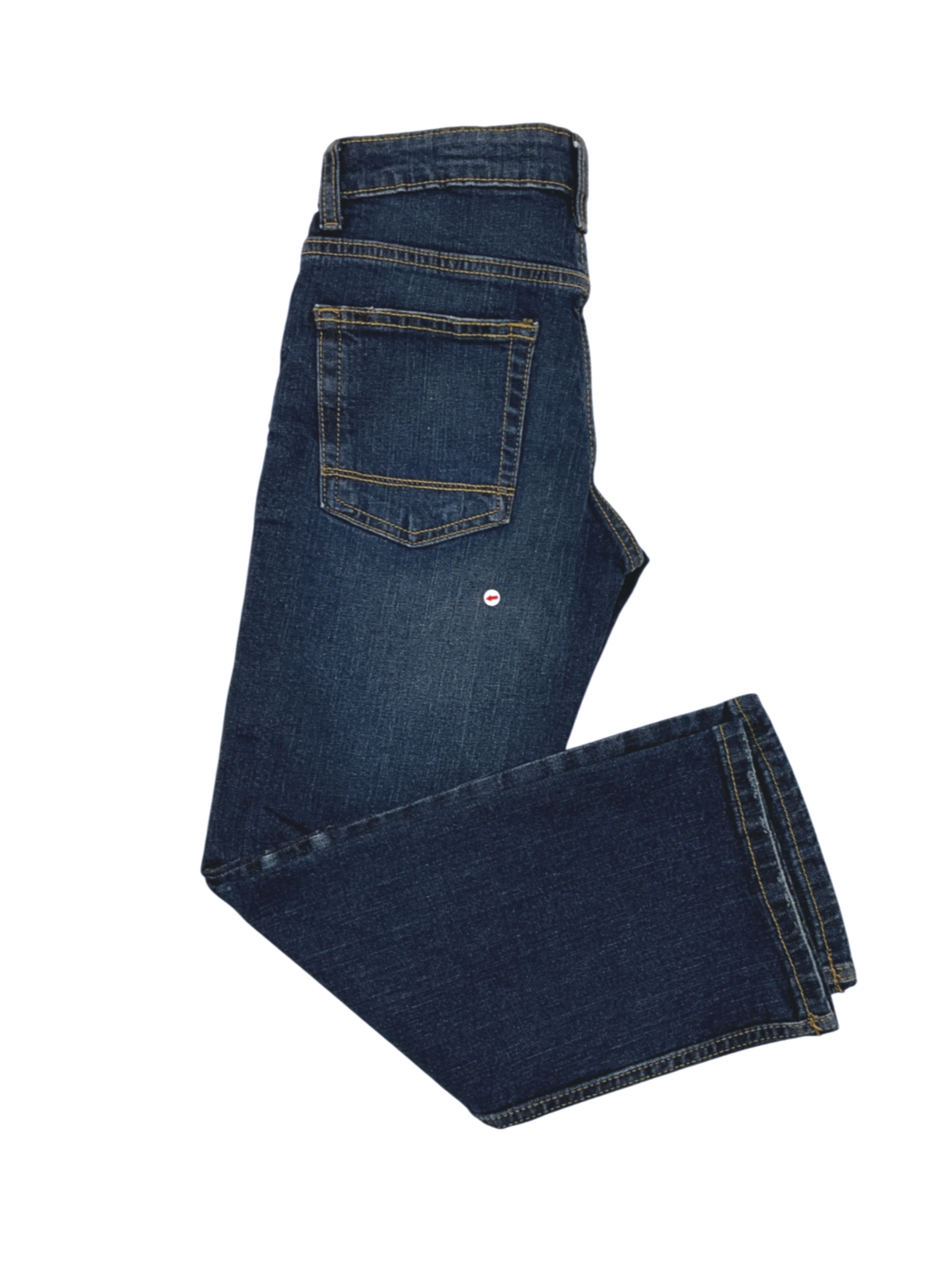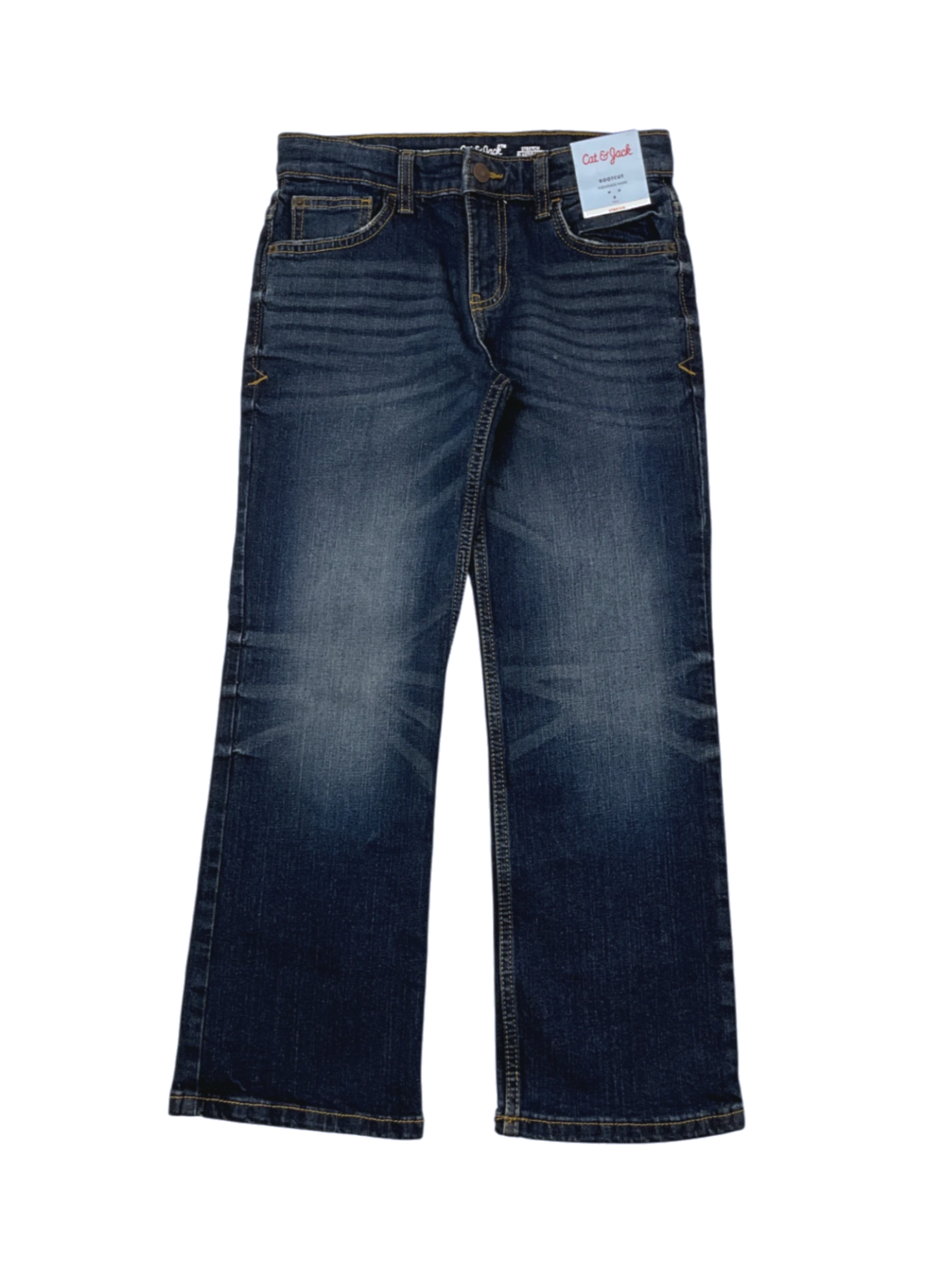 The jeans are boys' straight bootcut style, dark blue in color, and size 8, made by Cat & Jack.