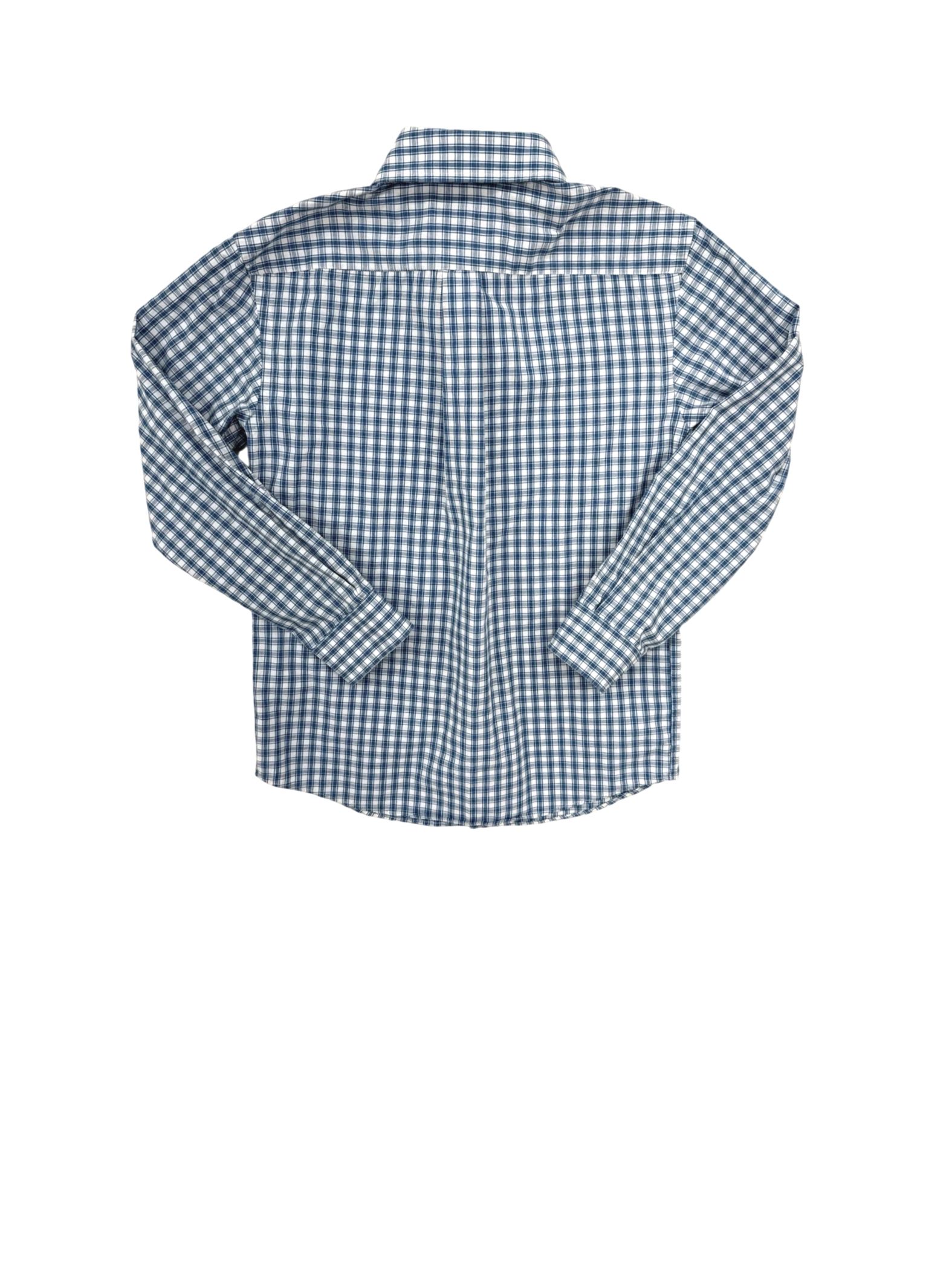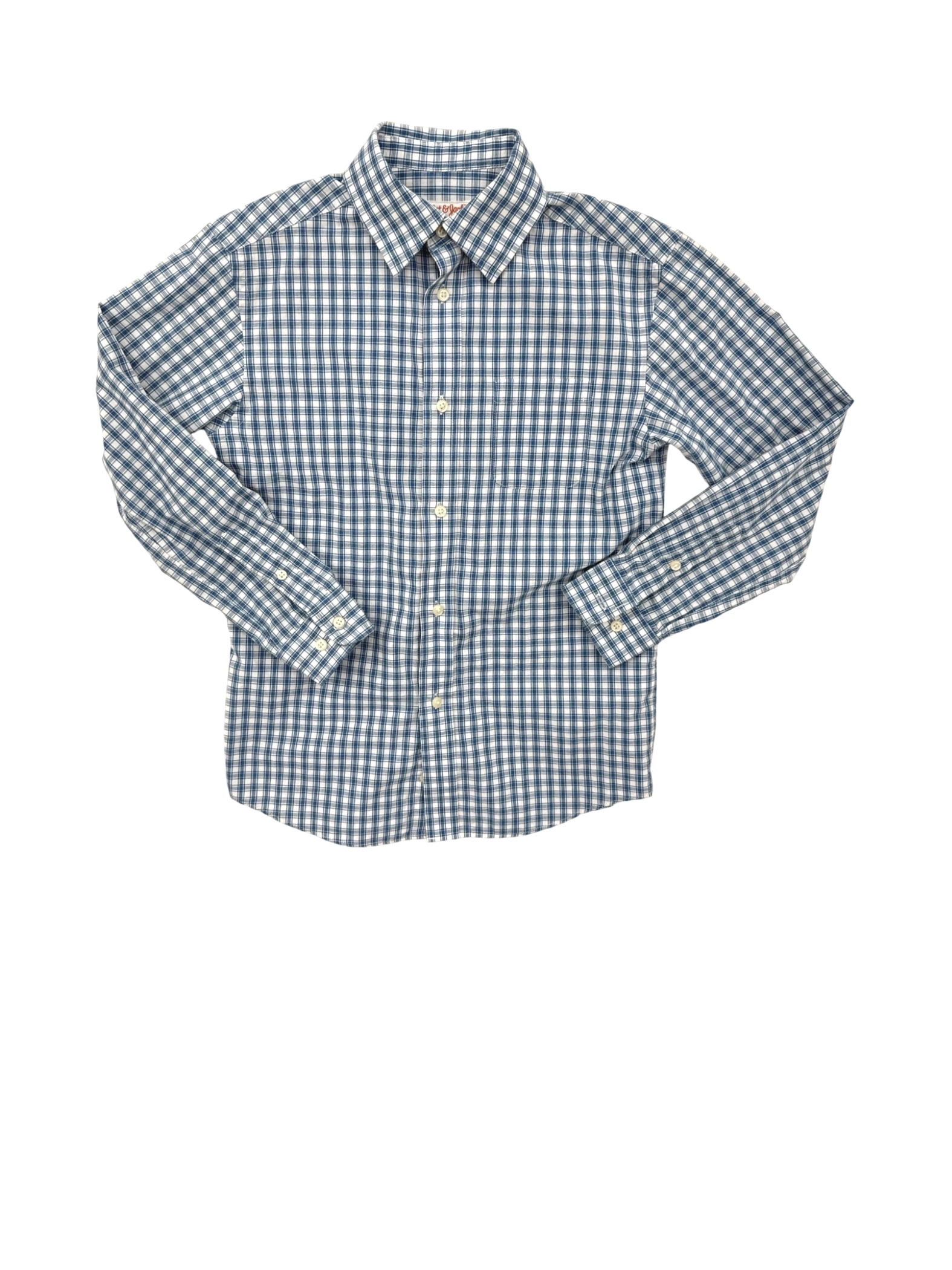 This stylish Cat & Jack boys' dress shirt is perfect for any occasion. Made from a comfortable blend of cotton and polyester, the shirt features a classic plaid pattern in blue and white. With a button-down closure and long sleeves, this shirt is both practical and fashionable. Ideal for layering or wearing on its own, it's a versatile addition to any young boy's wardrobe. In great condition, this pre-owned dress shirt is a great value.