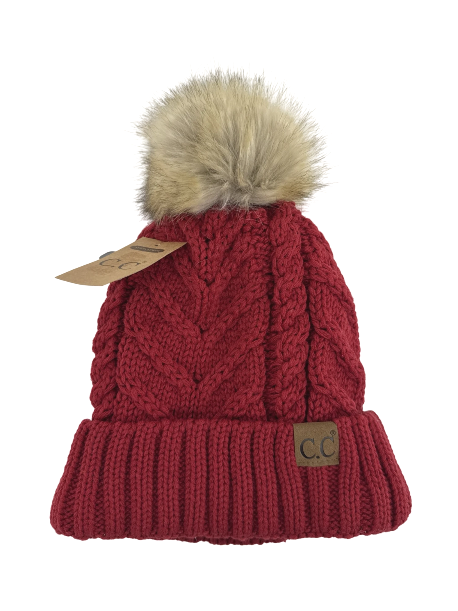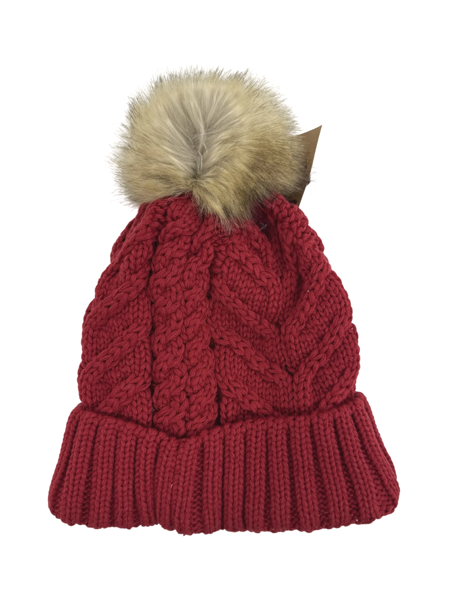 Cozy up in style with this pre-owned C.C hat! This warm hat is perfect for the fall and winter seasons, this hat features a chic cable knit design and a luxurious faux fur pom pom on top. Crafted from high-quality acrylic, ensuring both comfort and durability. Available in one size. A perfect addition to any winter wardrobe, this hat offers warmth and style. Pre-owned, but in excellent condition, it's a great way to add a fashionable touch to your cold-weather attire.