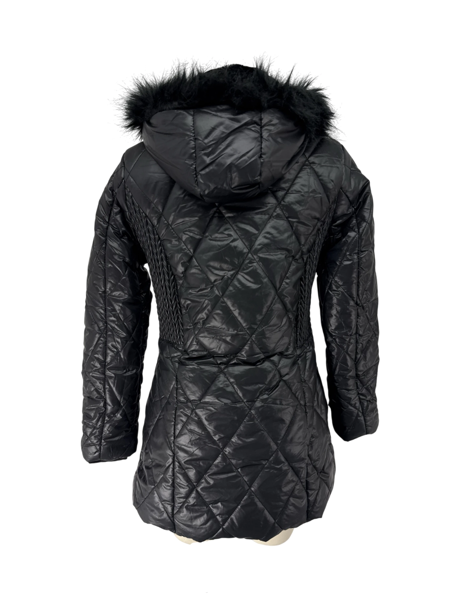 Stay warm and stylish with this pre-owned Celsius Premium black quilted puffer jacket with a faux fur trimmed hood. This jacket is perfect for cold weather, offering both warmth and a fashionable look. The quilted design adds a touch of elegance, while the faux fur provides extra comfort. It's a versatile piece, ideal for everyday wear or outdoor activities during the fall and winter seasons. Made with polyester for durability and ease of care.