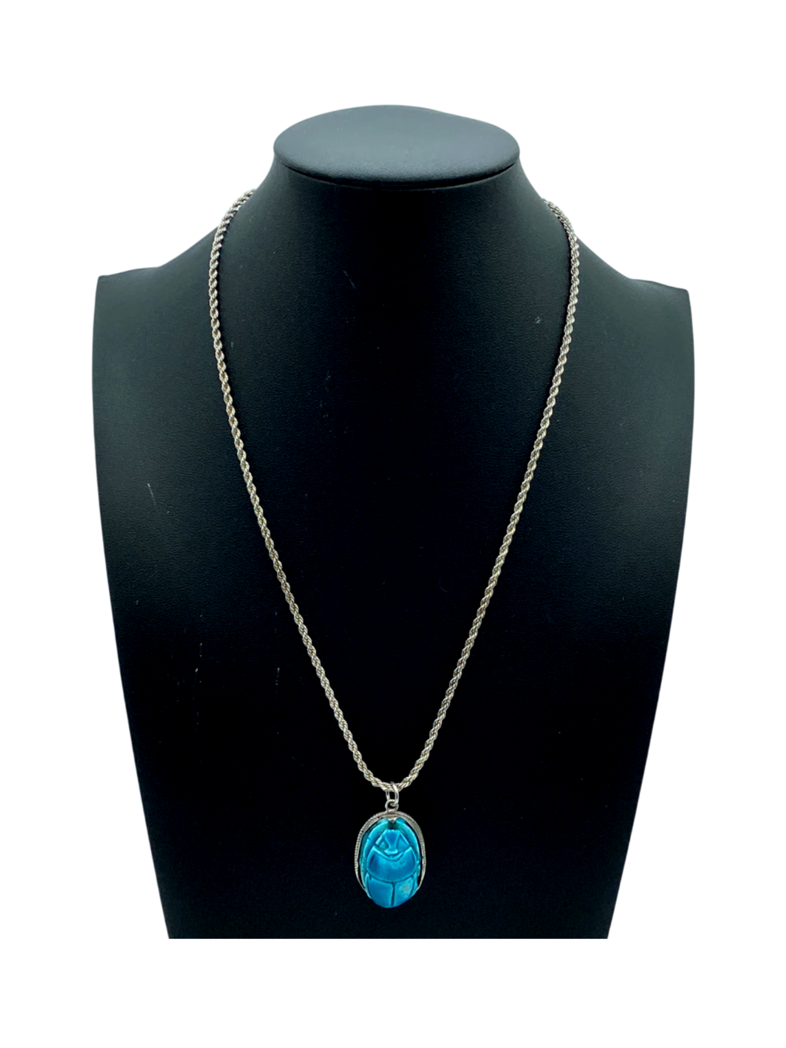 A 925 sterling silver curb chain with an Egyptian blue ceramic scarab pendant, 20 inches in length.