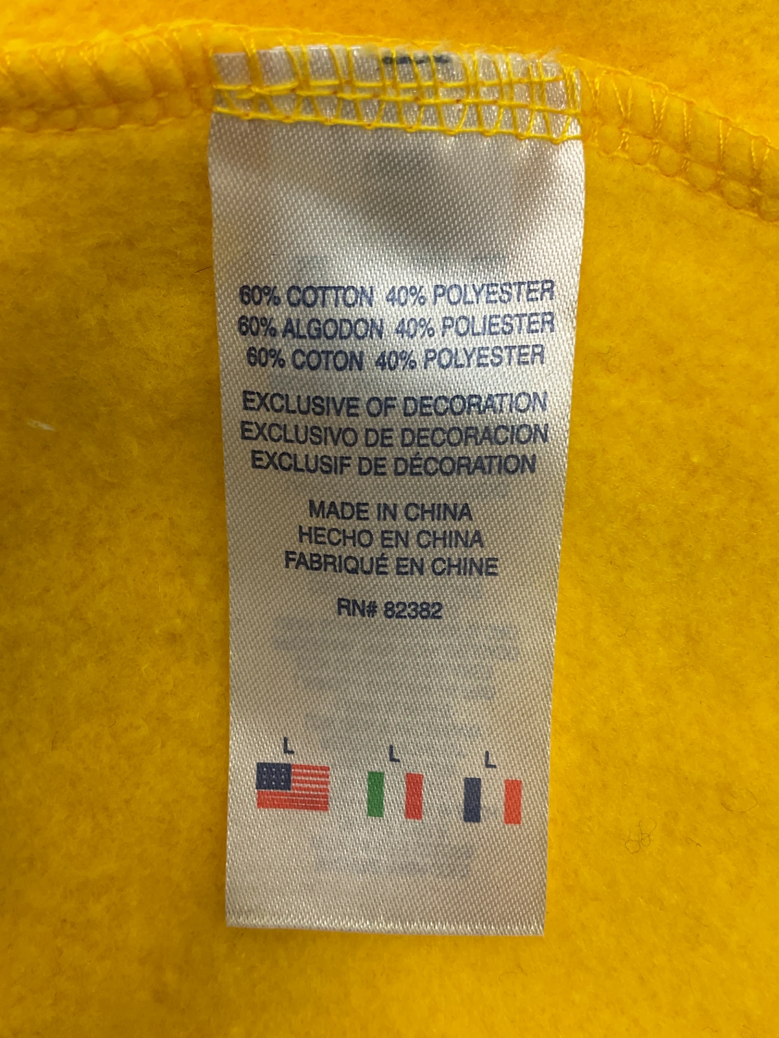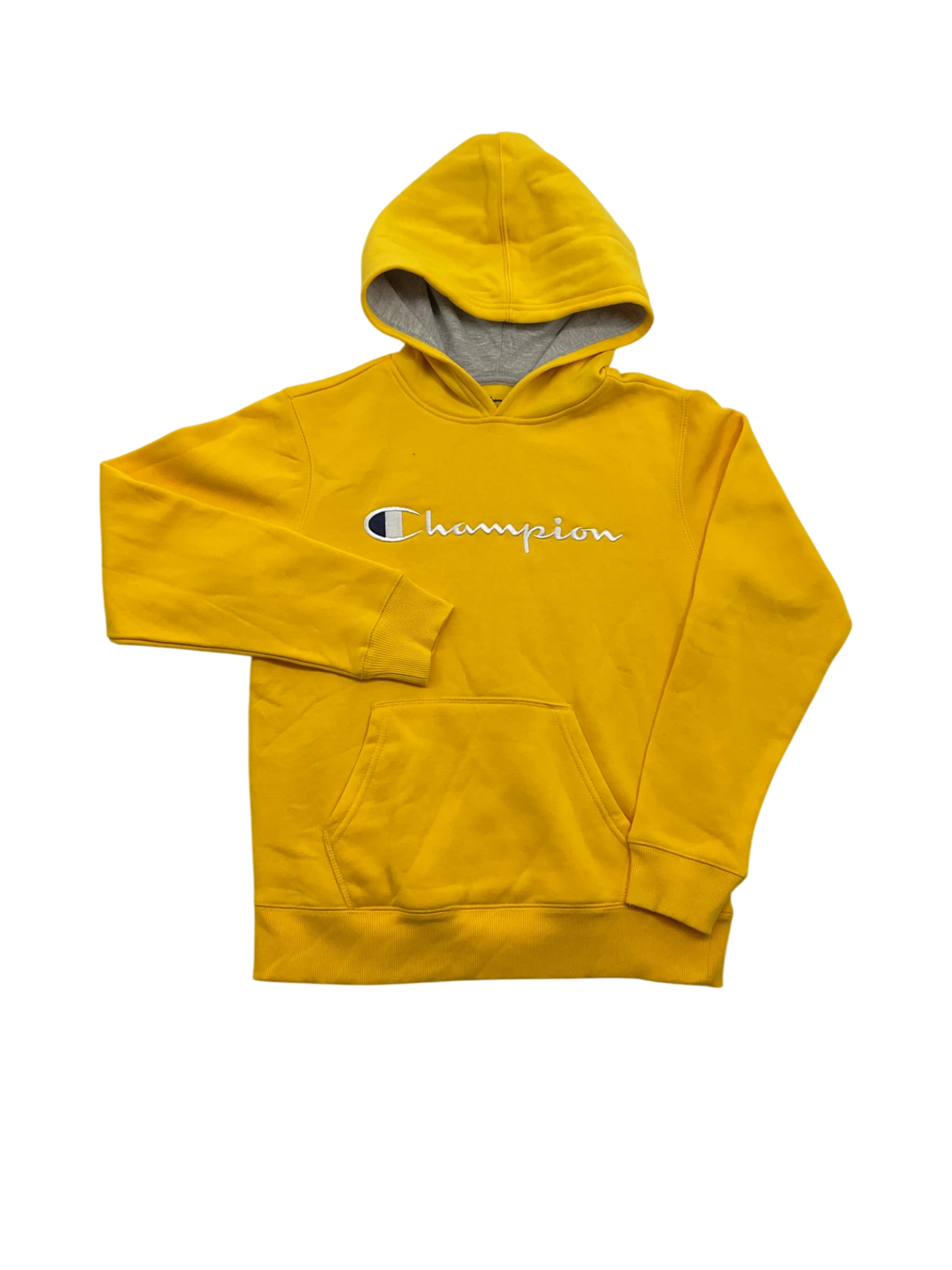 Yellow Champion hooded sweater for kids, size L, with embroidered kangaroo logo pocket.