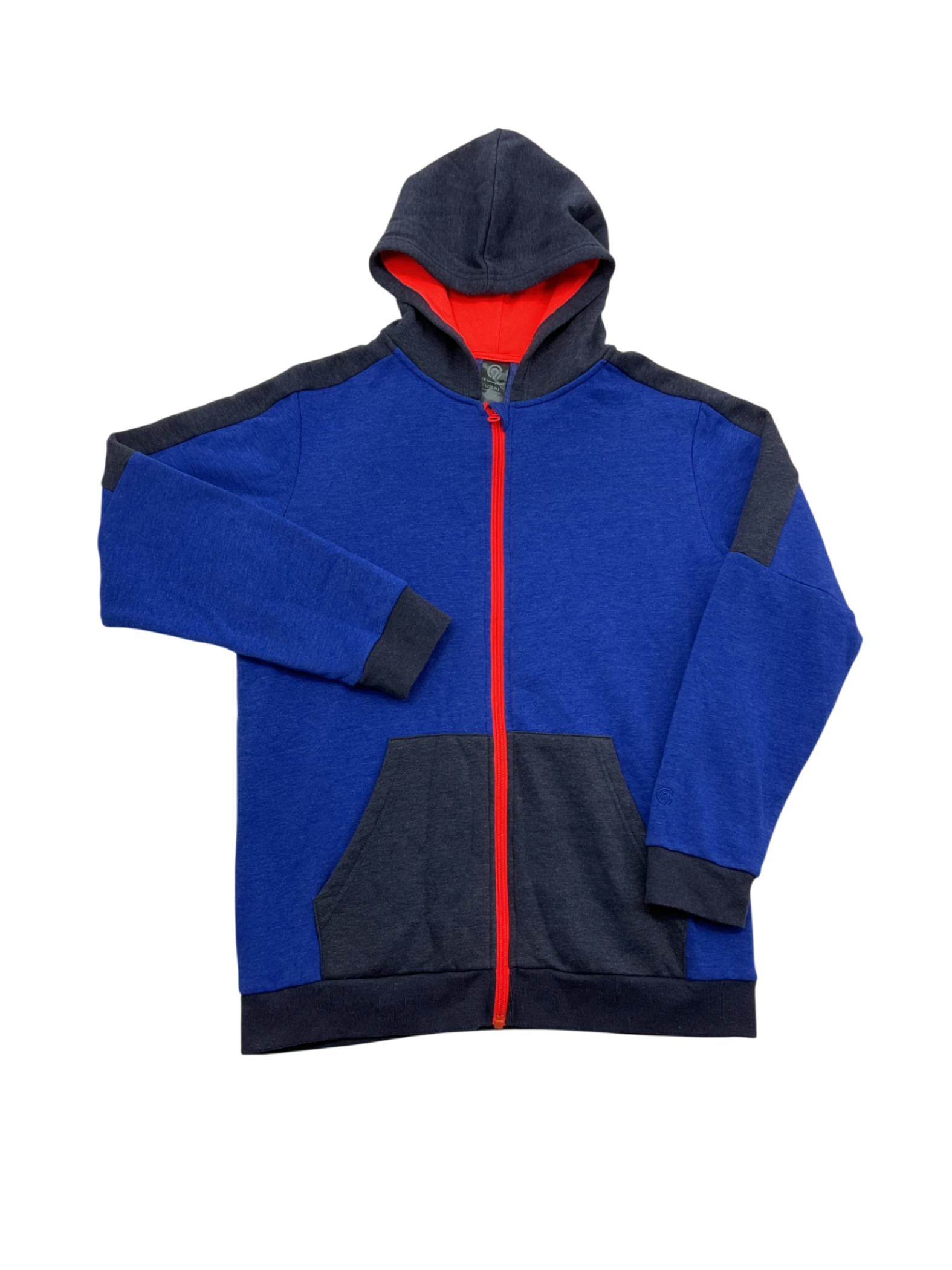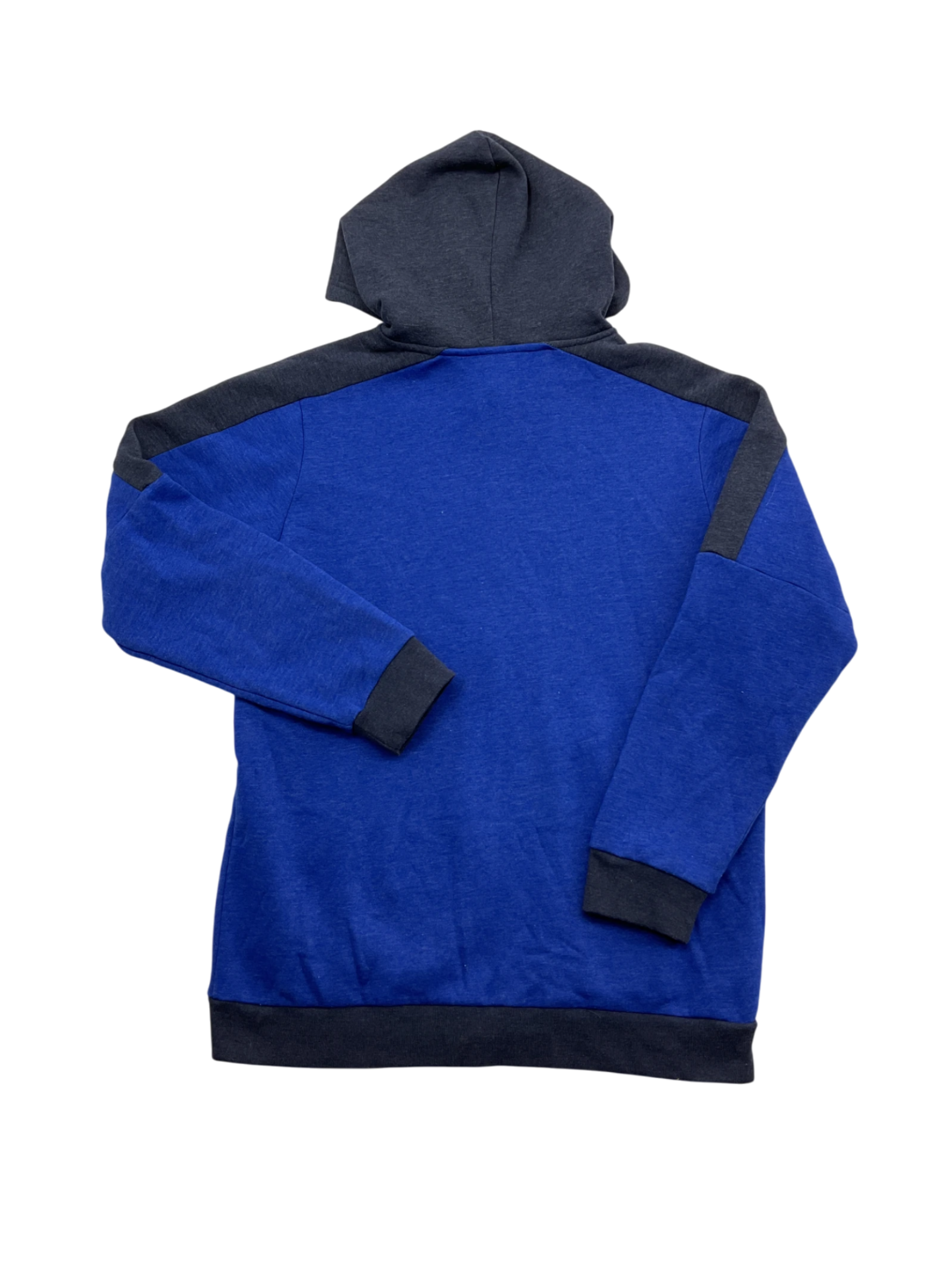 Blue and black children's jacket with zipper closure, long sleeves, and a hood.