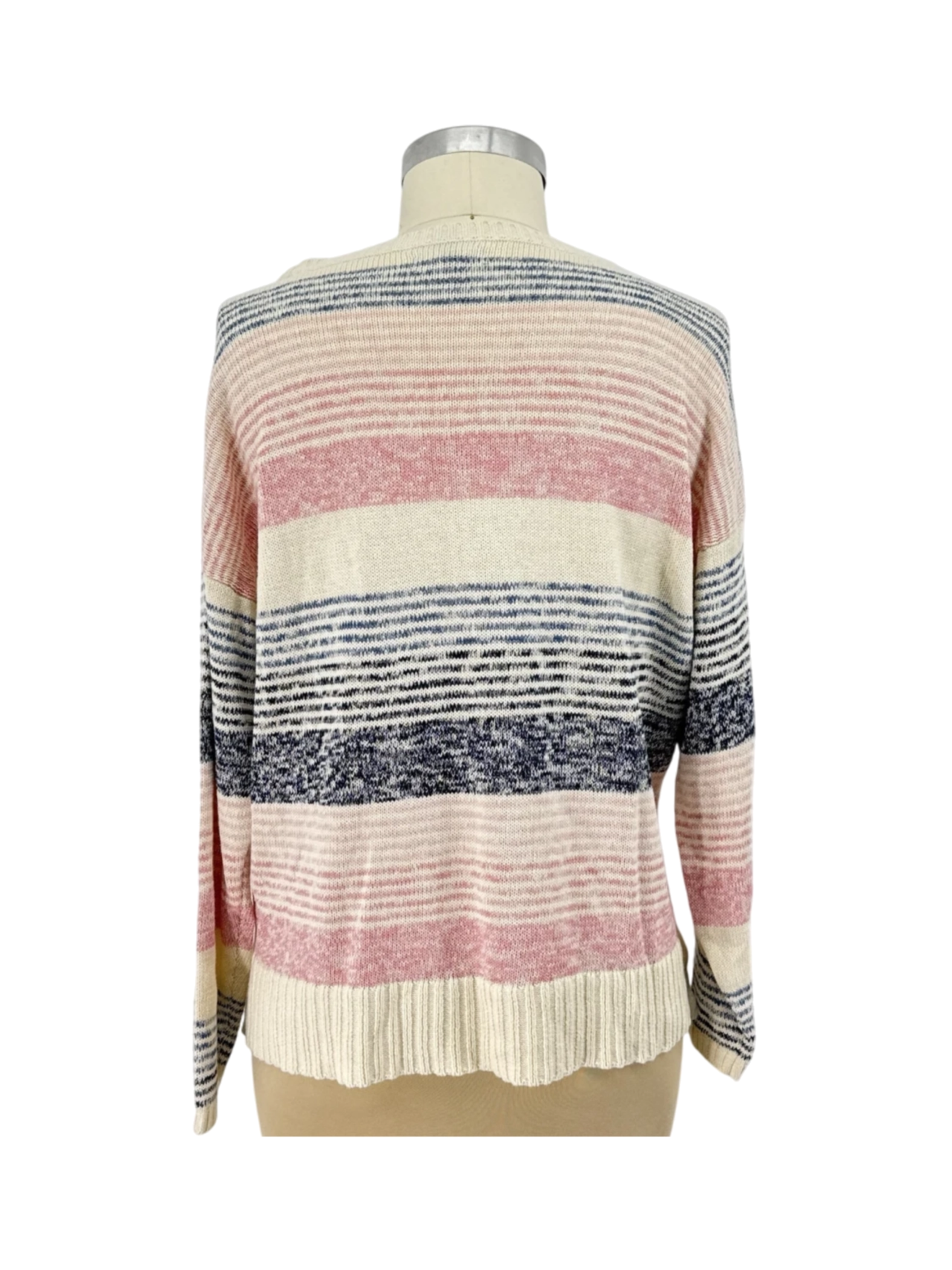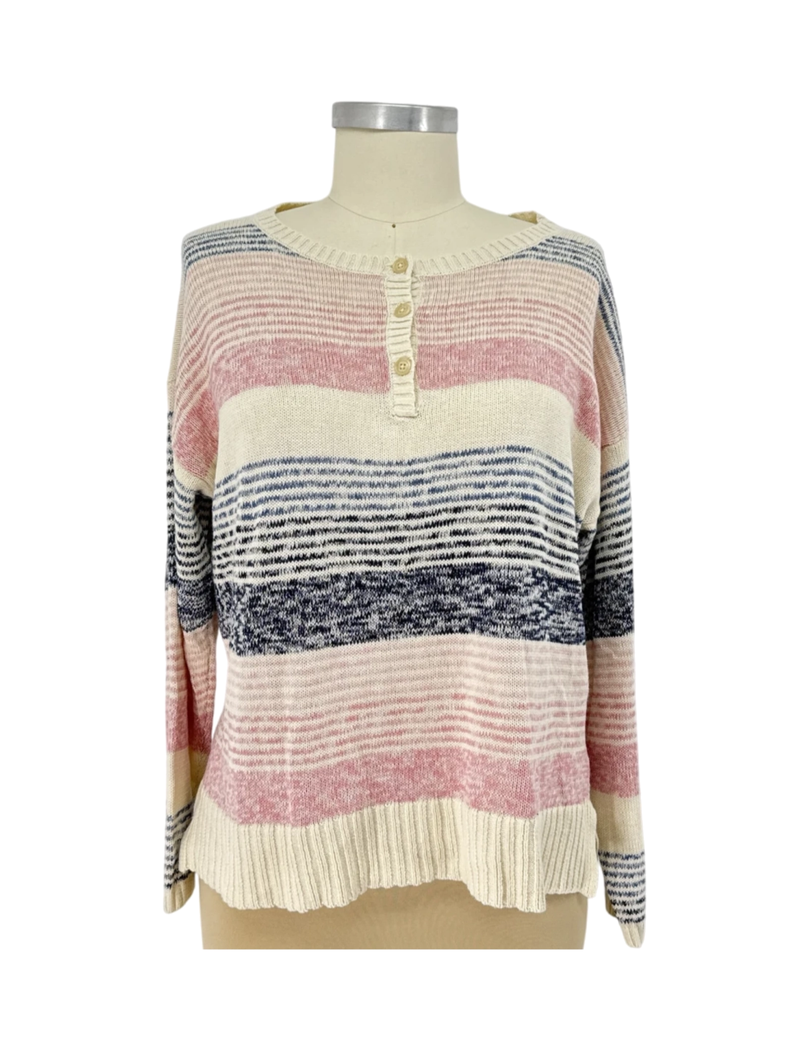 Women's pink, navy, and beige striped long sleeve henley sweater in size XXL.
