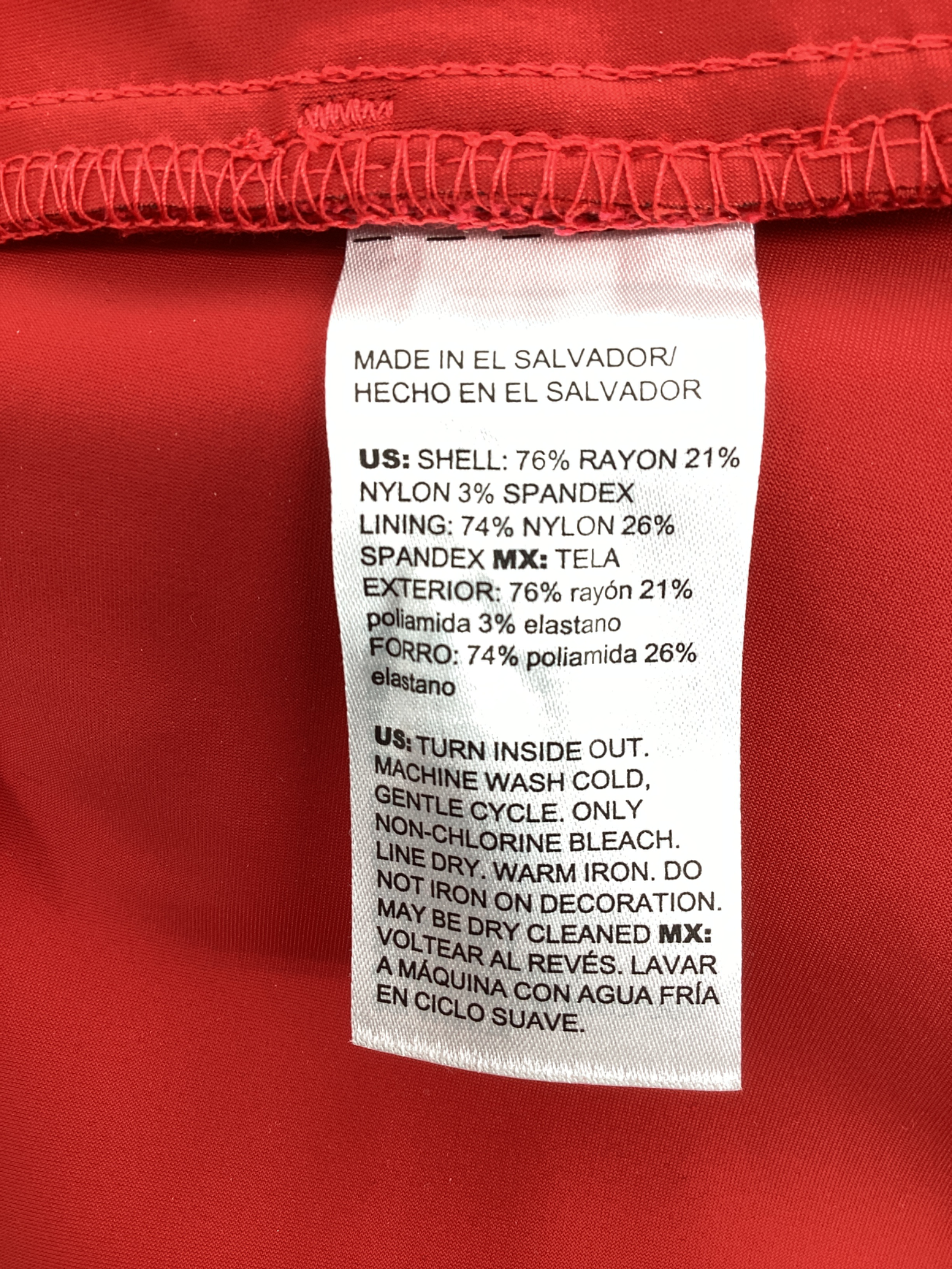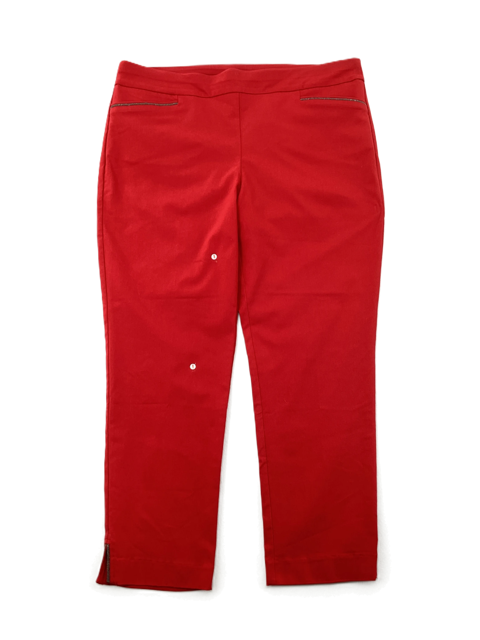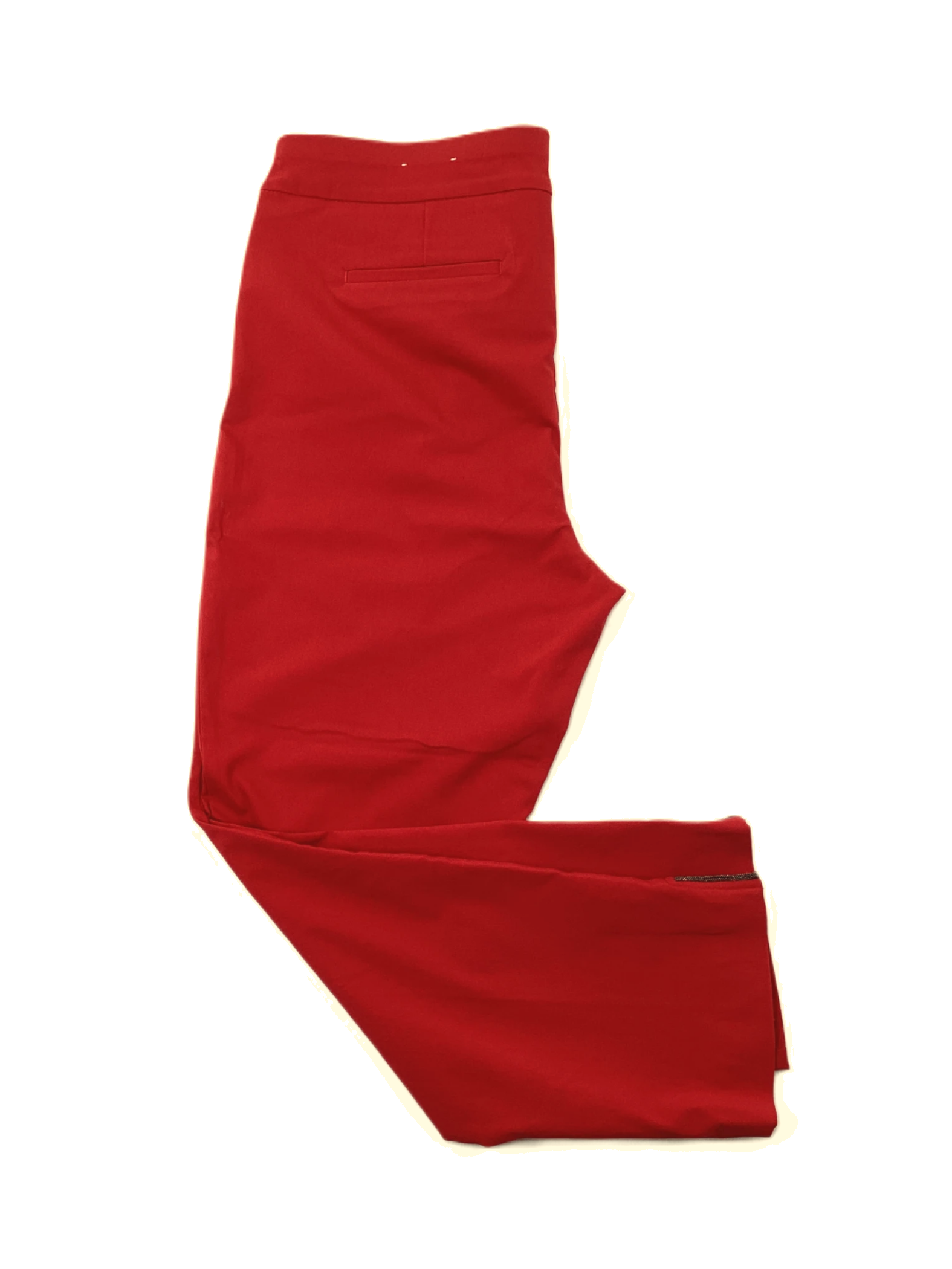 There are women's red dress pants available in size 16 Regular with a small ankle slit. Has a few smudge marks.
