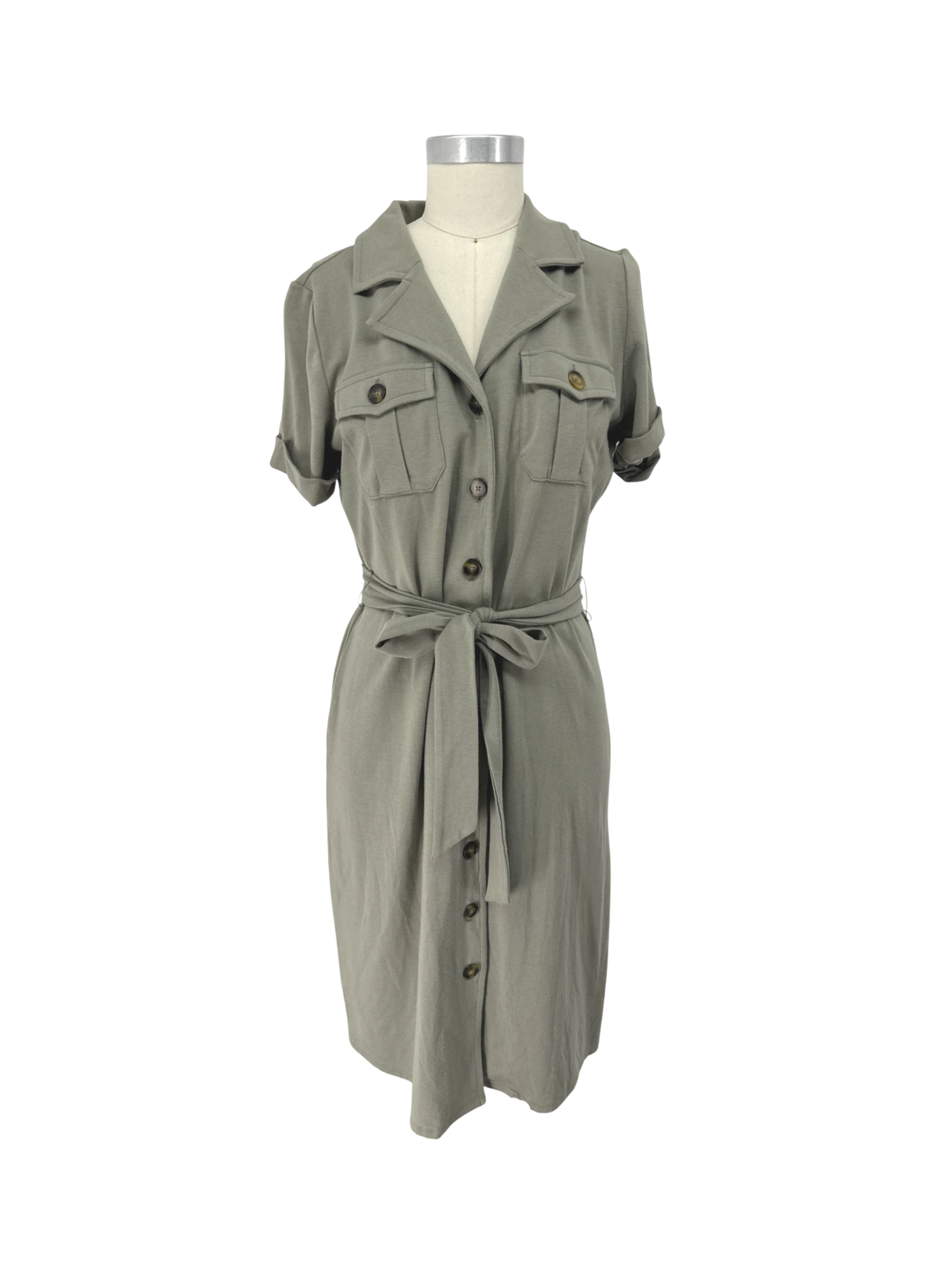 This pre-owned Chico's dress is a stylish and versatile addition to any wardrobe. Featuring a flattering A-line silhouette in a beautiful olive hue, it's perfect for a range of casual occasions. The dress includes a button-down front, convenient pockets, and a matching belt for a defined waist. Made from a comfortable blend of cotton, modal, and spandex, this dress offers both style and comfort. Its mid-length cut and short sleeves make it ideal for warmer weather. This dress embodies effortless chic.