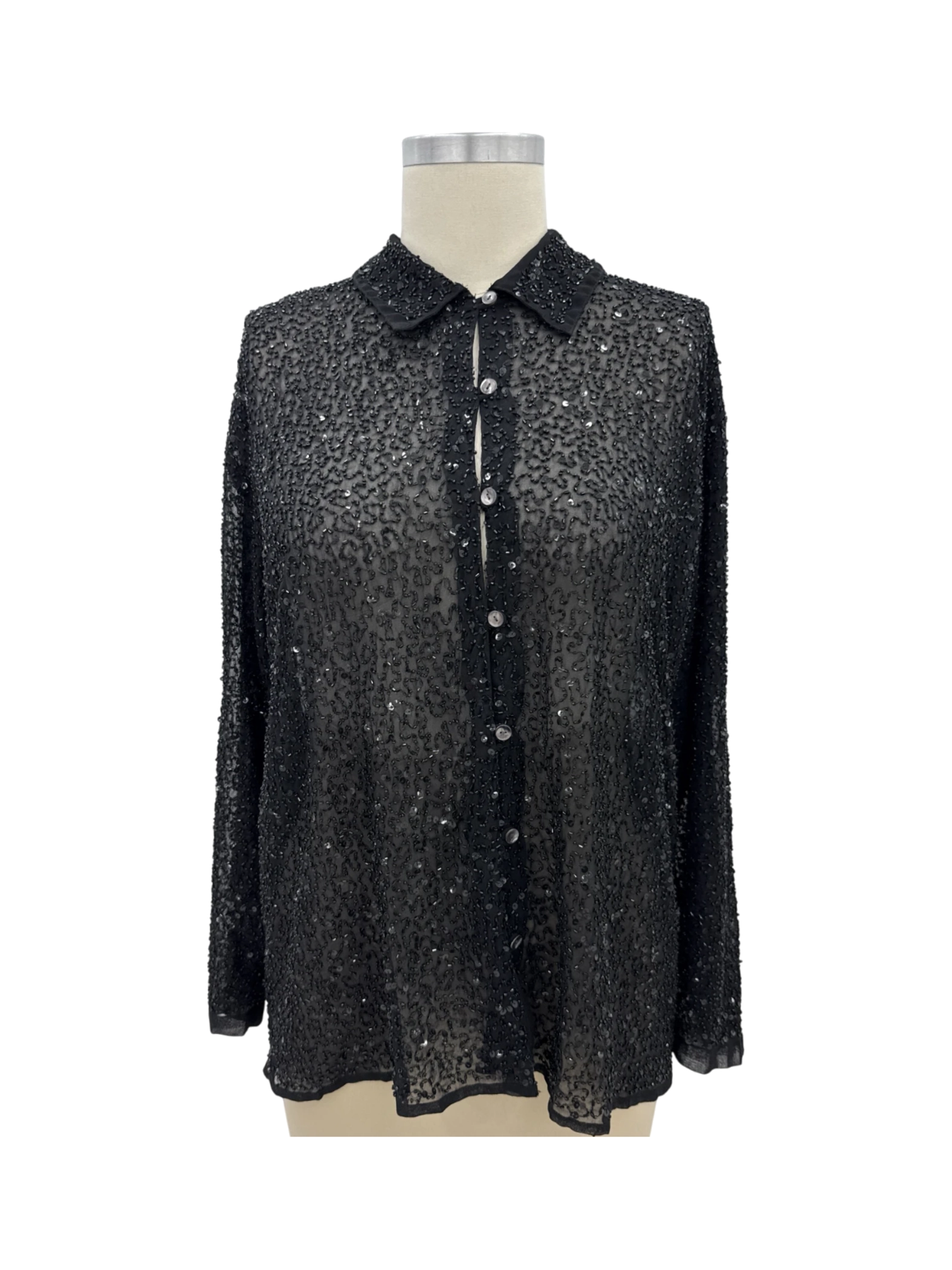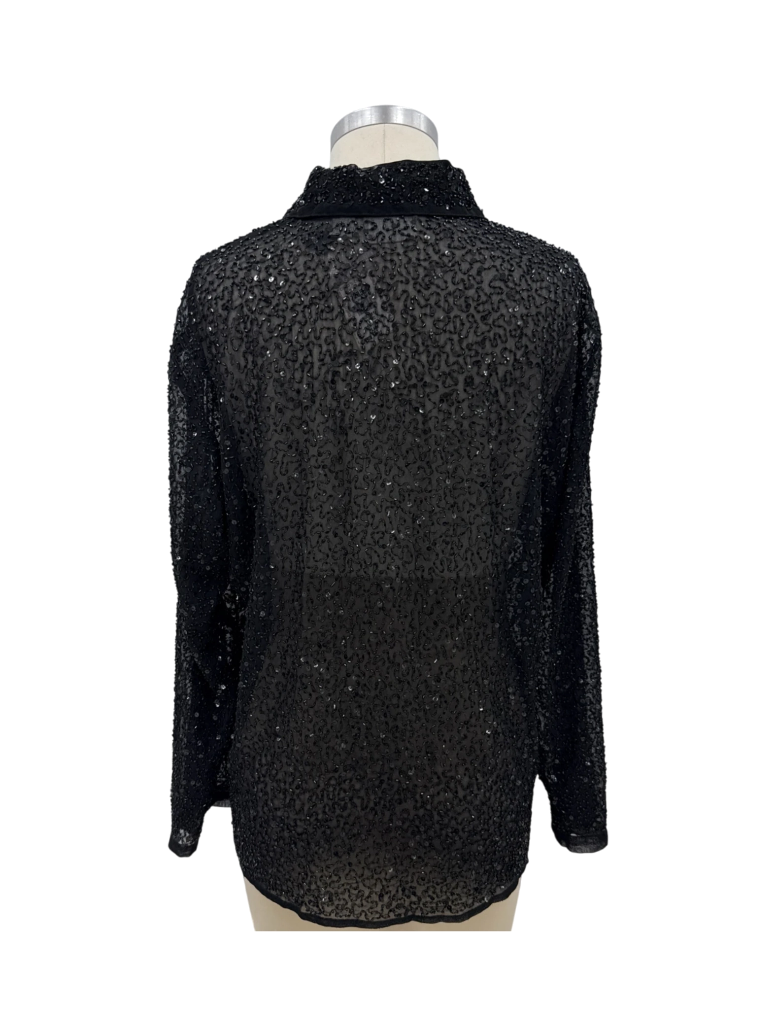 Elevate your evening wardrobe with this exquisite pre-owned Chico's Design top. This black button-up blouse is richly embellished with sequins, perfect for adding a touch of glamour to any outfit. Crafted from 100% polyester, this blouse offers both comfort and style. Featuring a classic collar and long sleeves, this top is ideal for cooler weather and pairs well with a variety of bottoms. A beautiful, unique, one-of-a-kind, vintage top, perfect for parties or special occasions.
