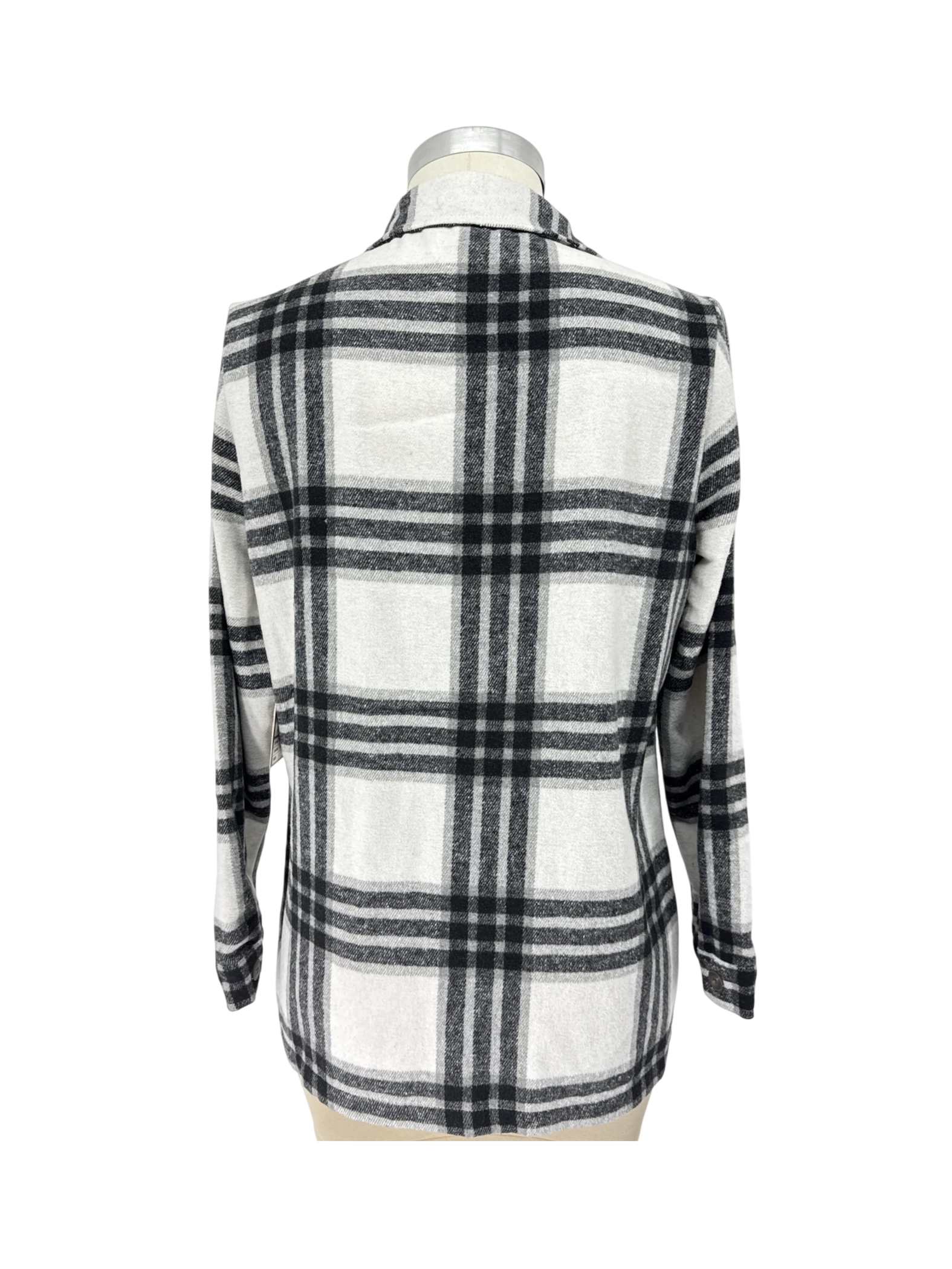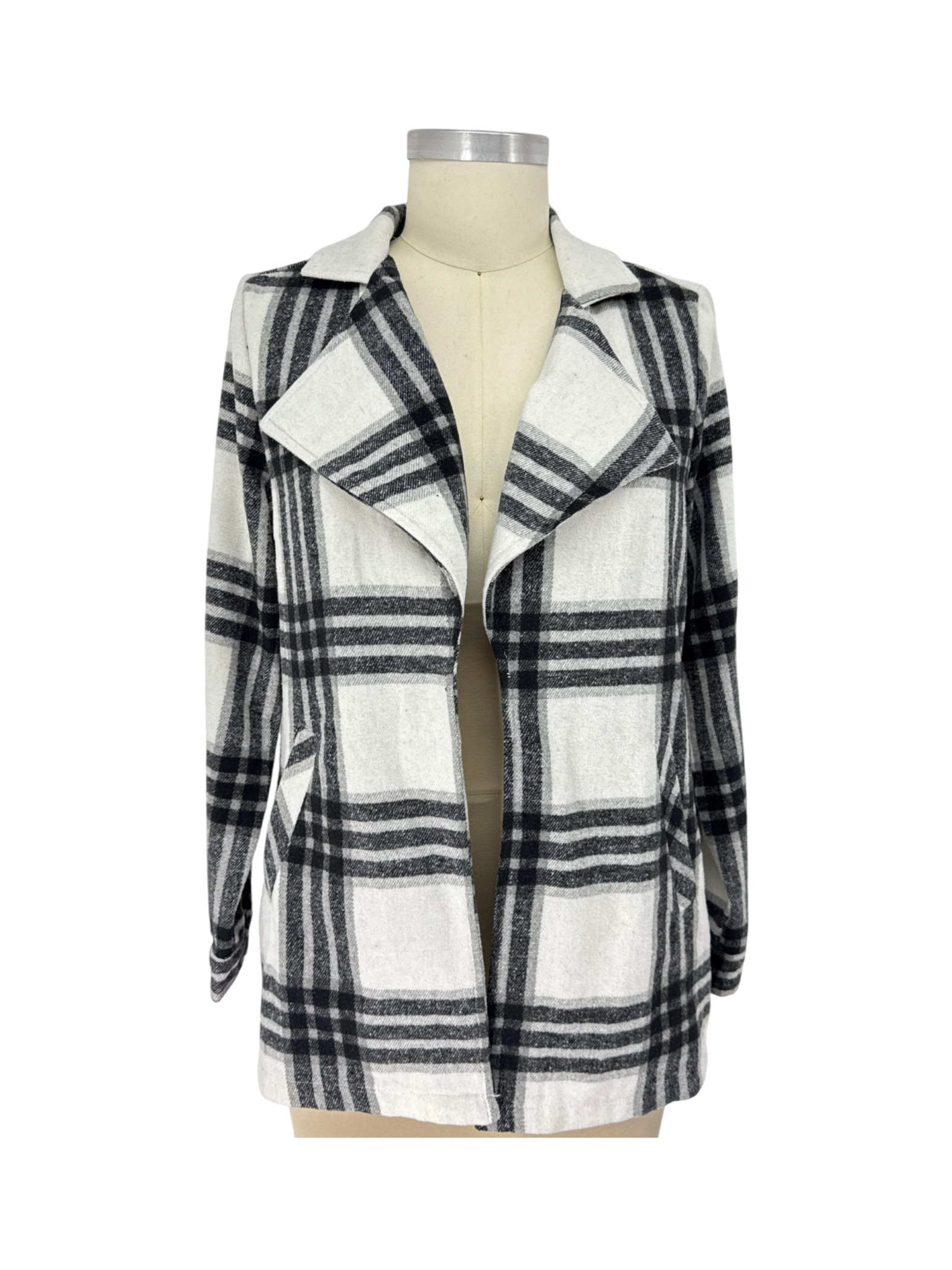 This CI SONO plaid blazer is a stylish and versatile addition to any wardrobe. Featuring a classic black and white plaid pattern, this jacket is perfect for adding a touch of sophistication to any outfit. Crafted from a comfortable cotton and polyester blend, this blazer is ideal for everyday wear. The open-front design and long sleeves make it a great layering piece for fall, winter and spring. This pre-owned piece offers both style and comfort.