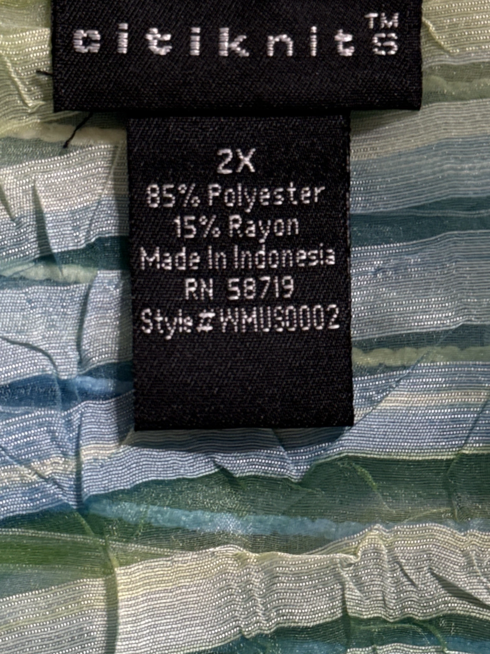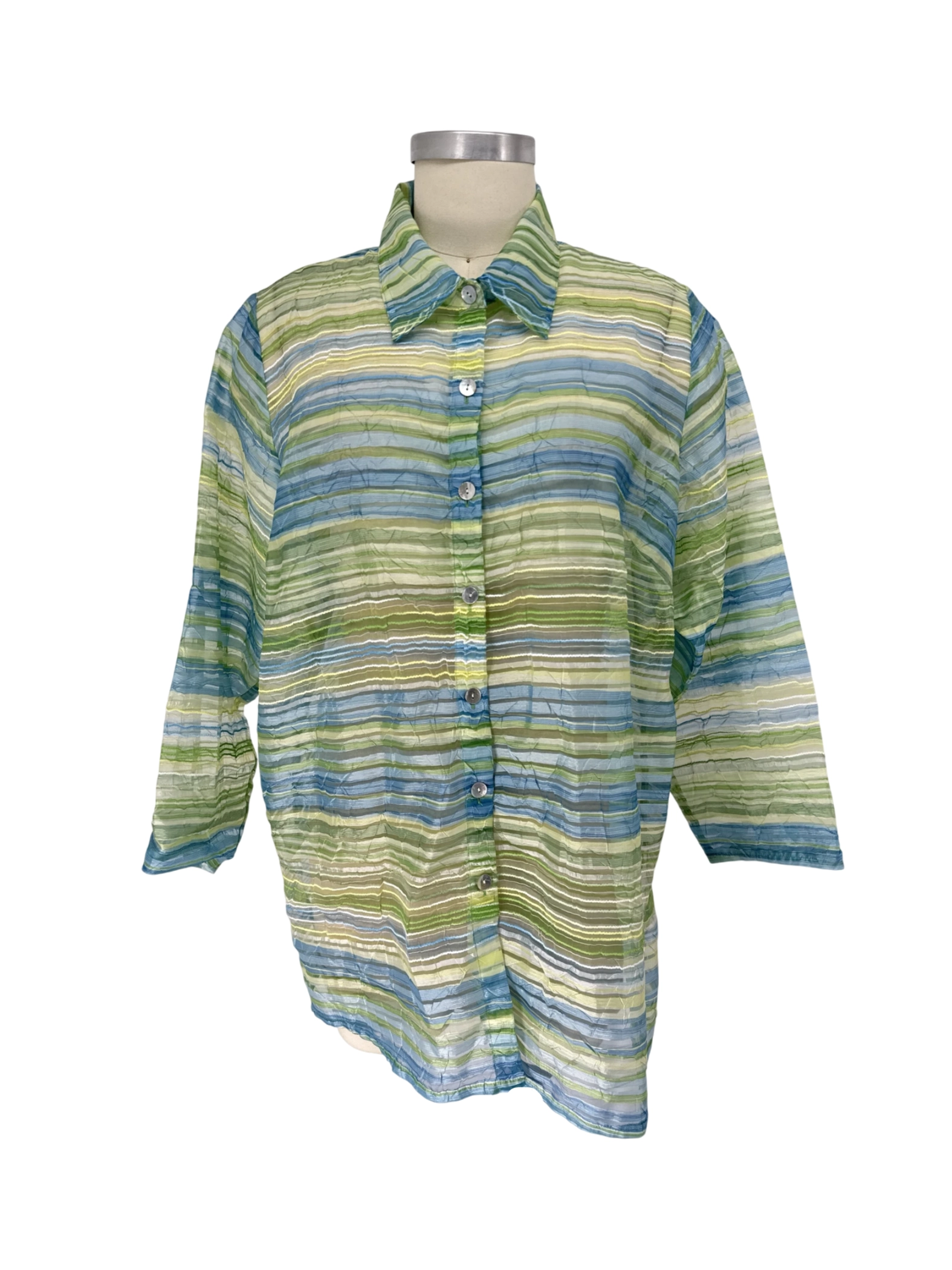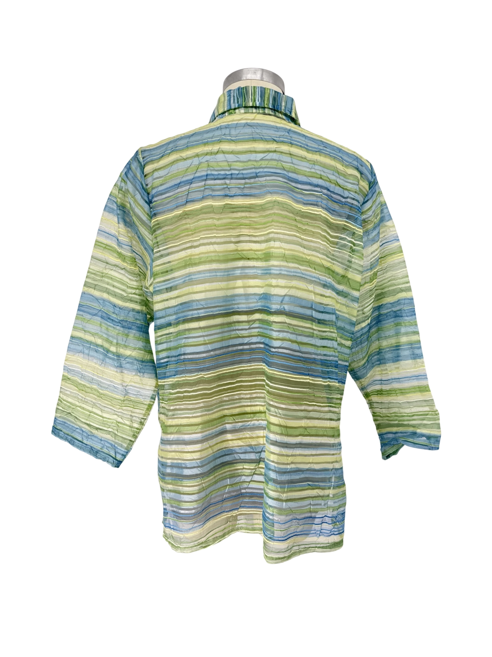 This pre-owned citiknits blouse is perfect for a warm day. Featuring a unique striped pattern in a mix of green, blue, and yellow, this top offers a breezy fit. With a classic collar, button-up front, and three-quarter sleeves, it's a versatile piece suitable for casual or semi-formal occasions. Made with a blend of polyester and rayon, it provides a comfortable and lightweight feel. Add a touch of effortless style to your wardrobe with this vibrant and stylish blouse.