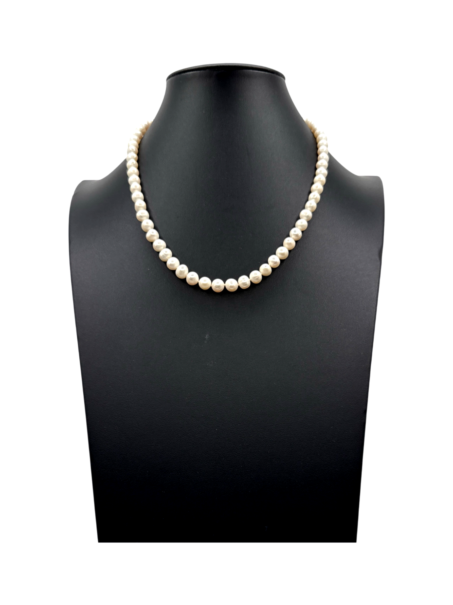 A classic and elegant necklace, this pre-owned pearl necklace exudes timeless beauty. The necklace features lustrous white pearls, strung together to create a sophisticated piece of jewelry. Perfect for adding a touch of class to any outfit, from casual to formal, this choker necklace is a versatile accessory that will elevate your style. A beautiful addition to any jewelry collection.