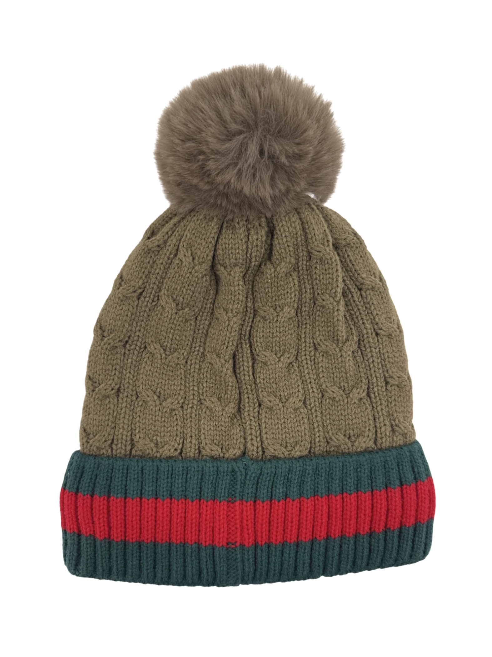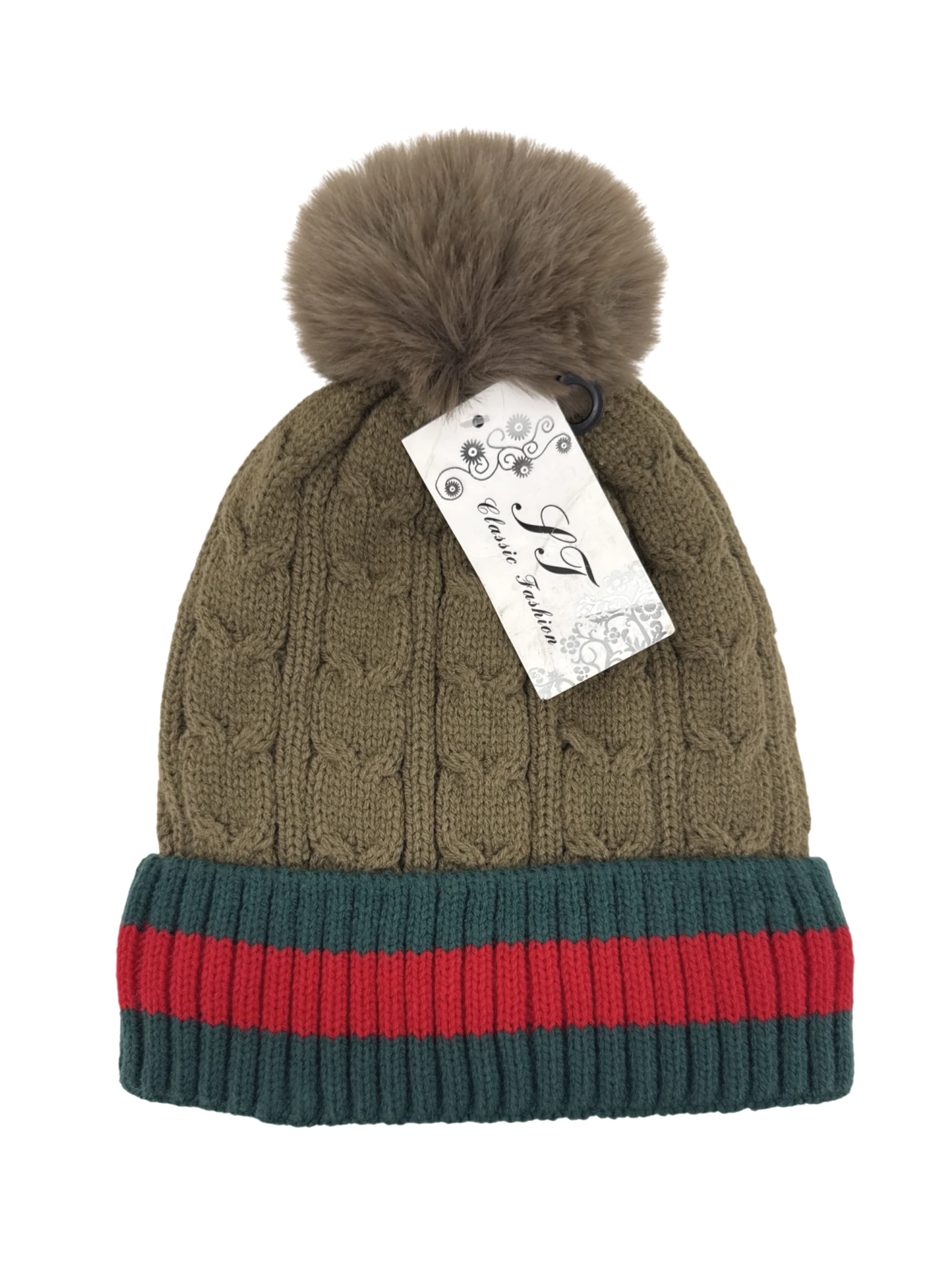 Stay warm and stylish this winter with this pre-owned Classic Fashion knit beanie! The cozy hat features a classic cable knit design, accented with a faux fur pom-pom. The hat showcases a vibrant green, red and dark green color block and a striped design. Crafted from soft and durable acrylic, this beanie is perfect for keeping you comfortable. This hat is a perfect addition to any cold-weather wardrobe, ideal for adding a touch of warmth and style.