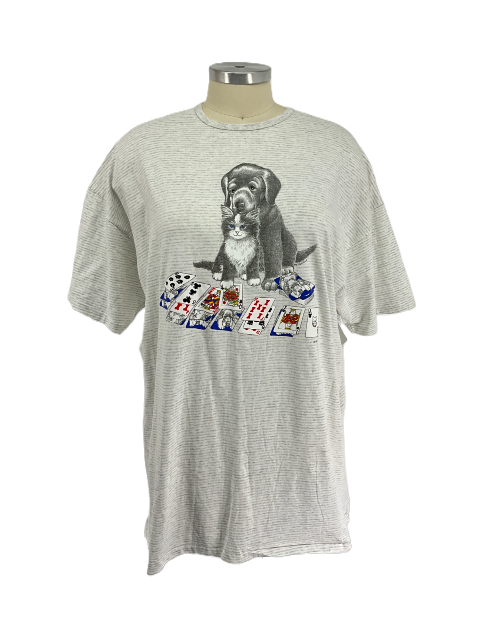 Graphic t-shirt featuring a dog and cat design, available in size 2XL for men.