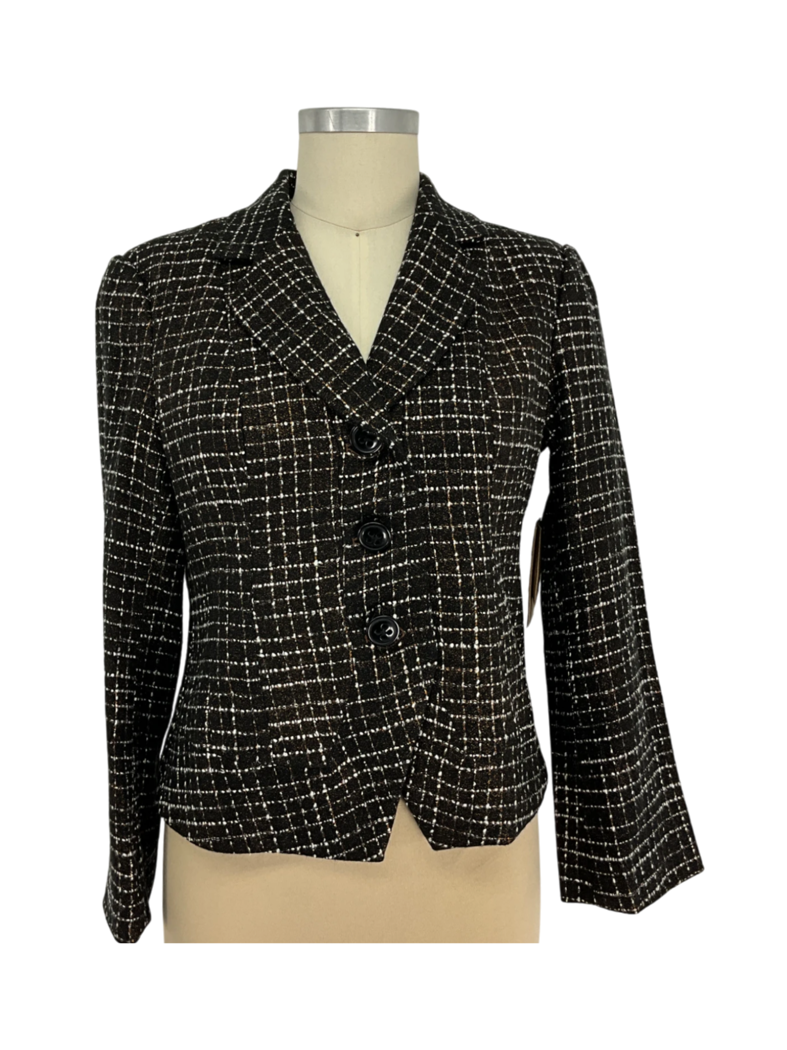 This stylish blazer from Coldwater Creek has a classic black and white tweed pattern, making it perfect for adding a touch of sophistication to any outfit.