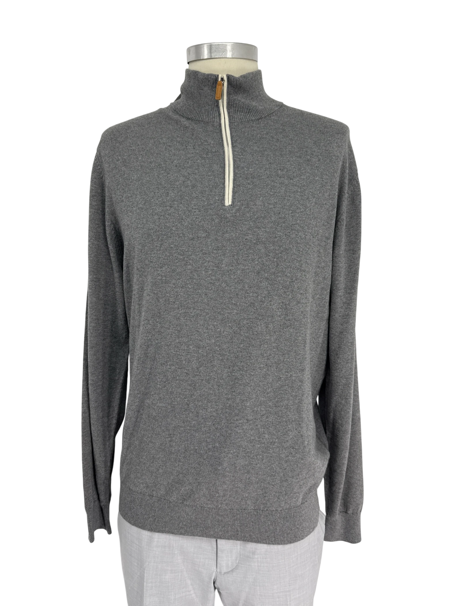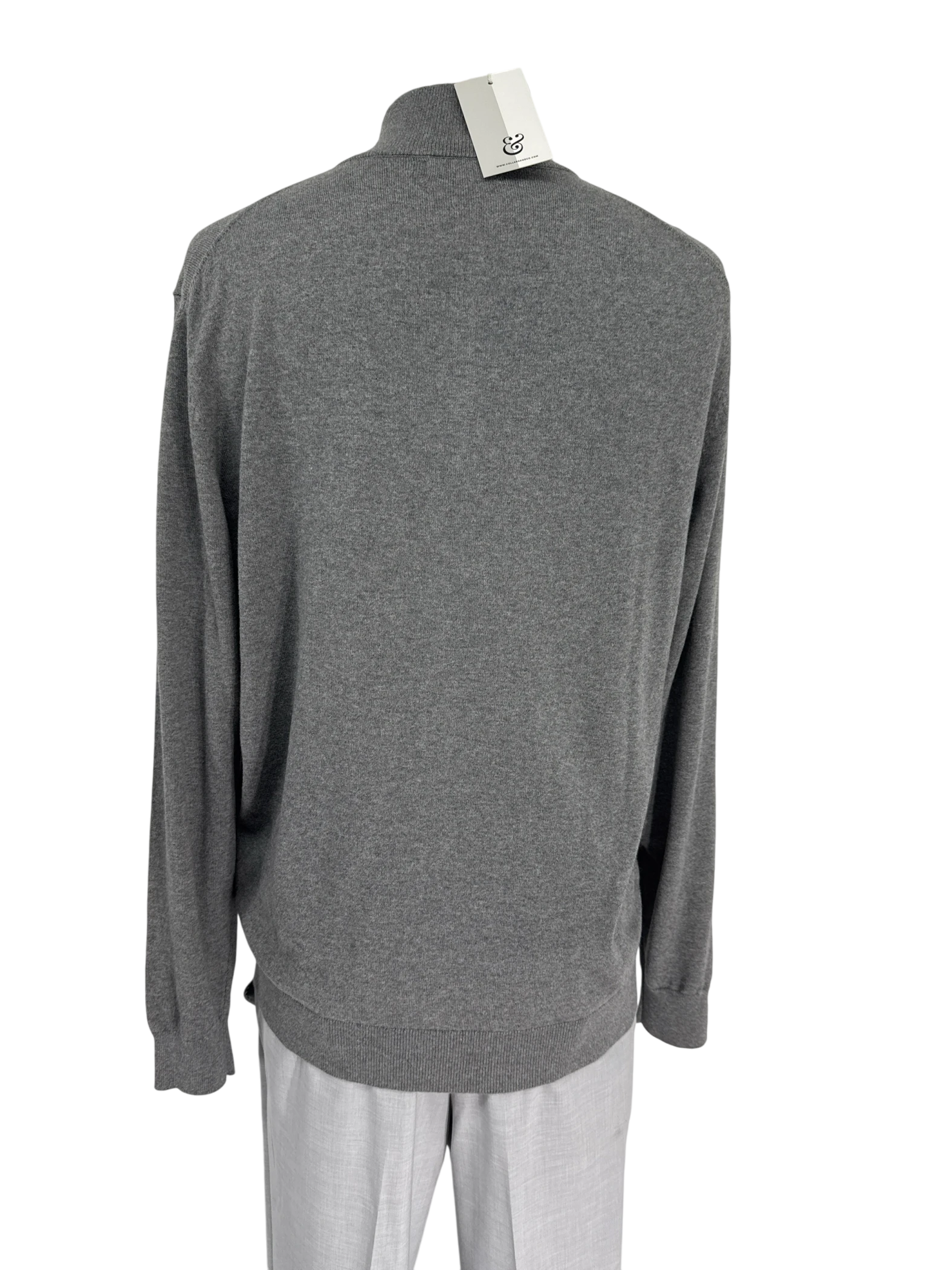 Elevate your wardrobe with this pre-owned Collars & Co. men's sweater. This stylish sweater features a sleek grey color, a comfortable mock neck, and a convenient zipper closure. Crafted from a luxurious blend of cotton and cashmere, it offers both warmth and sophistication. Perfect for cooler seasons, this sweater is a versatile addition to any man's collection. Ideal for casual outings or layering under a coat, it's a timeless piece that combines comfort and style.