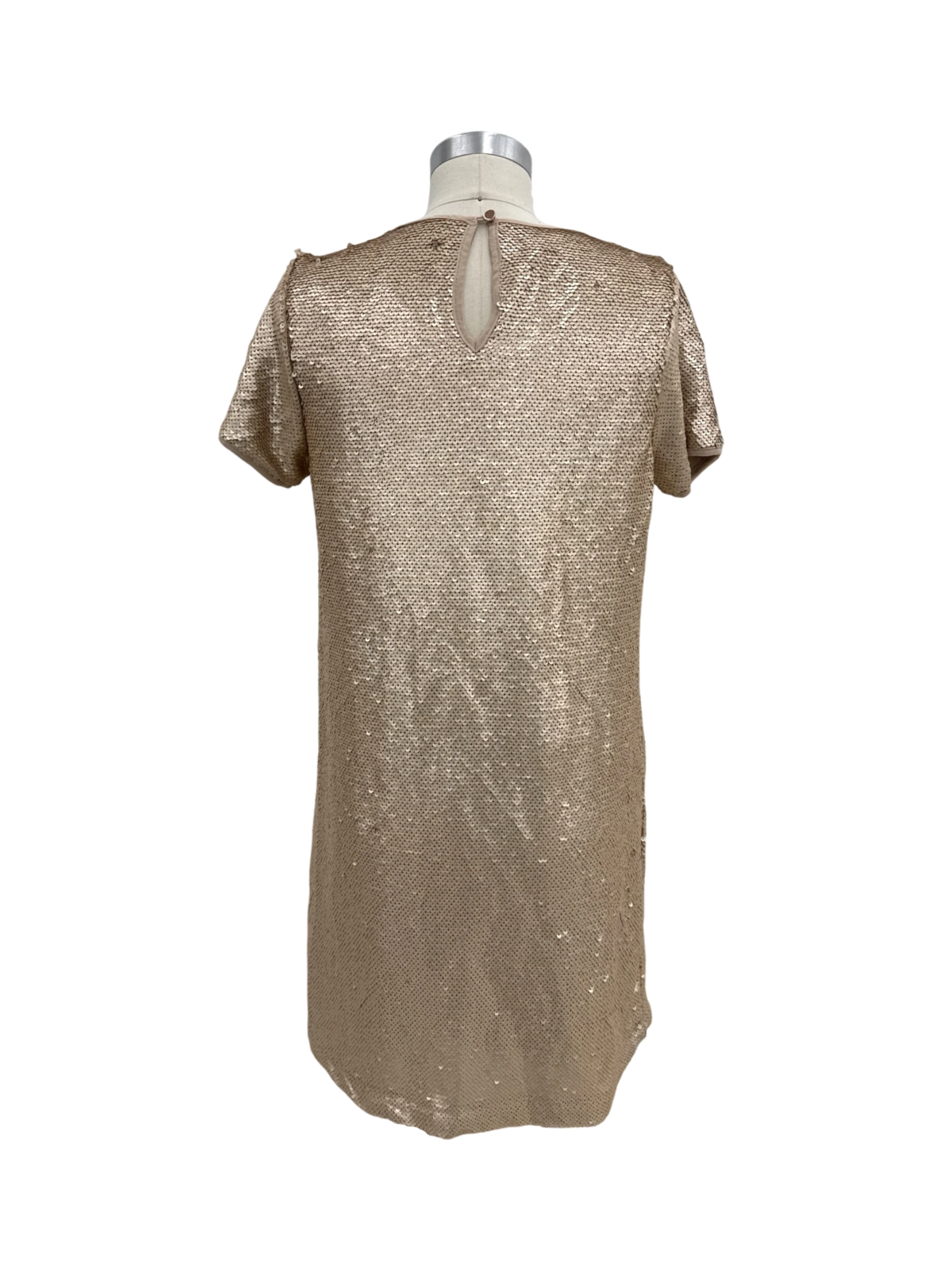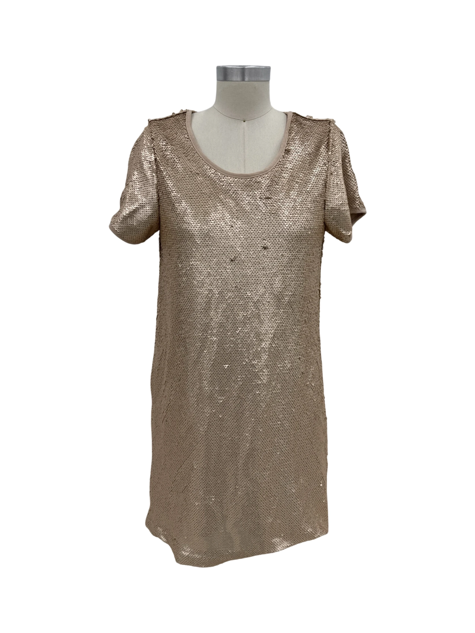 Elevate your evening wardrobe with this stunning Copper Key mini dress! This pre-owned sequin dress is perfect for parties or a night out. Its shimmering metallic gold finish and chic silhouette are sure to turn heads. Crafted from a comfortable polyester blend, this dress offers both style and comfort. A must-have piece for any fashion-forward woman's closet.