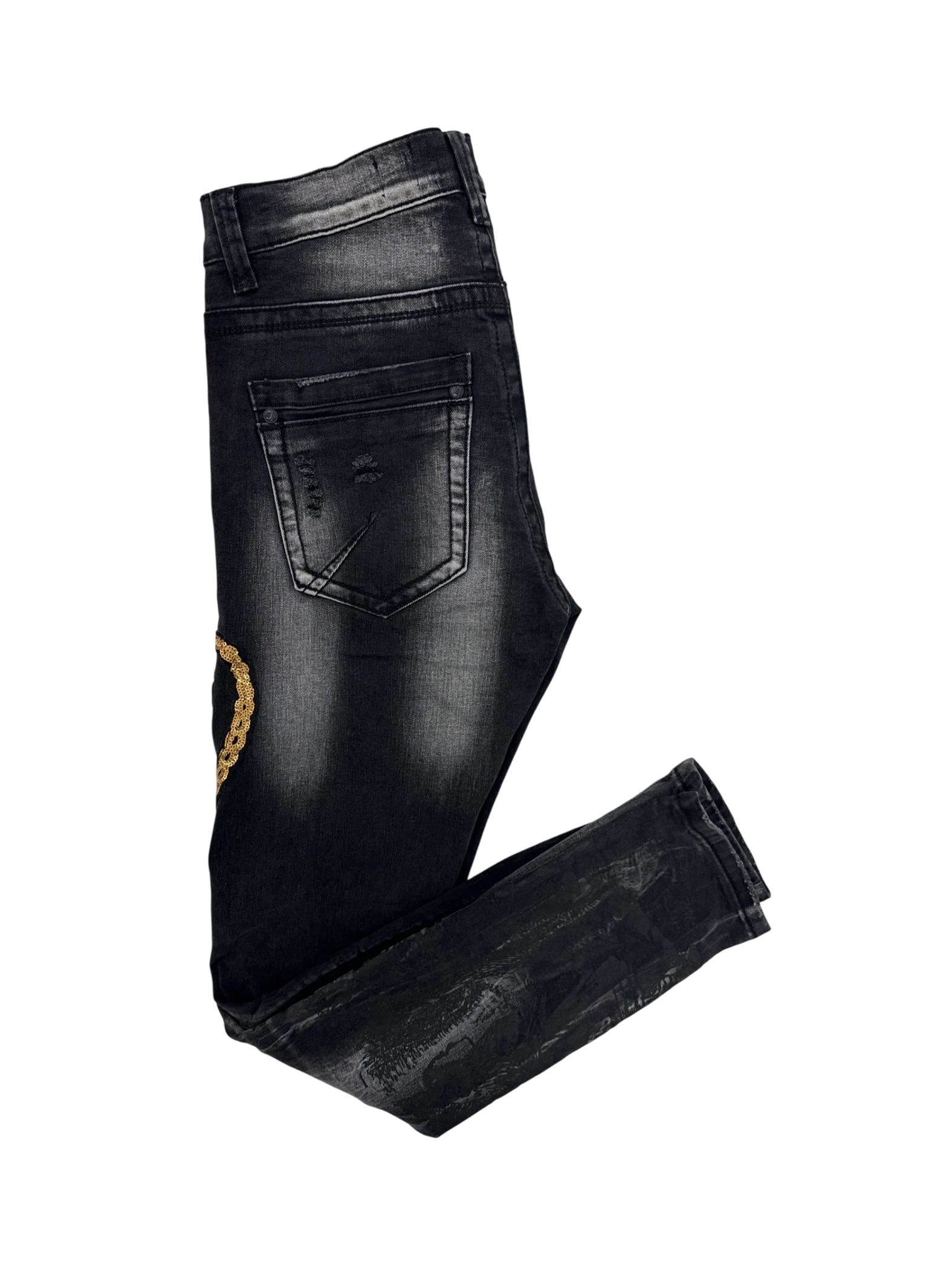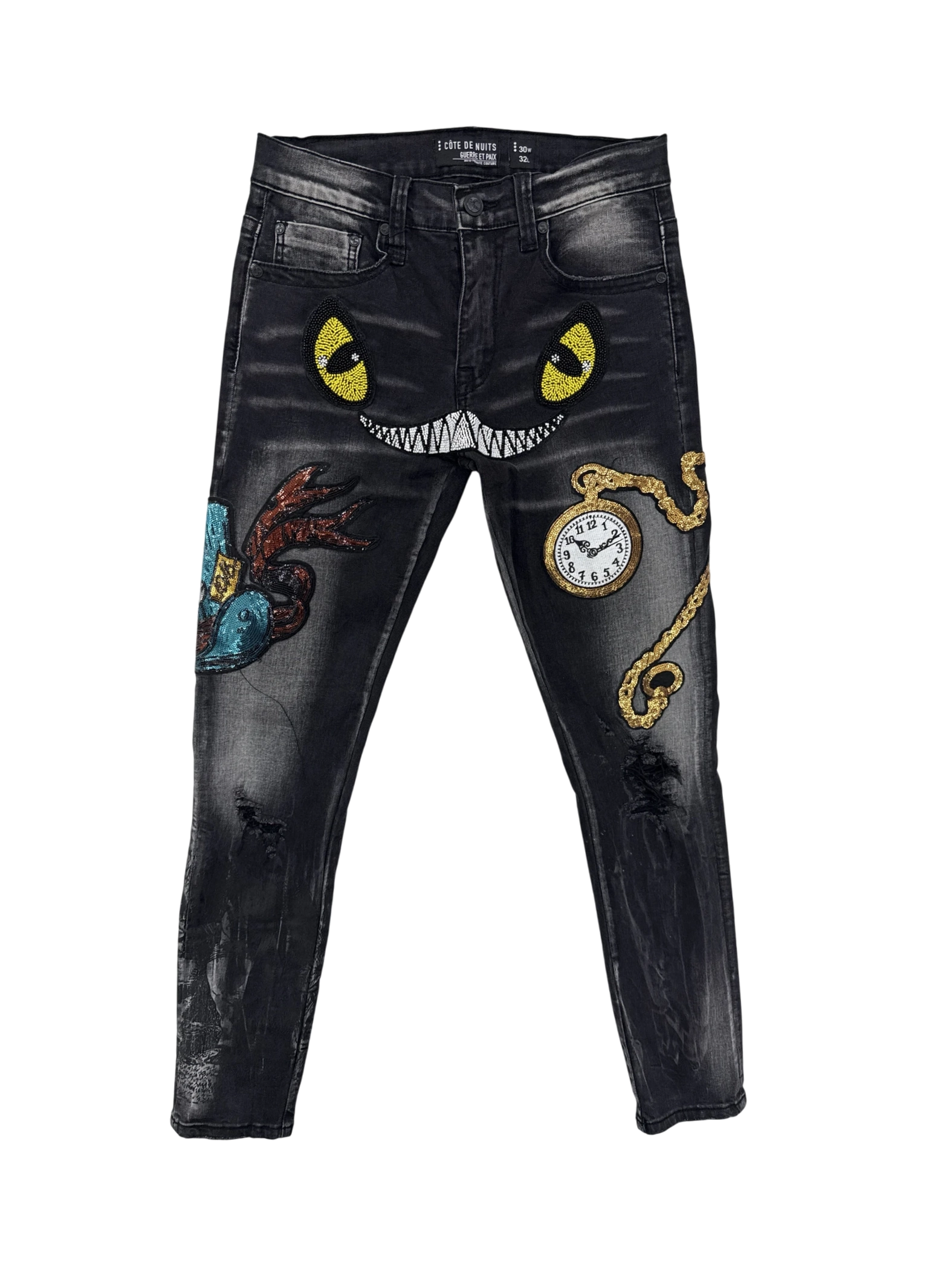 Elevate your denim game with these pre-owned COTE DE NUITS jeans. These black skinny-fit jeans are adorned with unique embellishments, including a whimsical cat design, a pocket watch and gold chains. Crafted from a comfortable cotton blend. The jeans feature a stylish skinny cut and a dark wash. Perfect for adding a touch of flair to your wardrobe. These eye-catching jeans are a statement piece, ideal for those who love unique fashion.