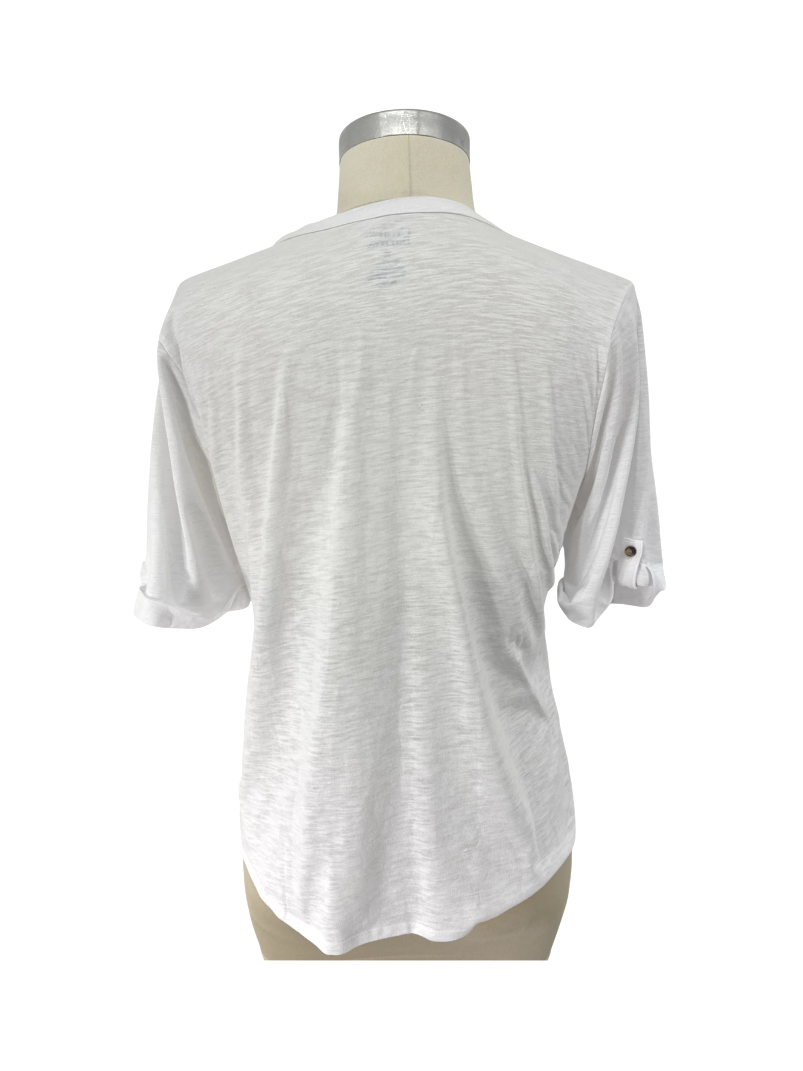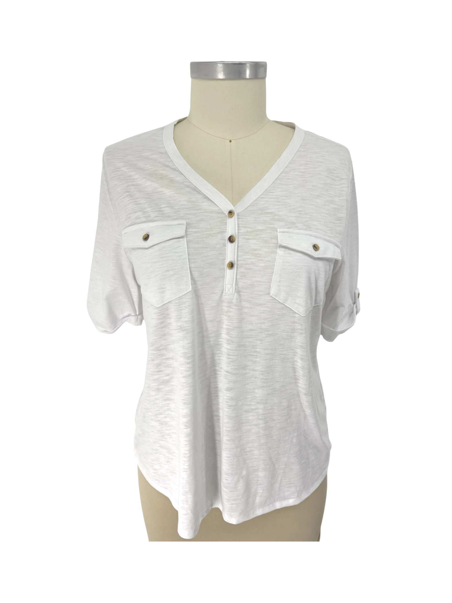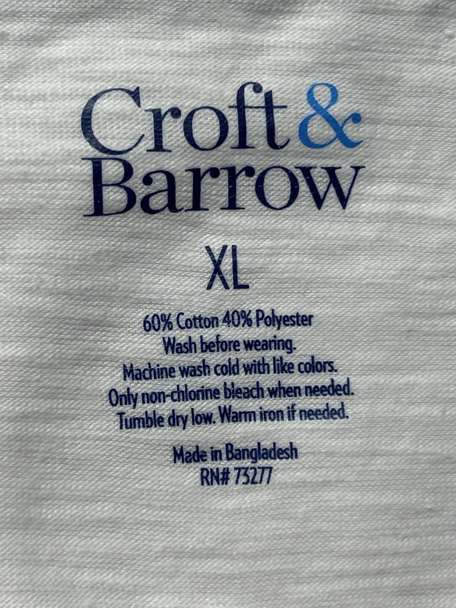 This pre-owned Croft & Barrow top is a perfect blend of comfort and style. Crafted from a soft cotton-polyester blend, it features a classic V-neck and practical pockets. The relaxed fit and versatile design make it ideal for everyday wear. The roll-tab sleeves add a touch of casual elegance, making this a timeless piece for your wardrobe. This stylish button up blouse is a must-have addition to your collection.