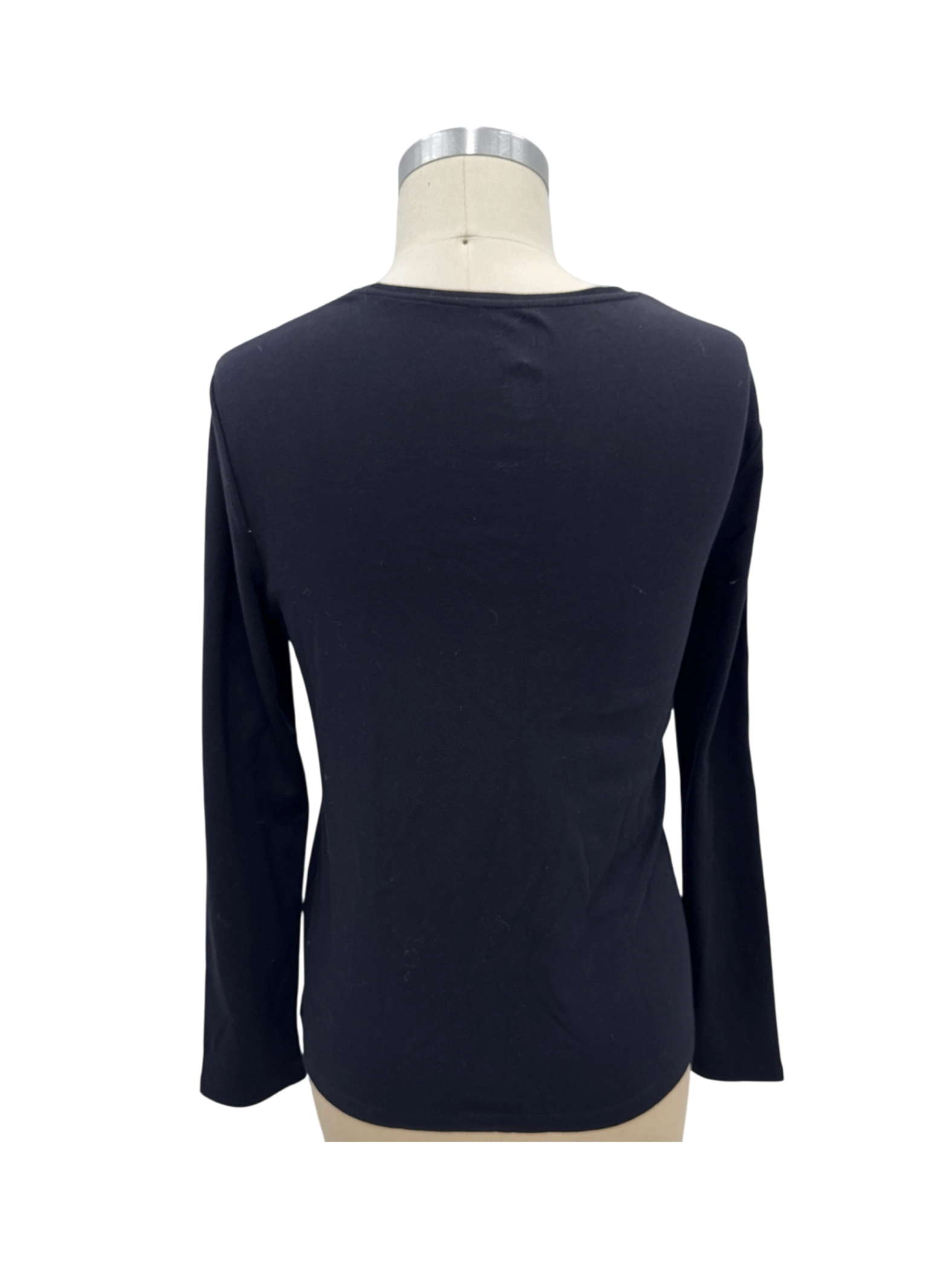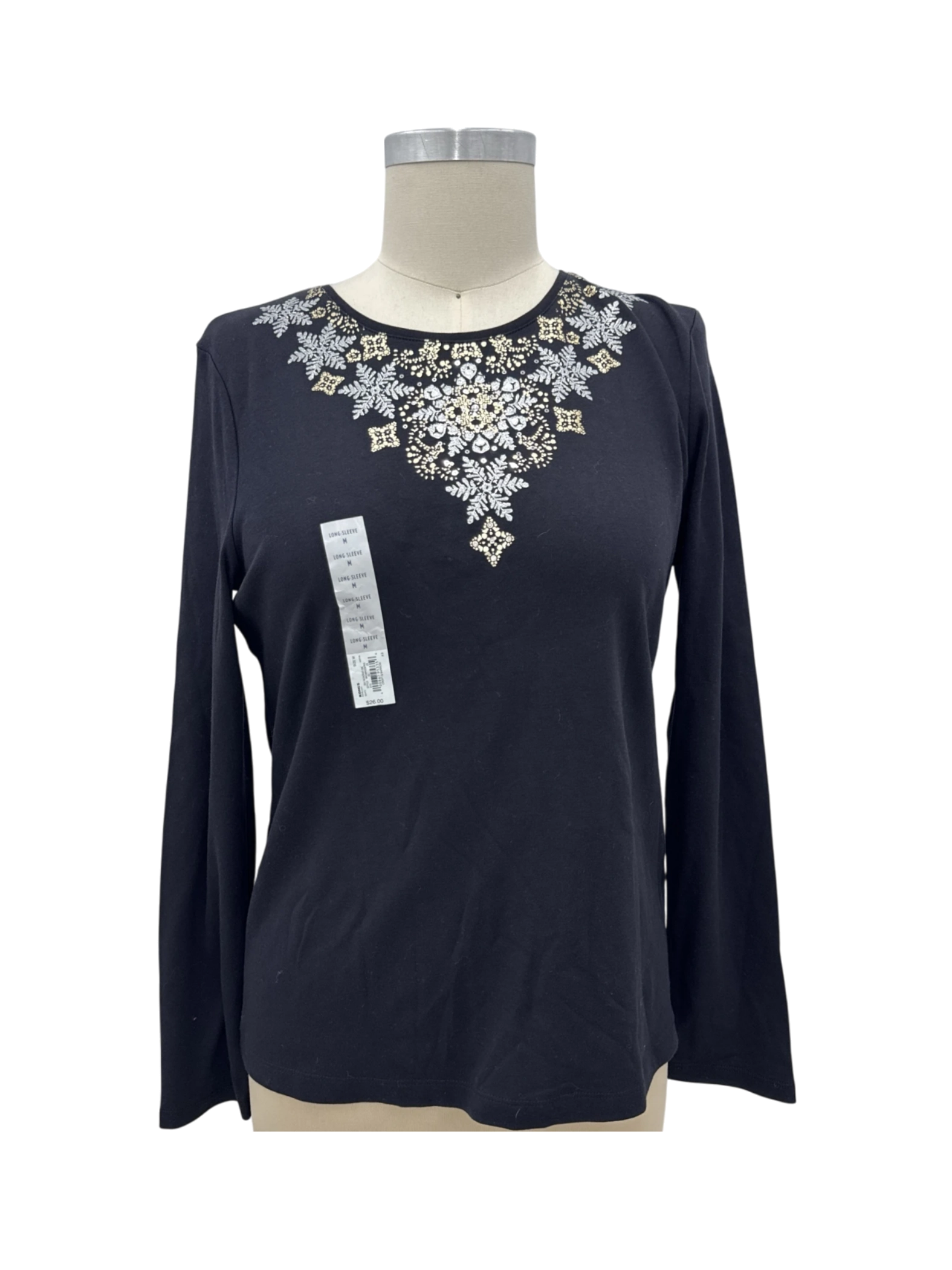 This elegant pre-owned Croft & Barrow top is a perfect addition to your wardrobe. Crafted from 100% cotton, this black long sleeve shirt features a stunning embroidered design with metallic accents on the neckline. The classic design and comfortable fabric make it ideal for casual wear, the top can be styled up or down. A versatile piece perfect for creating stylish outfits.